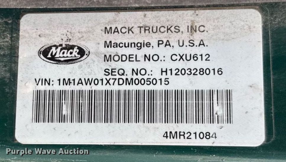 Purple Wave is selling a used Truck Tractor in Indiana. This item is a 2013 Mack CXU612 semi truck with the following: Miles: 924,664 on odometer, VIN: 1M1AW01X7DM005015
