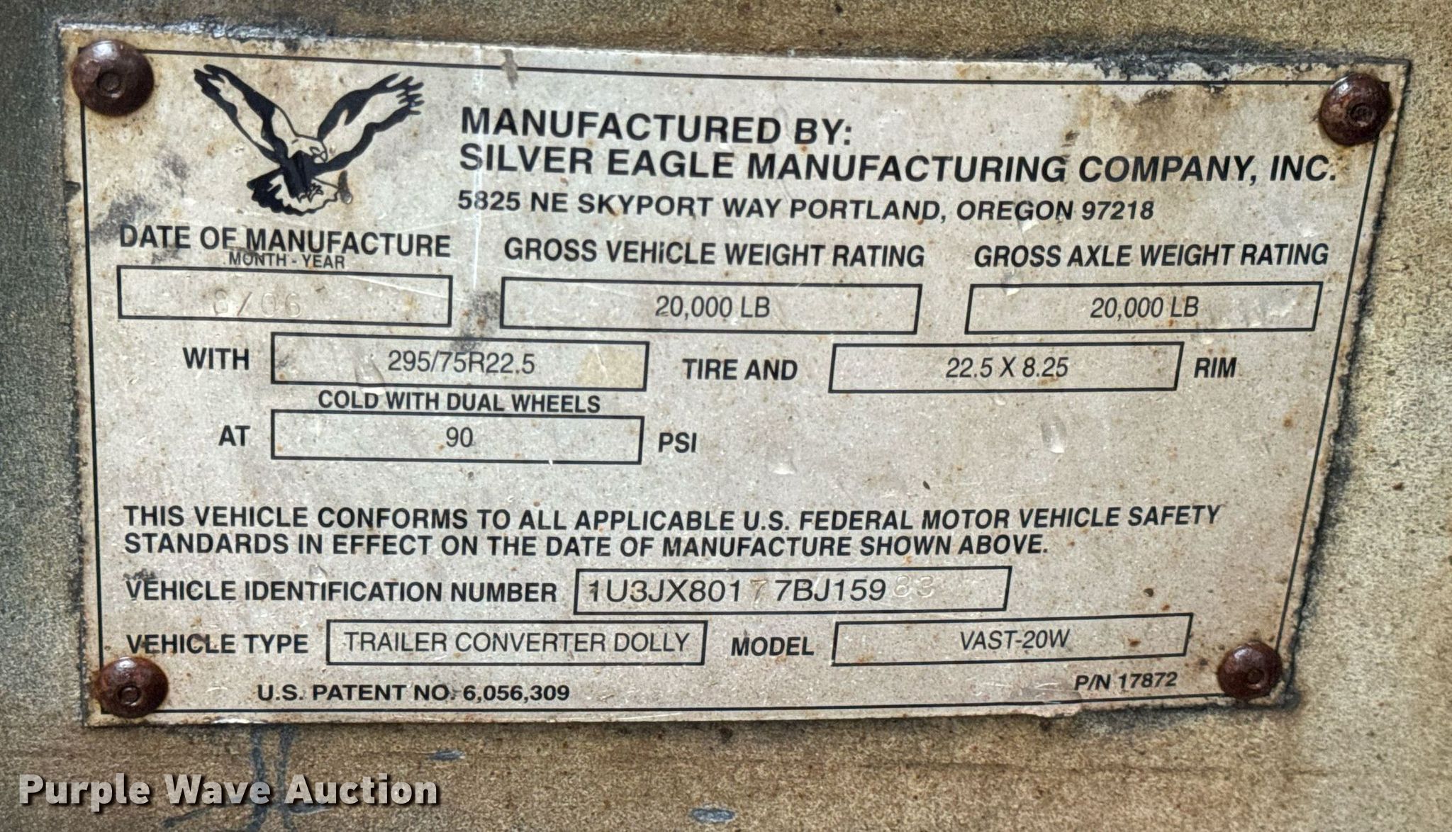 2004 Wabash DVDBHPC dry van trailer. VIN: 1JJV281WX4L890536. Dimensions Overall: 28' L x 102" W. Features Deck type: Wood, E-track rail system. Chassis Landing gear: Dual, Suspension: Spring, Brakes: Air, GVWR: 40,000 lbs, GAWR: 20,000 lbs. Tires Steel wheels, Size: 295/75R22.5. 2007 Silver Eagle VAST-20W dolly VIN: 1U3JX80177BJ159. Features GVWR: 20,000lbs. Tires Tires: 295/75R22.5. Notes Rear inner duals missing. Missouri title. Title has a lien that will be released following the close of the auction. Title distribution may be delayed up to 30 days from verification of funds. Hardy Holding Group. Boonville, MO 65233