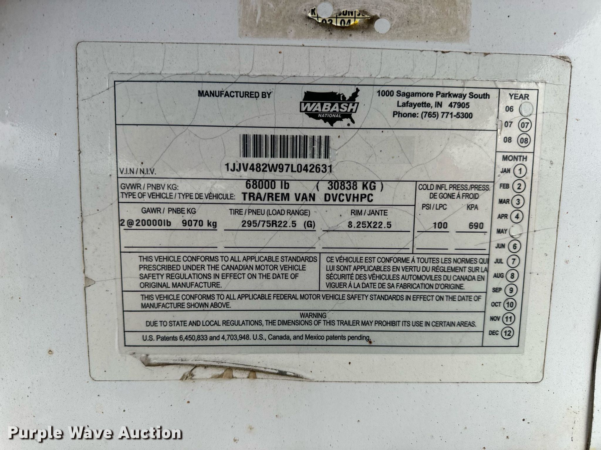 Purple Wave is selling a used Dry Van Trailer in Missouri. This item is a 2007 Wabash DVCVHPC dry van trailer with the following: VIN: 1JJV482W97L042631, Unit #: 5311
