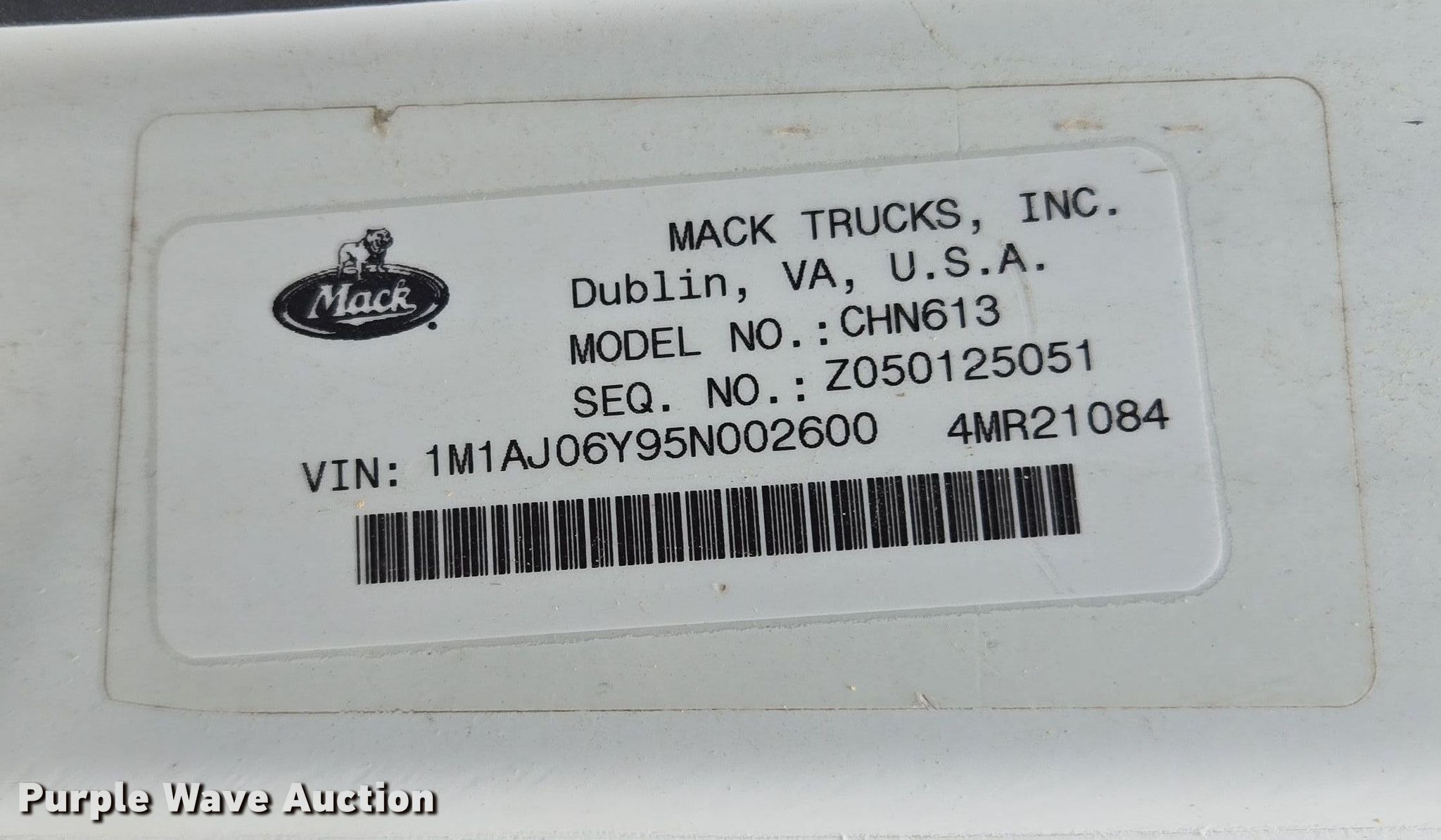 Purple Wave is selling a used Truck Tractor in Texas. This item is a 2005 Mack CHN613 semi truck with the following: Miles: Unknown, VIN: 1M1AJ06Y95N002600
