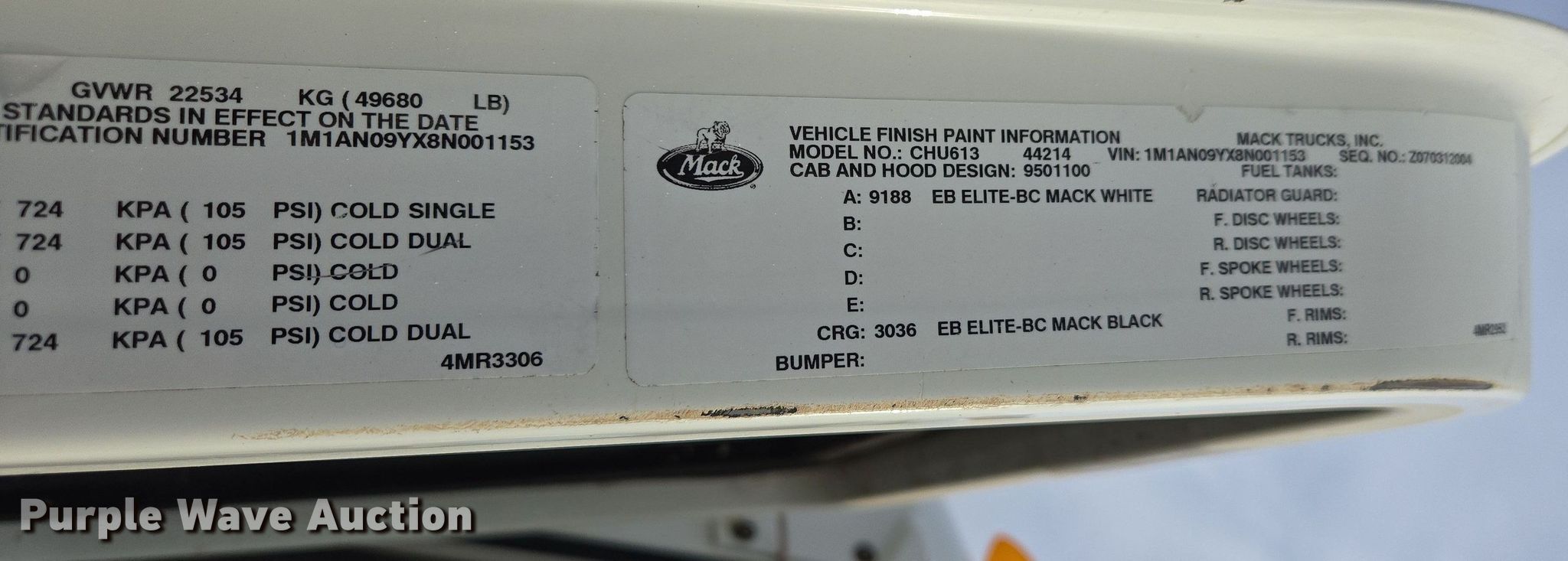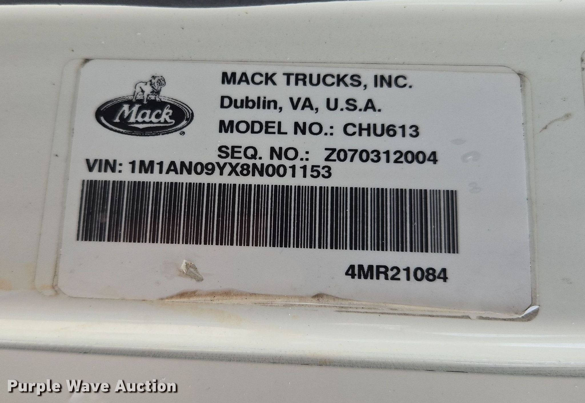 Purple Wave is selling a used Truck Tractor in Texas. This item is a 2008 Mack CHU613 semi truck with the following: Miles: 426,239 on odometer, VIN: 1M1AN09YX8N001153