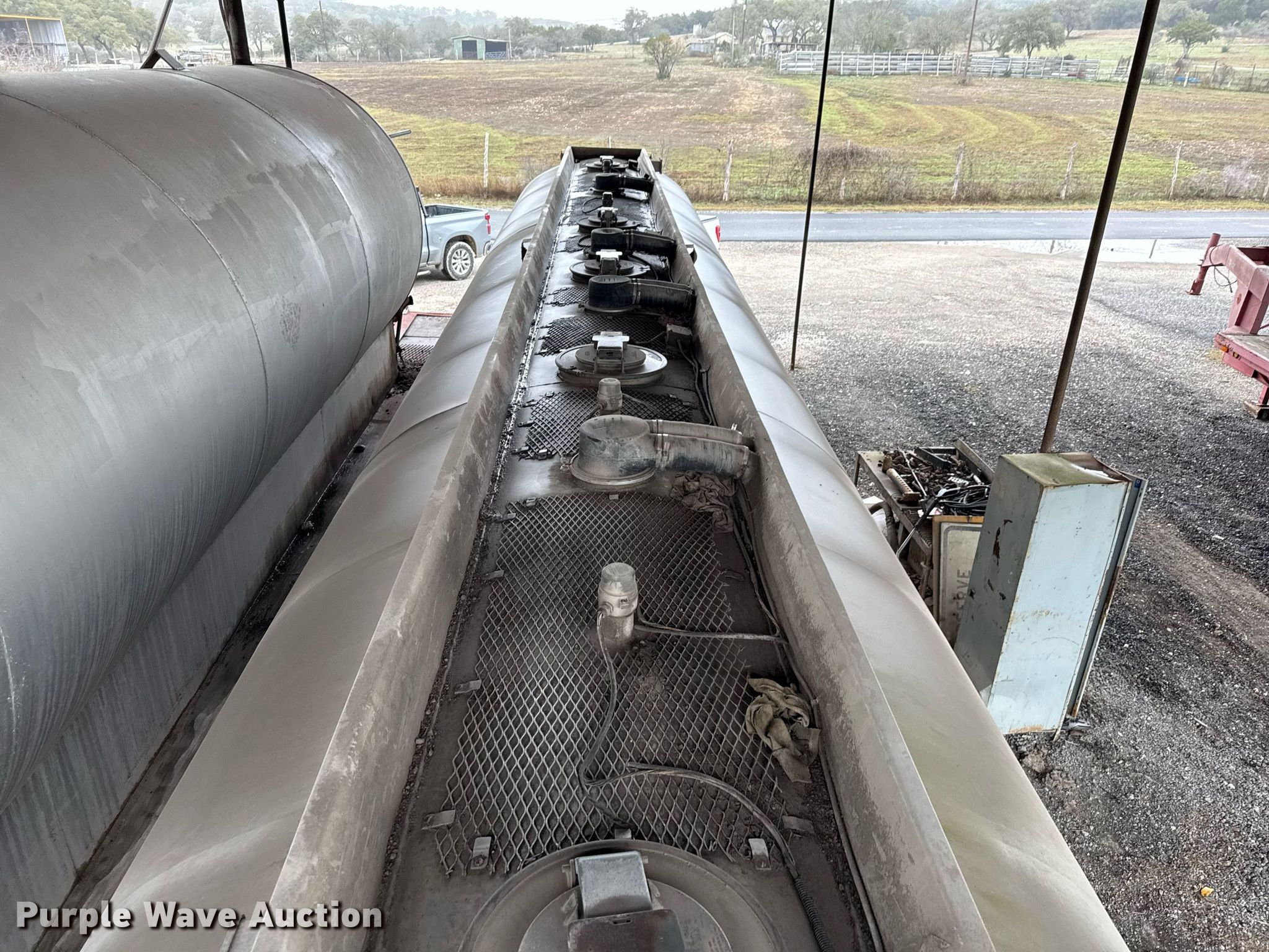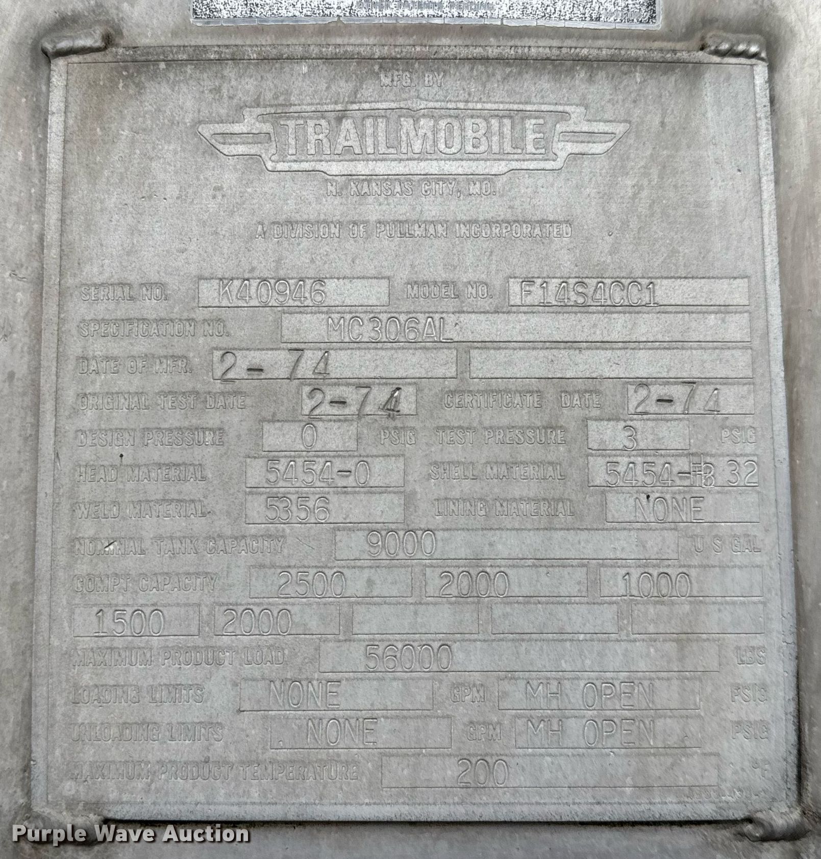 1974 Trailmobile F14S4CC1 tank trailer. VIN: K40946, Unit #: 4402. Dimensions Overall: 39' L x 96" W. Features Tank type: Aluminum Capacity: 9,000 gallons, Compartments: 5, Outlet valves: 5 Size: 3", No. of manways/manholes: 5 Width: 16", Full length walkway, Pump. Chassis Landing gear: Dual, Suspension: Spring, Brakes: Air, Axles: Tandem, GVWR: 65,770 lbs, GAWR: 19,040 lbs. Tires Steel wheels, Size: 11R22.5. Texas title. Title distribution may be delayed up to 14 days from verification of funds. HL Zumwalt Construction Inc.. Mico, TX 78056