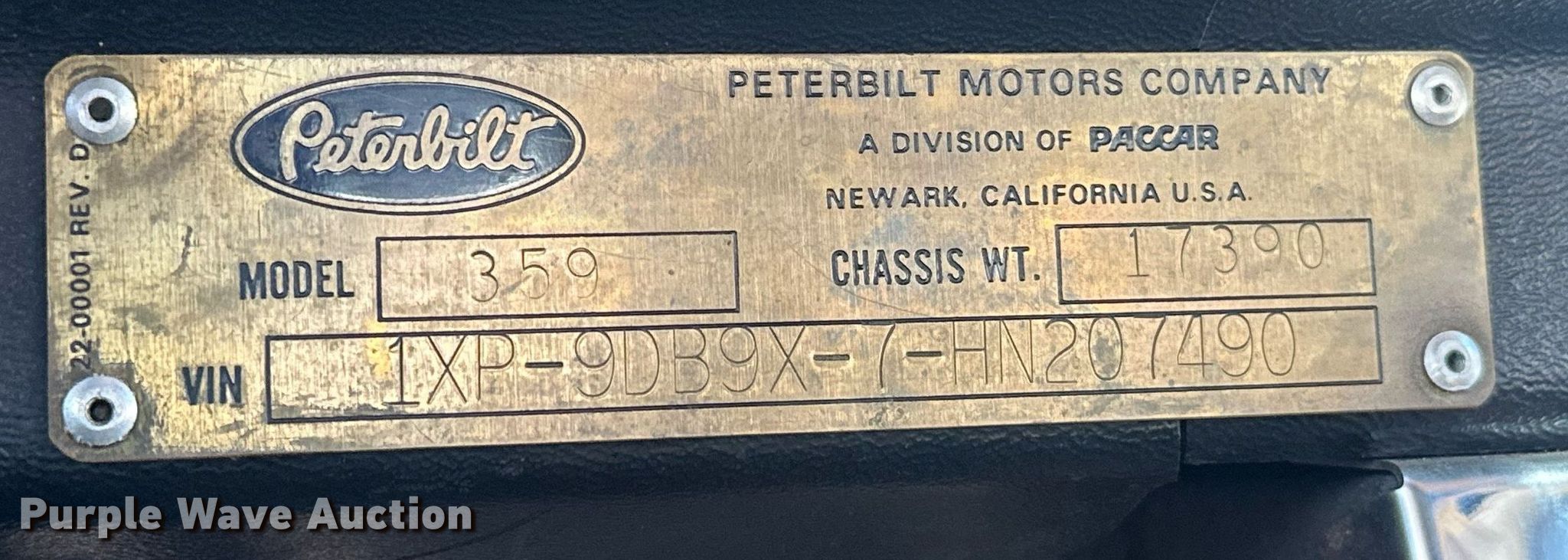 Purple Wave is selling a used Truck Tractor in Oklahoma. This item is a 1987 Peterbilt 359 semi truck with the following: Miles: 169,782 on odometer, VIN: 1XP9DB9X7HN207490