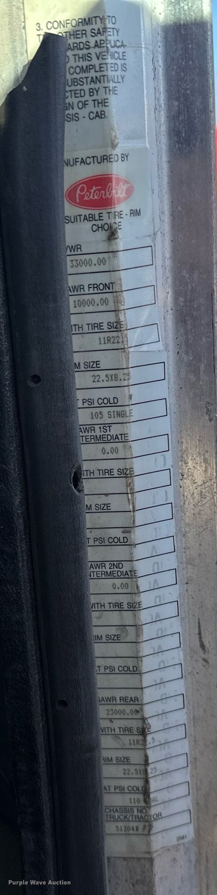 2000 Peterbilt 330 truck cab and chassis. Miles: 323,367 on odometer, Hours: 10,291 on meter, Miles: Unknown, VIN: 1NPNHD7X6YS512041. Engine Caterpillar 3126, Serial: 7AS74341, Displacement: 7.2L, Cylinders: 6, Fuel type: Diesel, HP: 303, kW: 226, Engine brake. Transmission Eaton Fuller, Manual. Chassis Axles: Single, Suspension: Air Dump valves, Brakes: Air, GVWR: 33,000 lbs FAWR: 10,000 lbs, RAWR: 23,000 lbs. Interior AC, Heat, Heated mirrors, Cruise control. Features Fuel tank: Single, Hitch: Gooseneck. Tires Size: 11R22.5. Notes Windshield chipped or cracked, Non-operational rpm gauge, Non-operational odometer. Oklahoma title. Title distribution may be delayed up to 30 days from verification of funds. Guthrie, OK 73044
