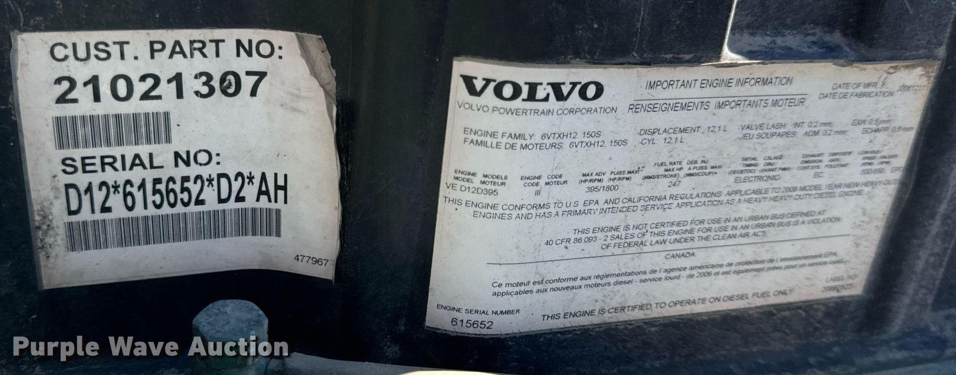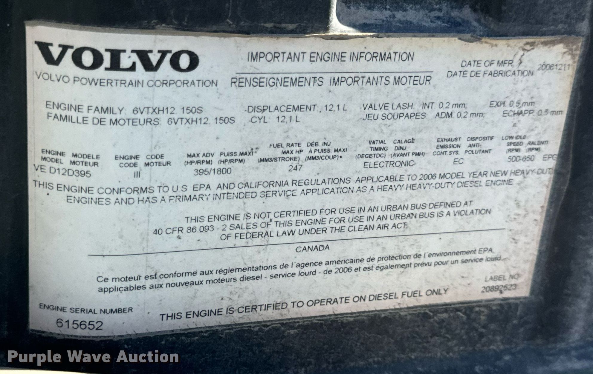 Volvo VED12D395 engine. Serial: 615652, Displacement: 12.1L, Cylinders: 6, Fuel type: Diesel, HP: 395. Transmission Eaton Fuller Roadranger, Manual, Speed: 10. T&R Equipment. New Bloomfield, MO 65080