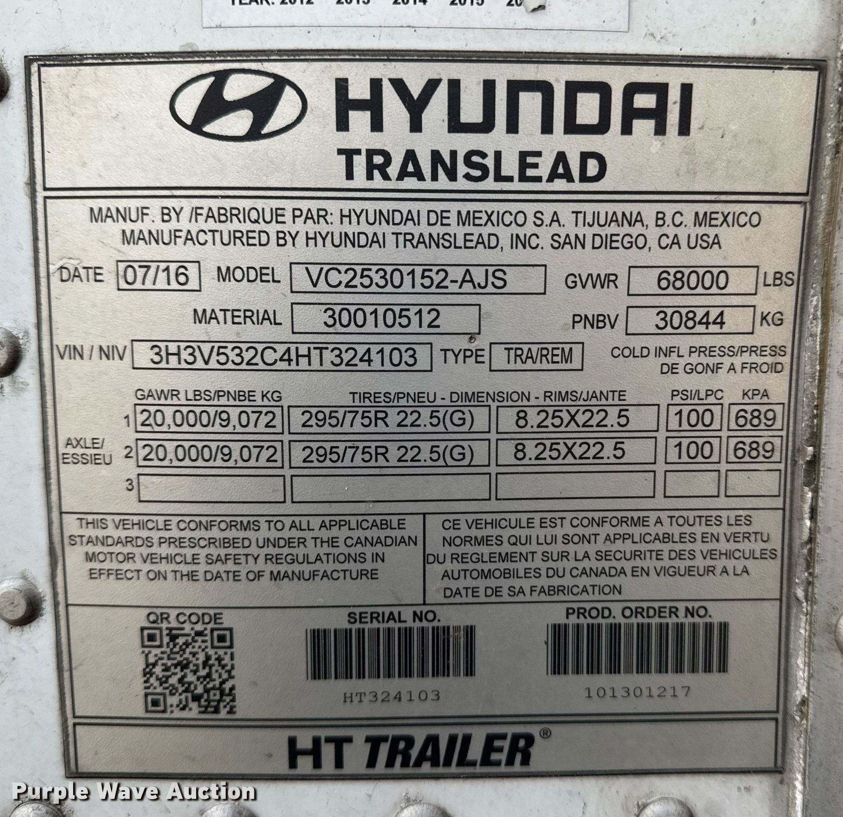 2017 Hyundai Translead VC2530152-AJS dry van trailer. VIN: 3H3V532C4HT324103, Unit: 69344474. Dimensions Overall: 53' L x 102' W. Features Deck type: Wood. Chassis Landing gear: Dual, Suspension: Air, Brakes: Air, Axles: Tandem Sliding, GVWR: 68,000 lbs, GAWR: 20,000 lbs. Tires Steel wheels, Size: 295/75R22.5. Notes Roof damage, Front axle damage, Front axle wheels missing, Contents included. Insurance salvage, stored at a secured facility. Please review REQUIRED REMOVAL INSTRUCTIONS. Titles will be distributed after confirmation of payment and removal. California salvage title. Title distribution may be delayed up to 30 days from verification of funds. Insurance Salvage. Perris, CA 92571
