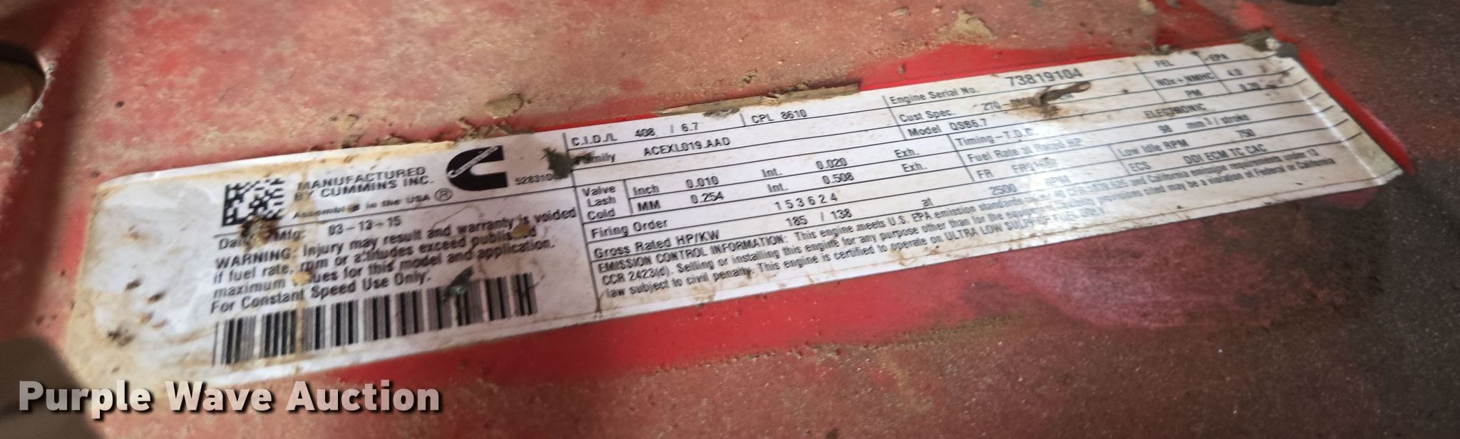 2015 ShuttleWagon SWX315 railcar mover. Engine hours: 15,284 on meter, VIN: 31515059. Engine Cummins, Serial: 73819104, Displacement: 6.7L, Cylinders: 6, Fuel type: Diesel, HP: 185, kW: 138. Transmission Automatic. Chassis Hi-rail system, Axles: Single, Brakes: Air. Interior AC, Heat. Tires Size: 315/80R22.5. Notes Unknown operating condition of hydraulics. Eagle Railcar Services. Elkhart, TX 75839