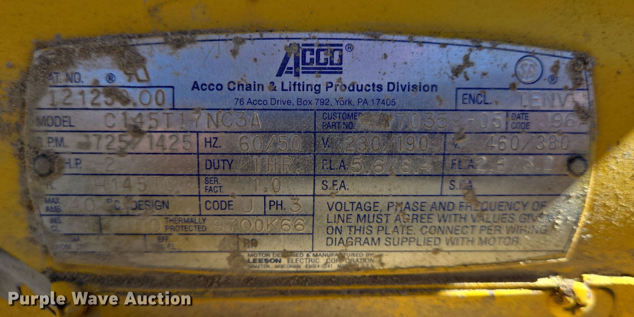 Acco Wright Speedway hoist. Electric Motor. Acco C145T17NC3A, HP: 2, Volts: 460/380, Phase: Three. Notes Unknown operating condition. Aggregate Technologies Inc. Houston, TX 77070