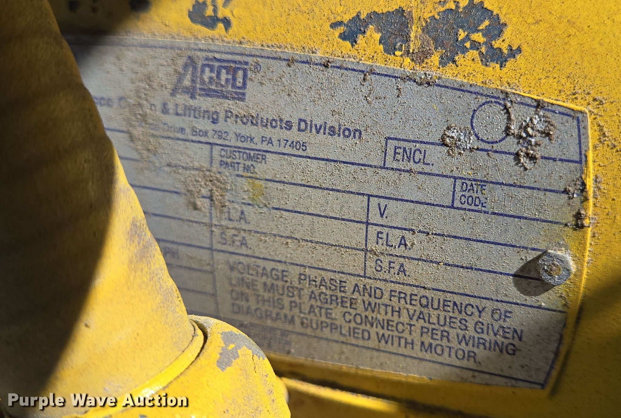 Acco Wright Speedway hoist. Electric Motor. Acco, HP: 2, Volts: 460/380, Phase: Three. Notes Unknown operating condition. Aggregate Technologies Inc. Houston, TX 77070