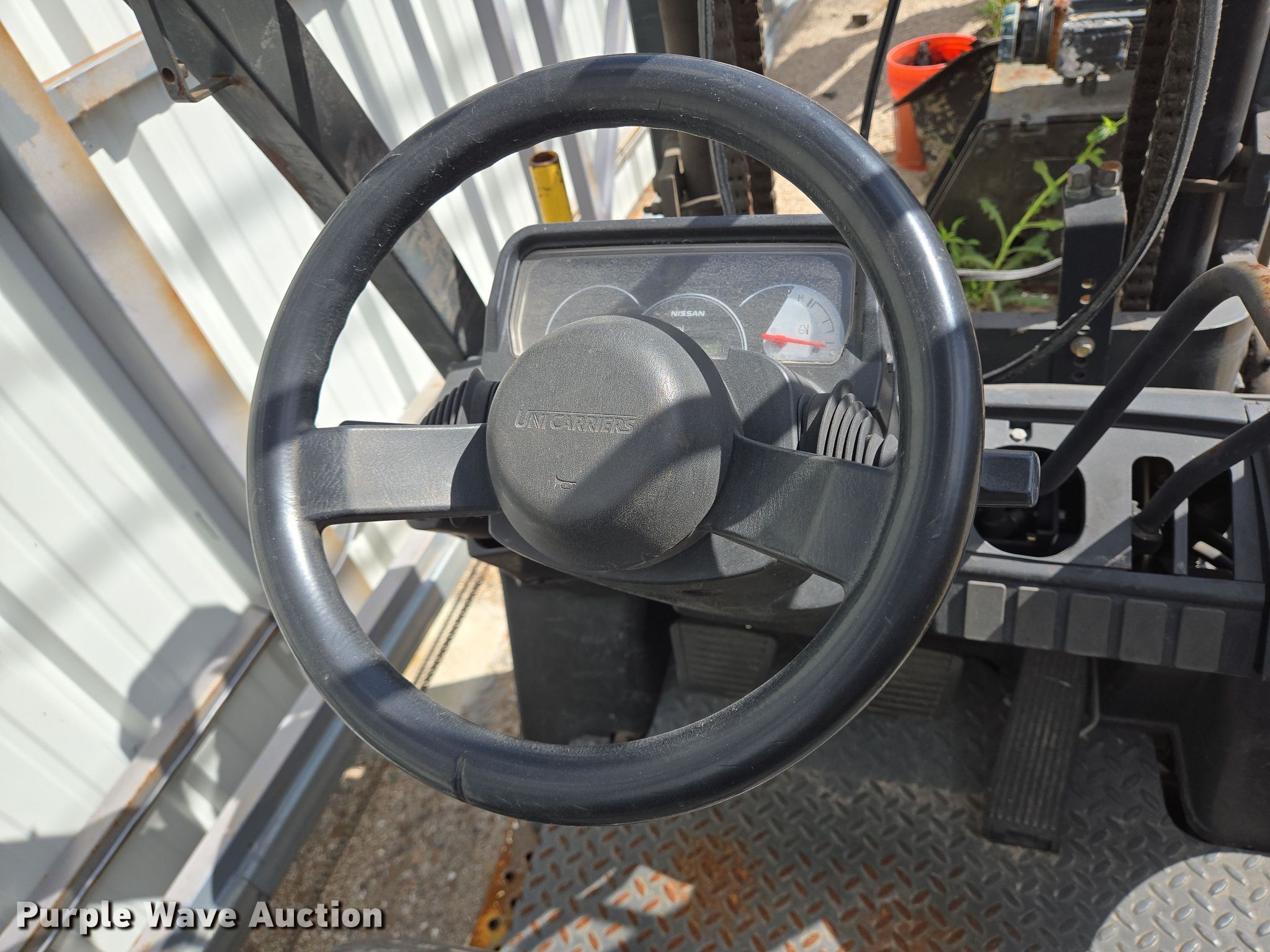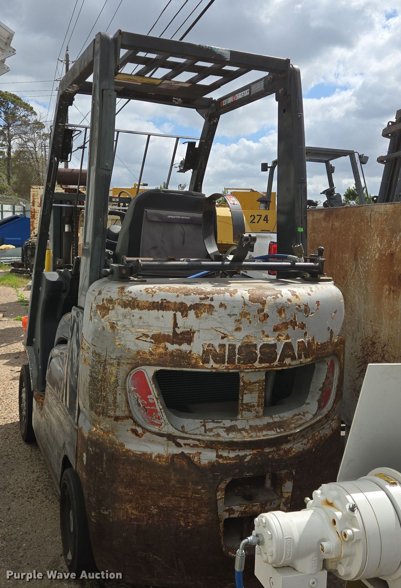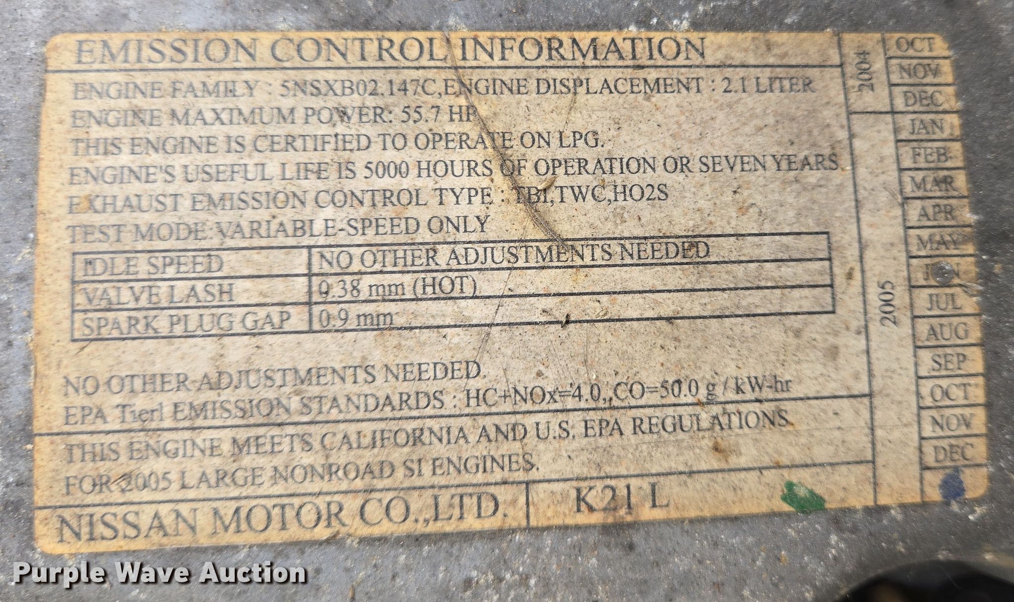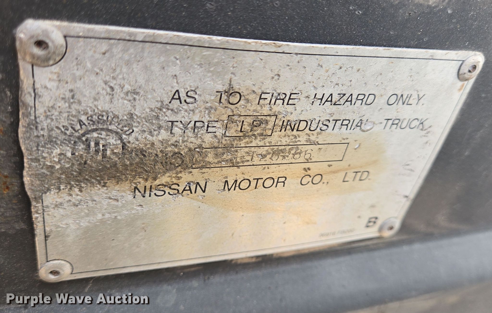 Nissan forklift. Hours: Unknown. Engine Nissan, Displacement: 2.1L, Cylinders: 4, Fuel type: LPG LP bottle: Not included. Transmission Powershift. Operators station Canopy. Features Mast stages: 2, Mast tilt, Fork length: 43". Tires Rear: 16.25x6x11.25, Solid. Notes Non-operational propane mixer, needs replaced , Non-operational unit. LAC Services. Channelview, TX 77530