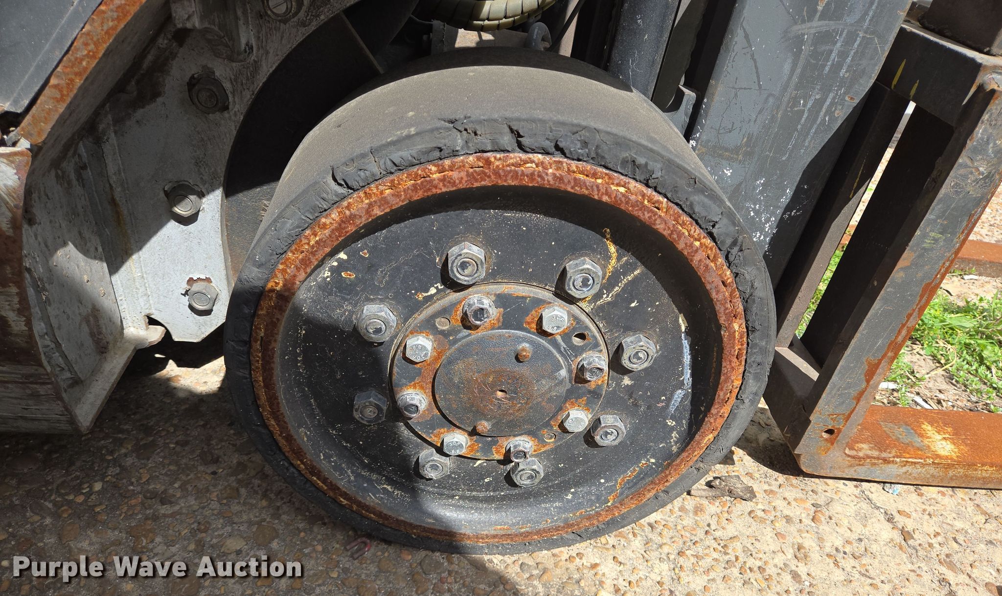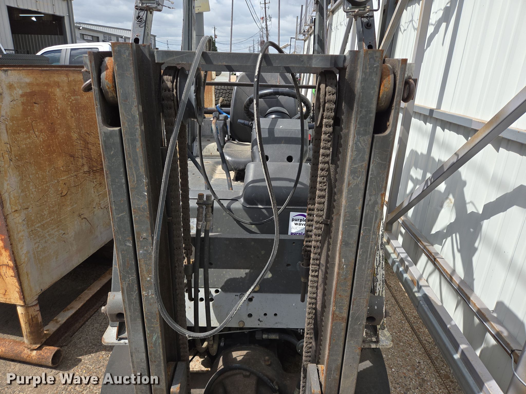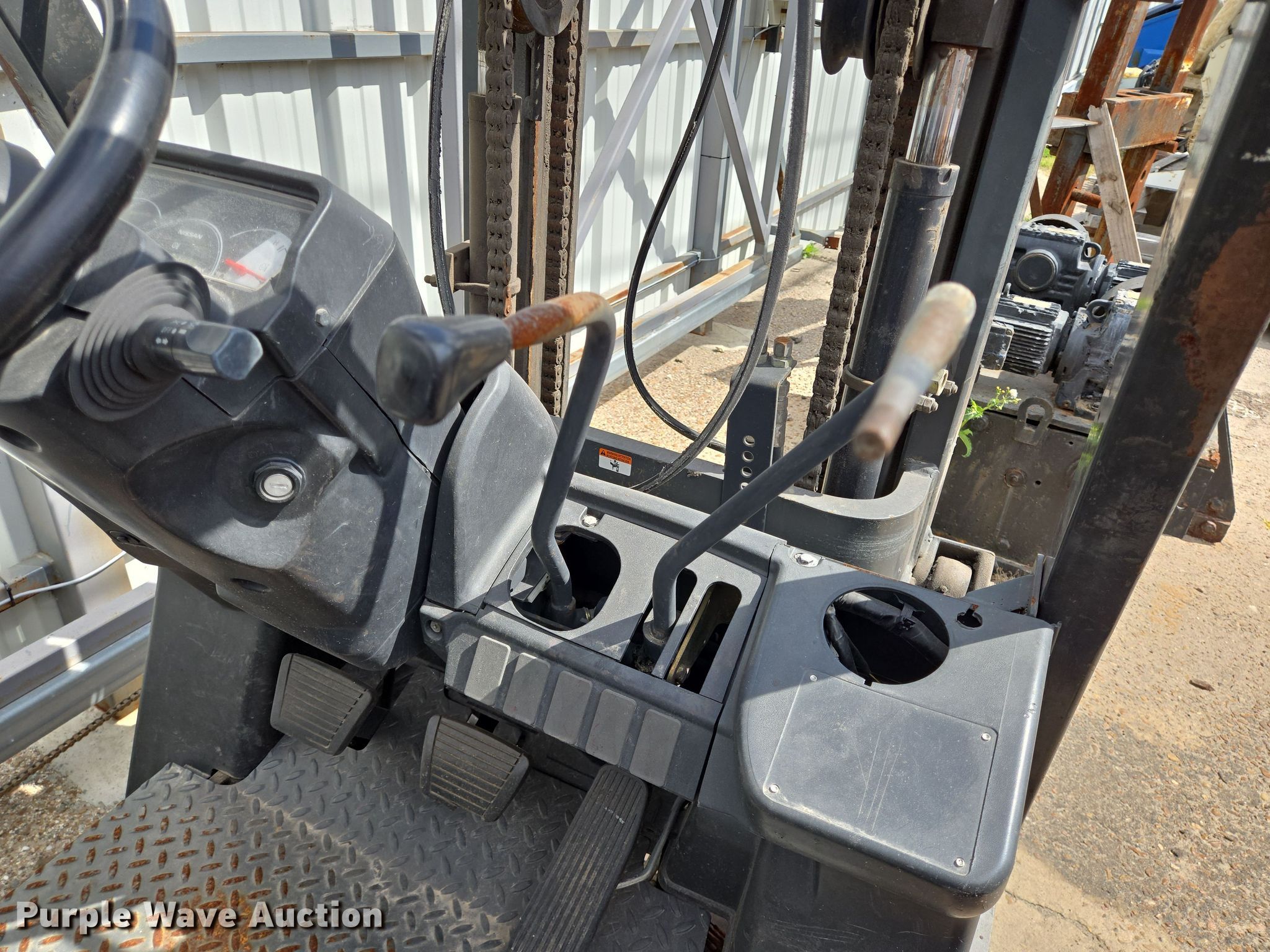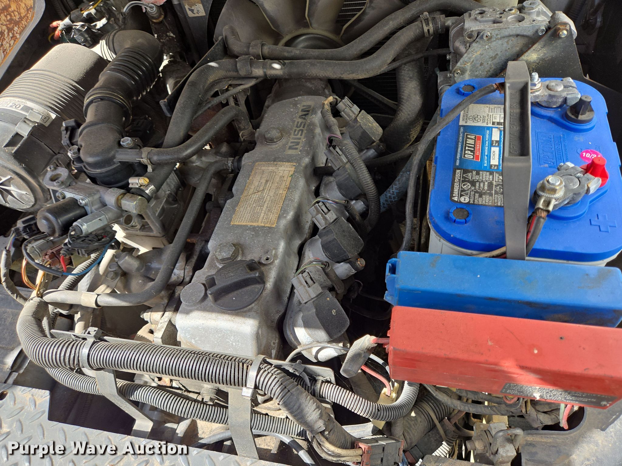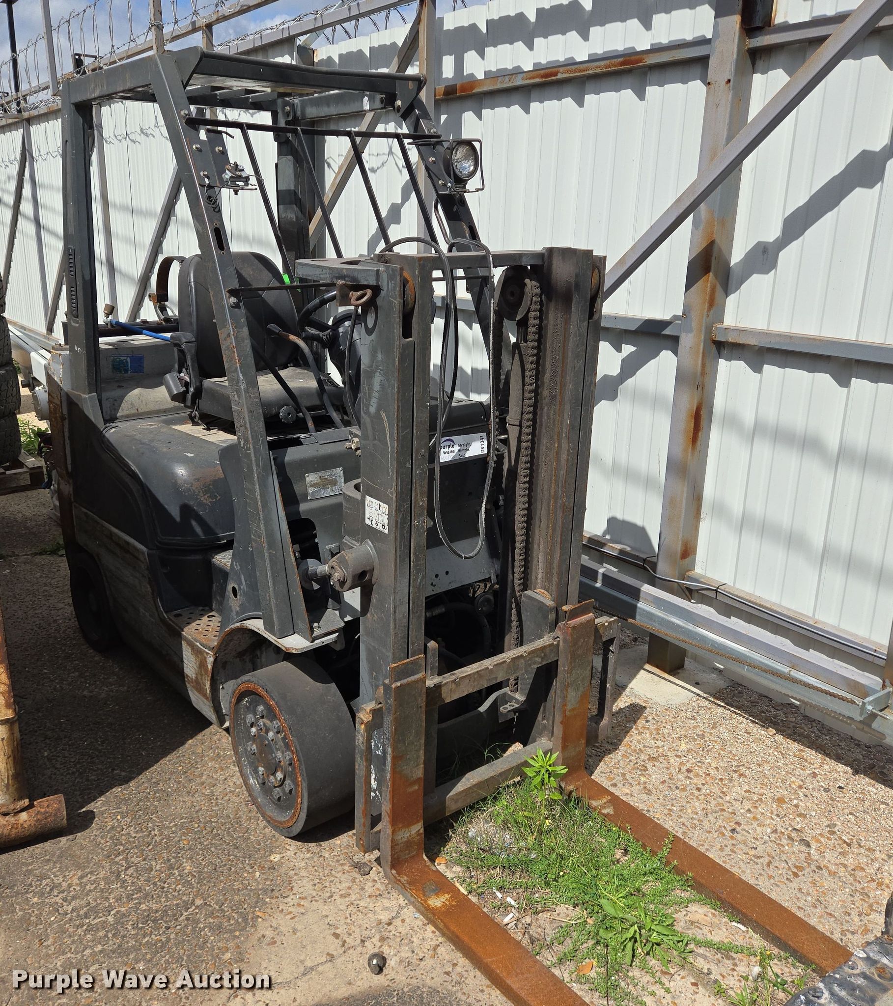 Nissan forklift. Hours: Unknown. Engine Nissan, Displacement: 2.1L, Cylinders: 4, Fuel type: LPG LP bottle: Not included. Transmission Powershift. Operators station Canopy. Features Mast stages: 2, Mast tilt, Fork length: 43". Tires Rear: 16.25x6x11.25, Solid. Notes Non-operational propane mixer, needs replaced , Non-operational unit. LAC Services. Channelview, TX 77530