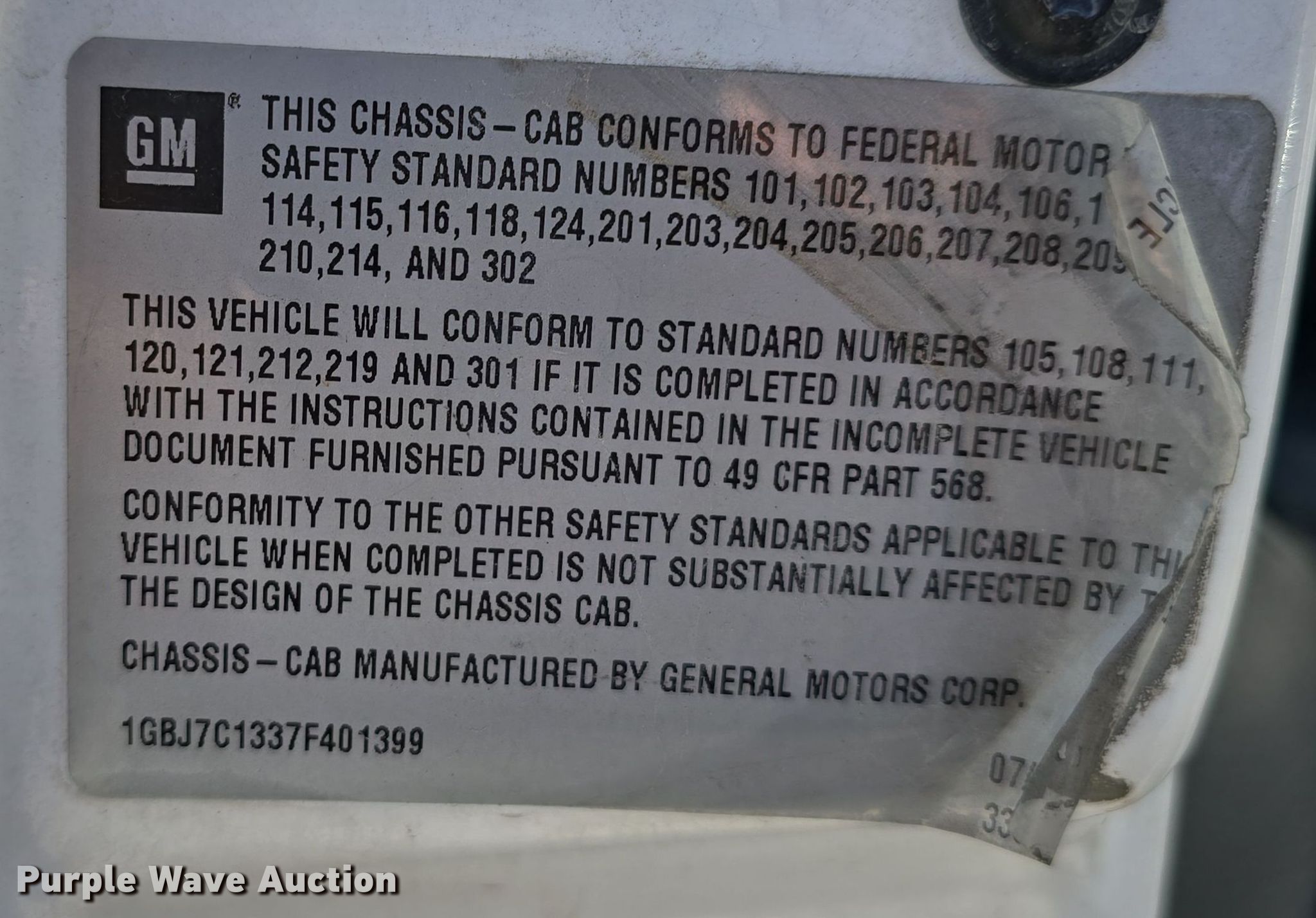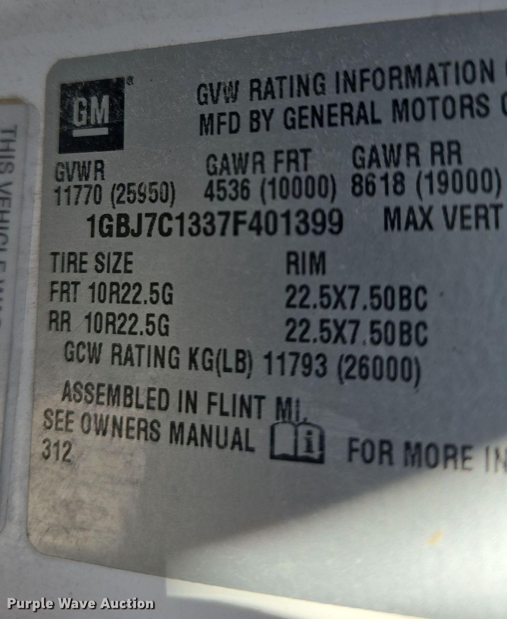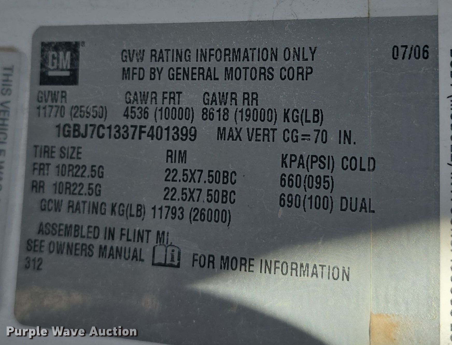 2007 Chevrolet C7500 delivery truck. Miles: 247,558 on odometer, VIN: 1GBJ7C1337F401399. Engine Displacement: 7.8L, Cylinders: 6, Fuel type: Diesel. Transmission Automatic. Chassis Axles: Single, Suspension: Air, Brakes: Air, GVWR: 25,950 lbs, Wheelbase: 238". Interior AC, Heat, Heated mirrors, Power windows, Power locks, Cruise control. Features Box bed LDV, Serial: 1000112570, 22' 6" L x 96" W x 84" H, Floor: Wood, End gate lift, Capacity: 2,000 lbs. Tires Size: 10R22.5. Notes Windshield chipped or cracked, Dead battery. Title distribution may be delayed up to 14 days from verification of funds. Omaha, NE 68127