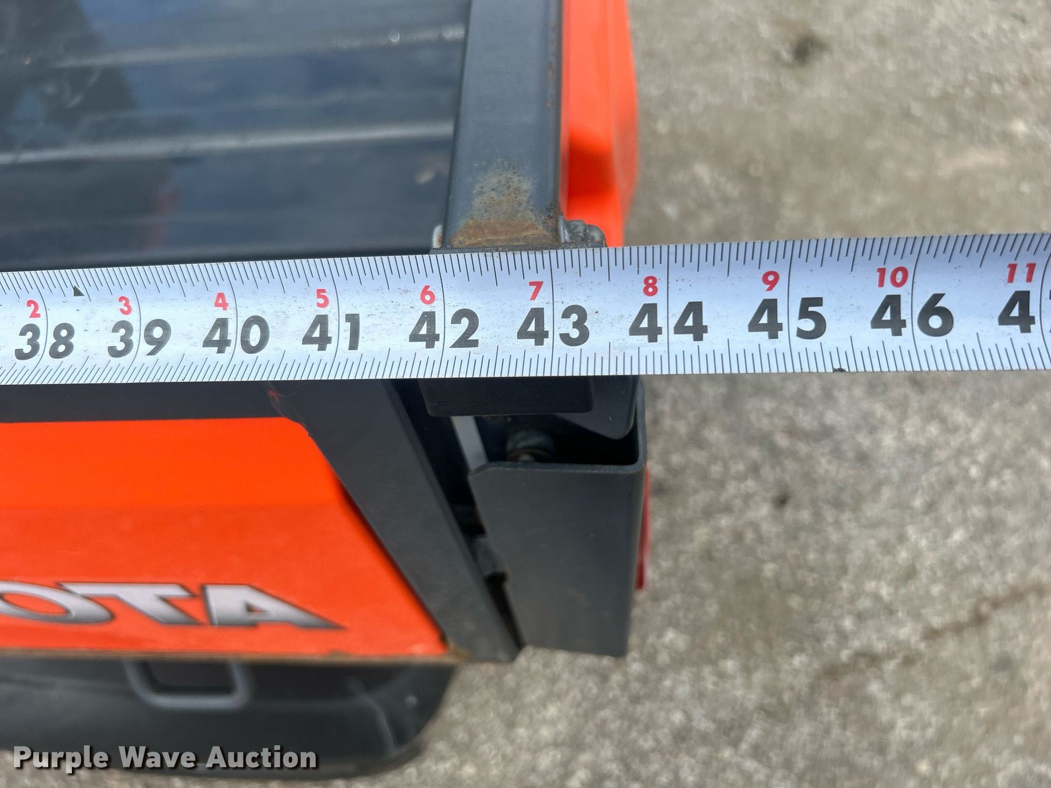 2019 Kubota RTV-X1100C utility vehicle. Miles: 68,666 on odometer, VIN: A5KC2GDBCJG047127, Serial: 47127. Engine Kubota D1105, Displacement: 1.1L, Cylinders: 3, Fuel type: Diesel, Electric start. Transmission Automatic. Chassis Four wheel drive/ All wheel drive. Operators station Enclosed cab, AC, Heat. Features Dump bed 43" L x 60" W, Dump bed type: Electric/ Hydraulic, Grille guard. Tires Size: 25x10.00-12 NHS. Oklahoma title. Seller is an Oklahoma licensed motor vehicle dealer. Title will be assigned and distributed by the dealer. Please contact the seller for distribution questions. Title distribution may be delayed up to 30 days from verification of funds. Collinsville, OK 74021