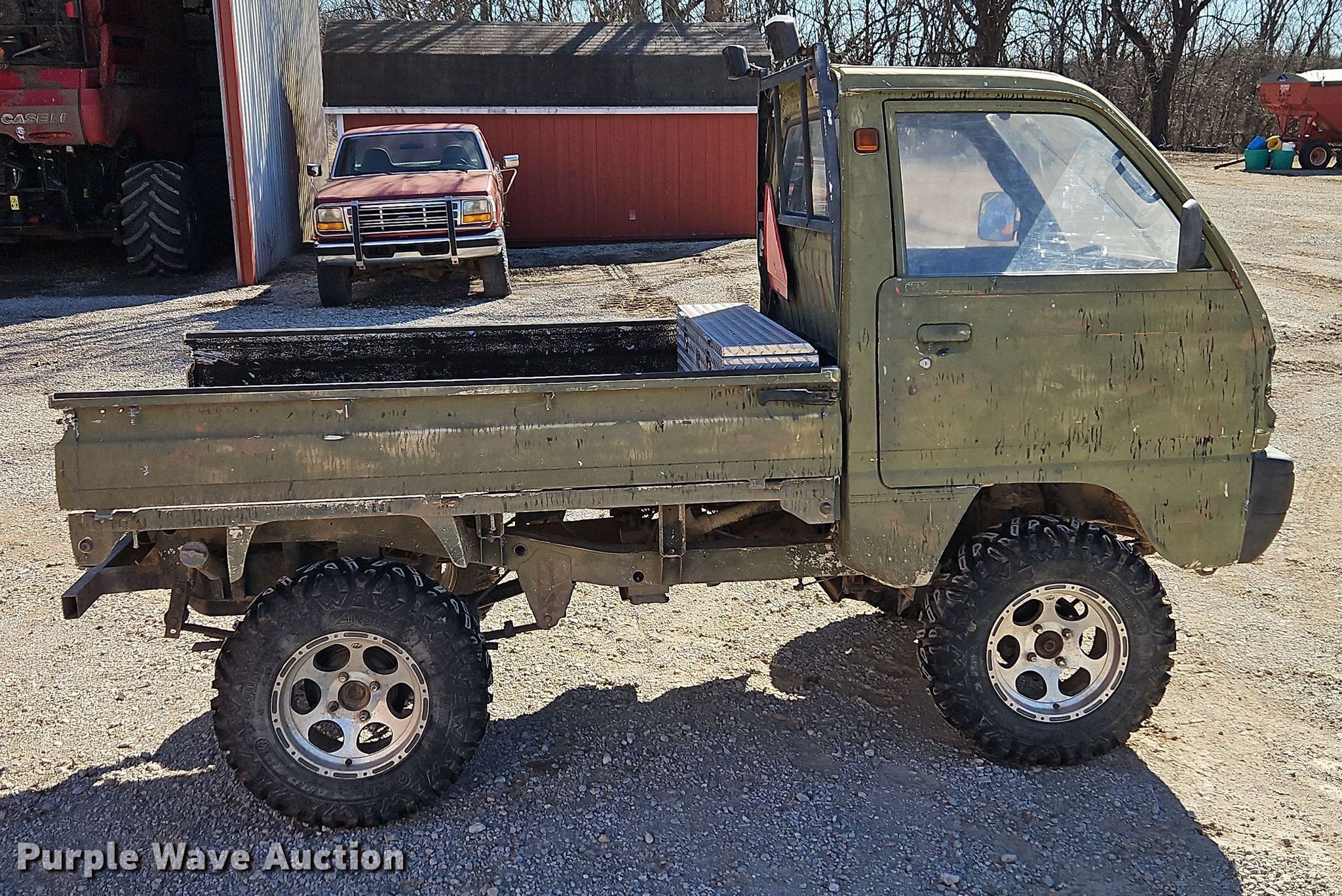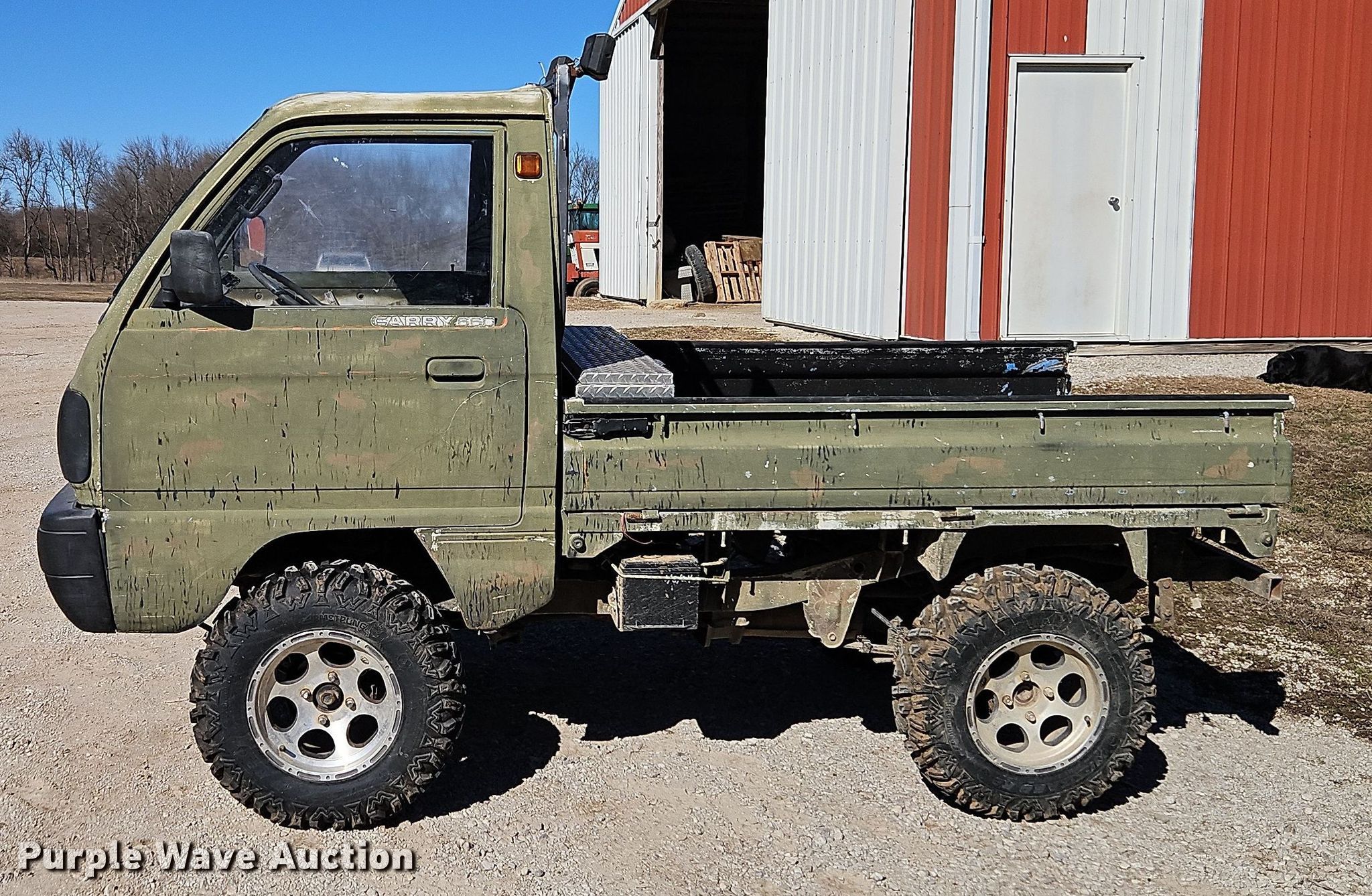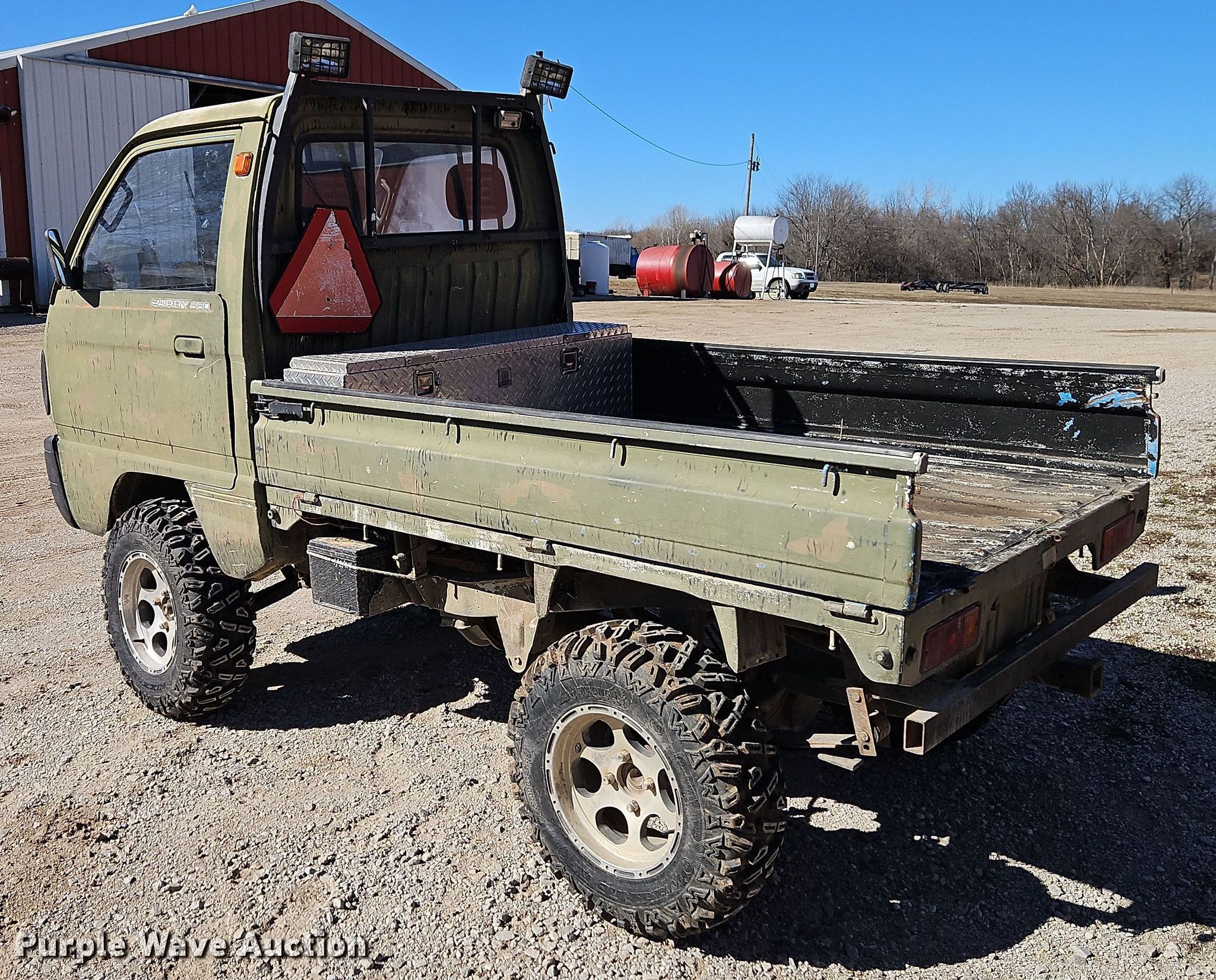 Suzuki M-DB51T mini truck. Miles: 79,420 on odometer, VIN: DB51T145754. Engine Cylinders: 3, Fuel type: Gas, Electric start. Transmission Manual, Speed: 4. Chassis Four wheel drive/ All wheel drive. Operators station Enclosed cab, Heat. Features Receiver hitch, 76" L x 50" W. Tires Size: 27x9.00R14. Transfer of ownership documentation will be a bill of sale. Fulton, KS 66738
