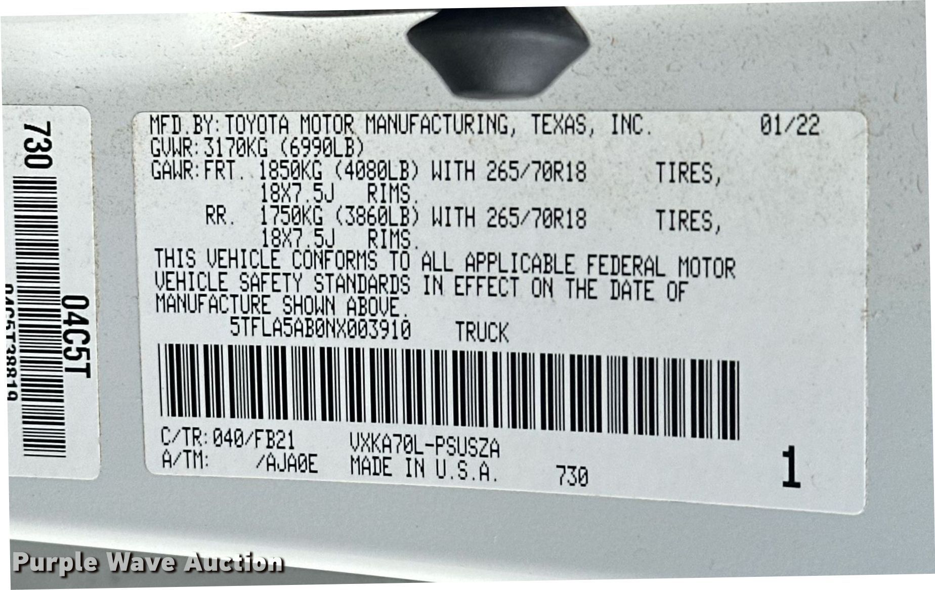 Purple Wave is selling a used 1/2 Ton Pickup or Van in Oklahoma. This item is a 2022 Toyota Tundra SR5 CrewMax pickup truck with the following: Miles: 62,216 on odometer, VIN: 5TFLA5AB0NX003910