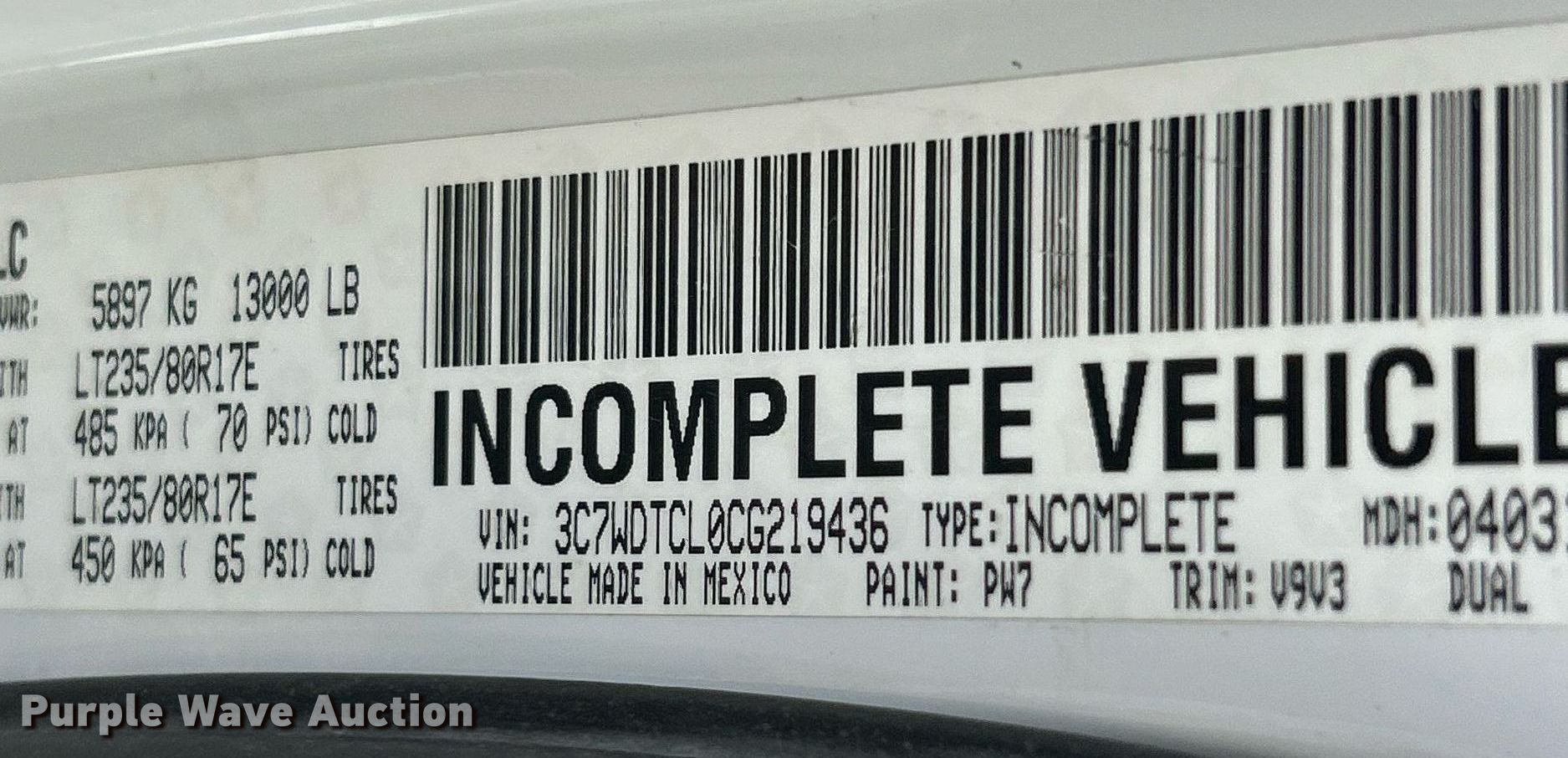 - VIN: 3C7WDTCL0CG219436