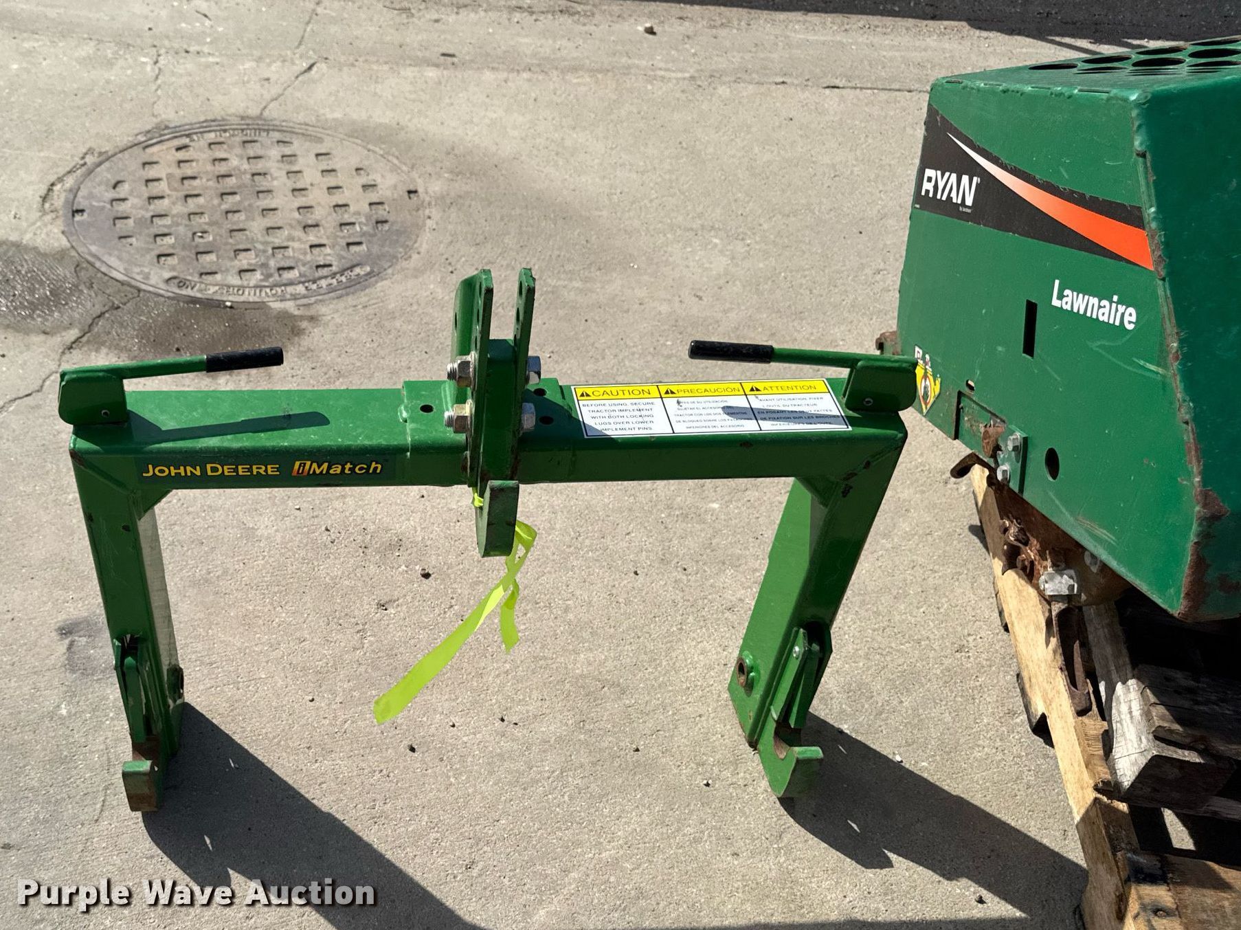 Ryan Lawnaire aerator. Hitch: Three point, John Deere Imatch quick hitch included. RJ Lawn Service Inc.. Waukee, IA 50263