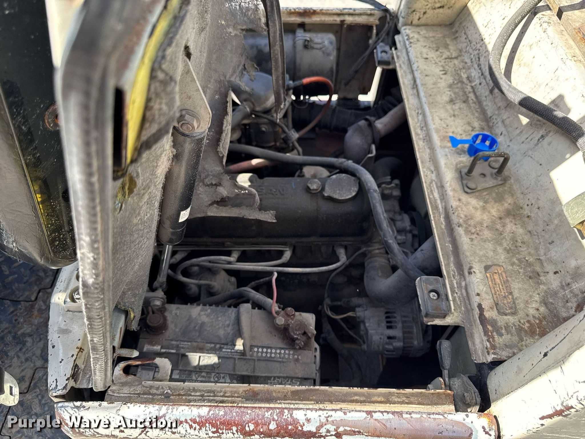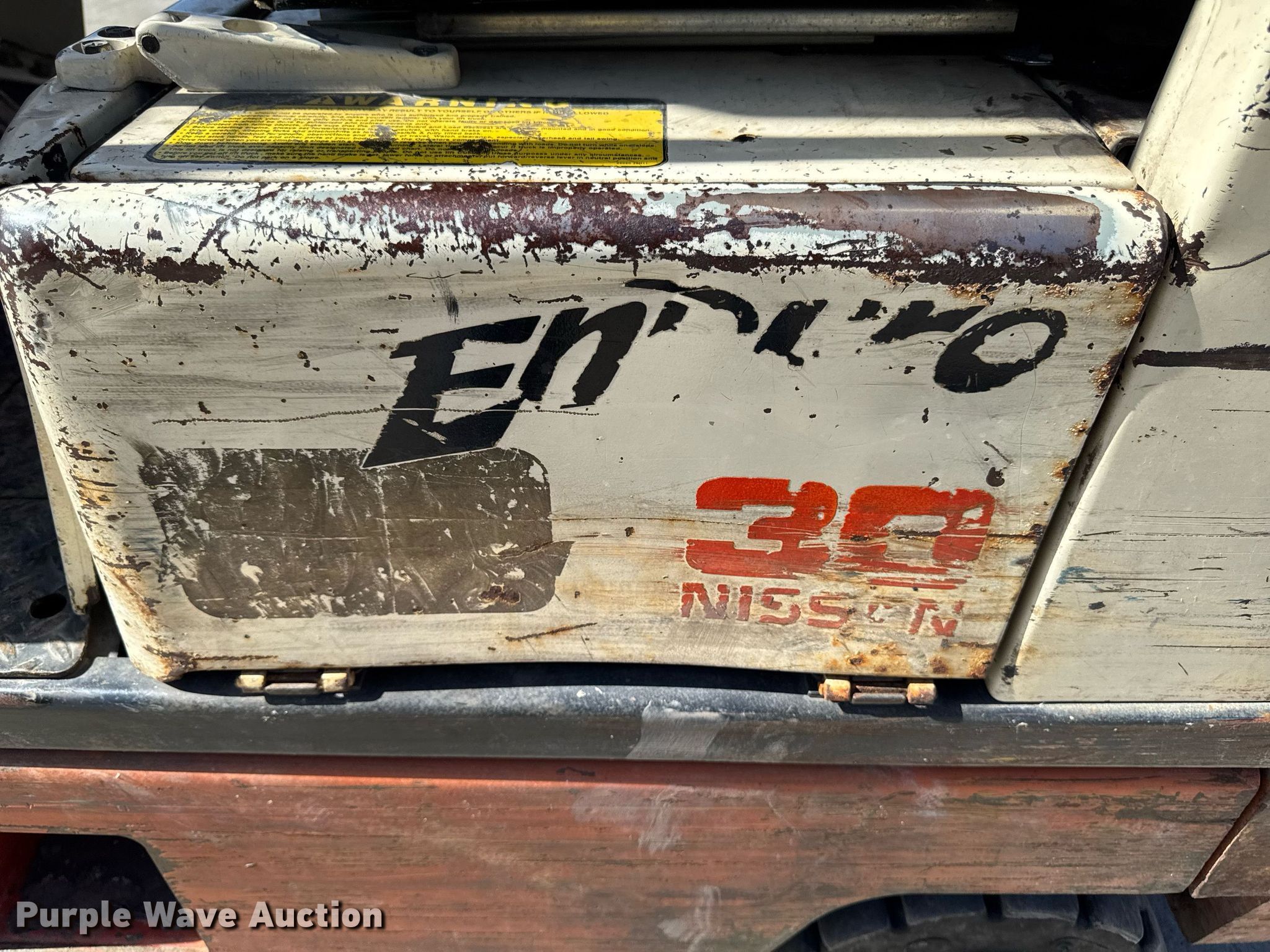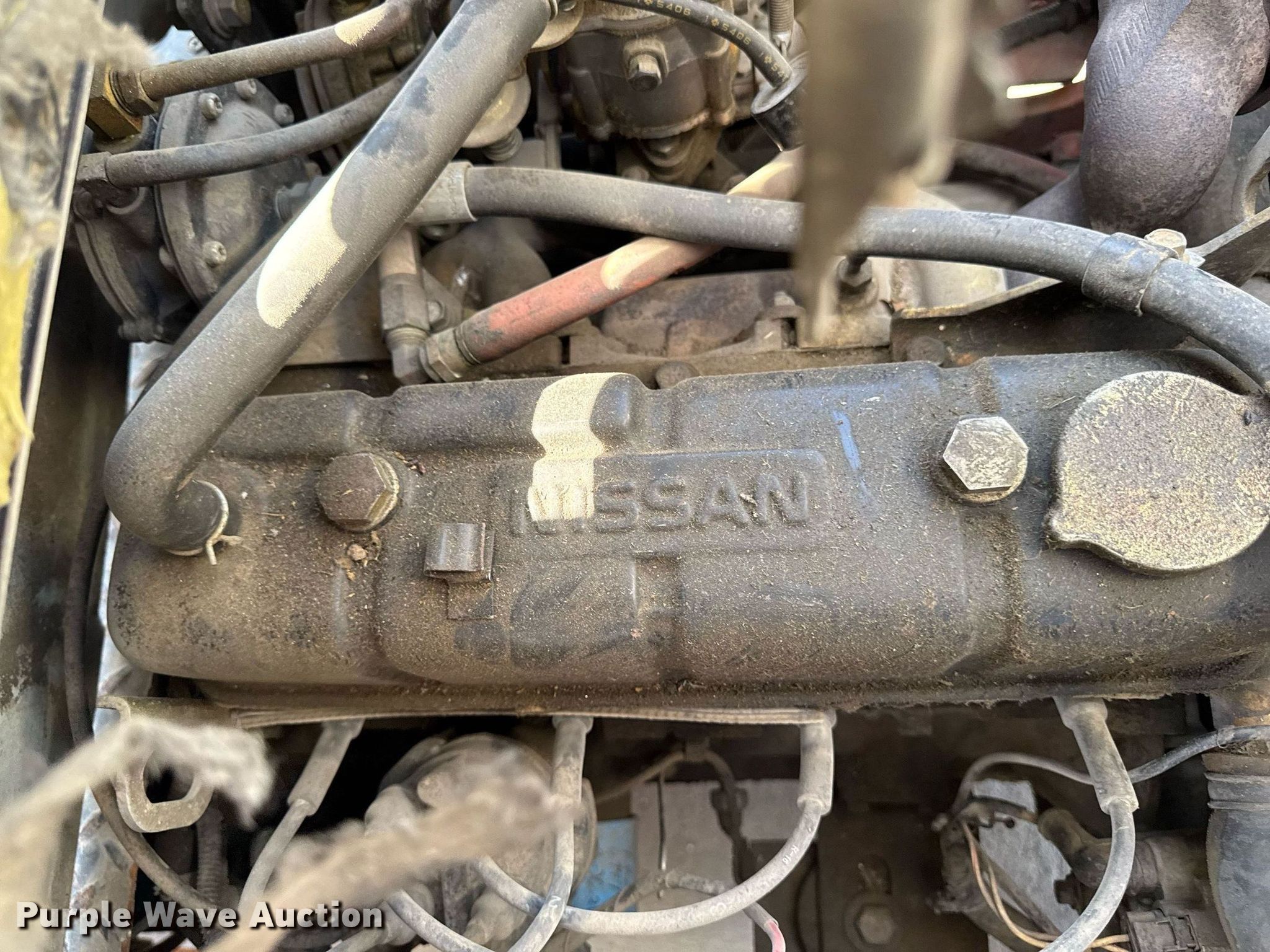 Nissan KCPH01A15PV forklift. Hours: 6,758 on meter, Serial: LCPH01P902533. Engine Nissan, Cylinders: 4, Fuel type: LPG LP bottle: Not included. Transmission Powershift. Features Mast stages: 3, Side shift, Mast tilt, Fork length: 42". Tires Front: 18x6x12 1/8, Rear: 14x4 1/8x8, Non-marking. RJ Lawn Service Inc.. Waukee, IA 50263