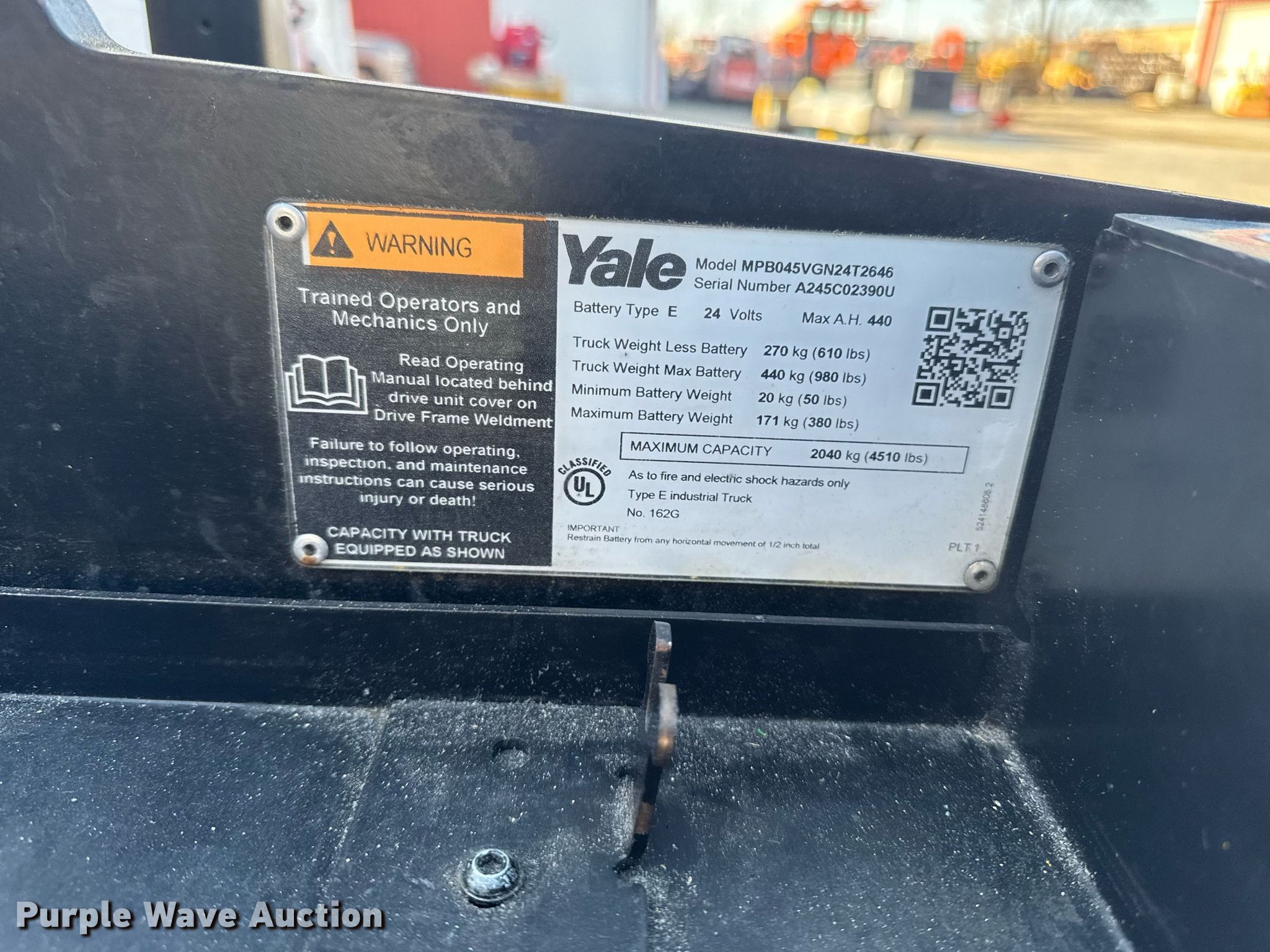 Purple Wave is selling a used Warehouse Forklift in Iowa. This item is a Yale MPB045VGN24T2646 pallet Jack with the following: Hours: 1,534 on meter, Serial: A245C02390U