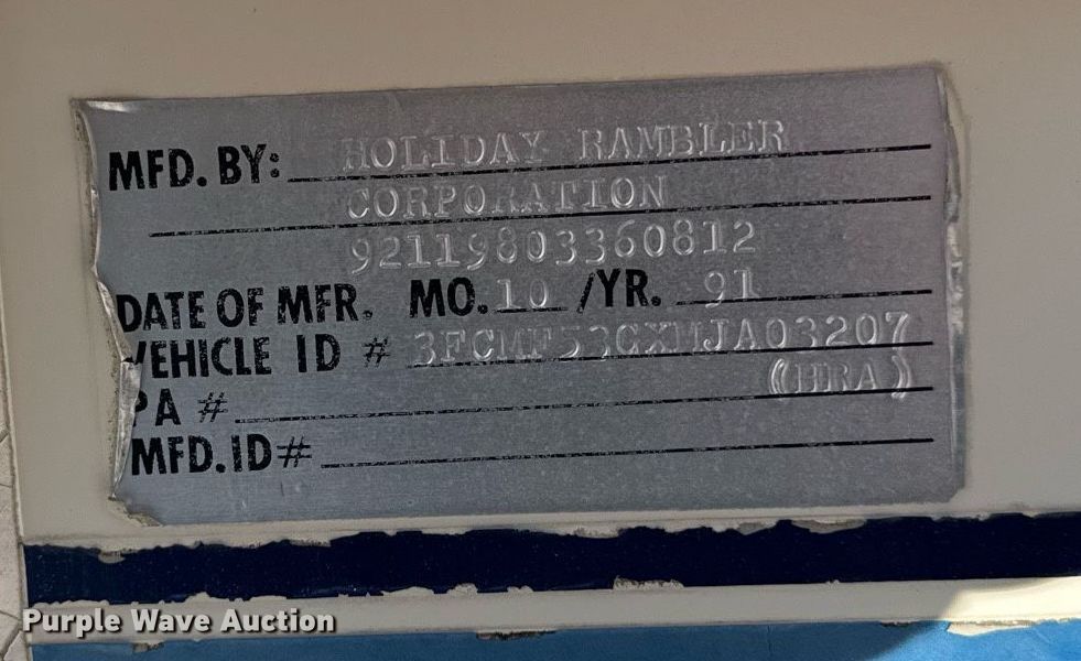 Purple Wave is selling a used RV or Camper in Iowa. This item is a 1991 Holiday Rambler Aluma Lite RV with the following: Miles: 76,483 on odometer, Camper length: 32', VIN: 3FCMF53GXMJA03207