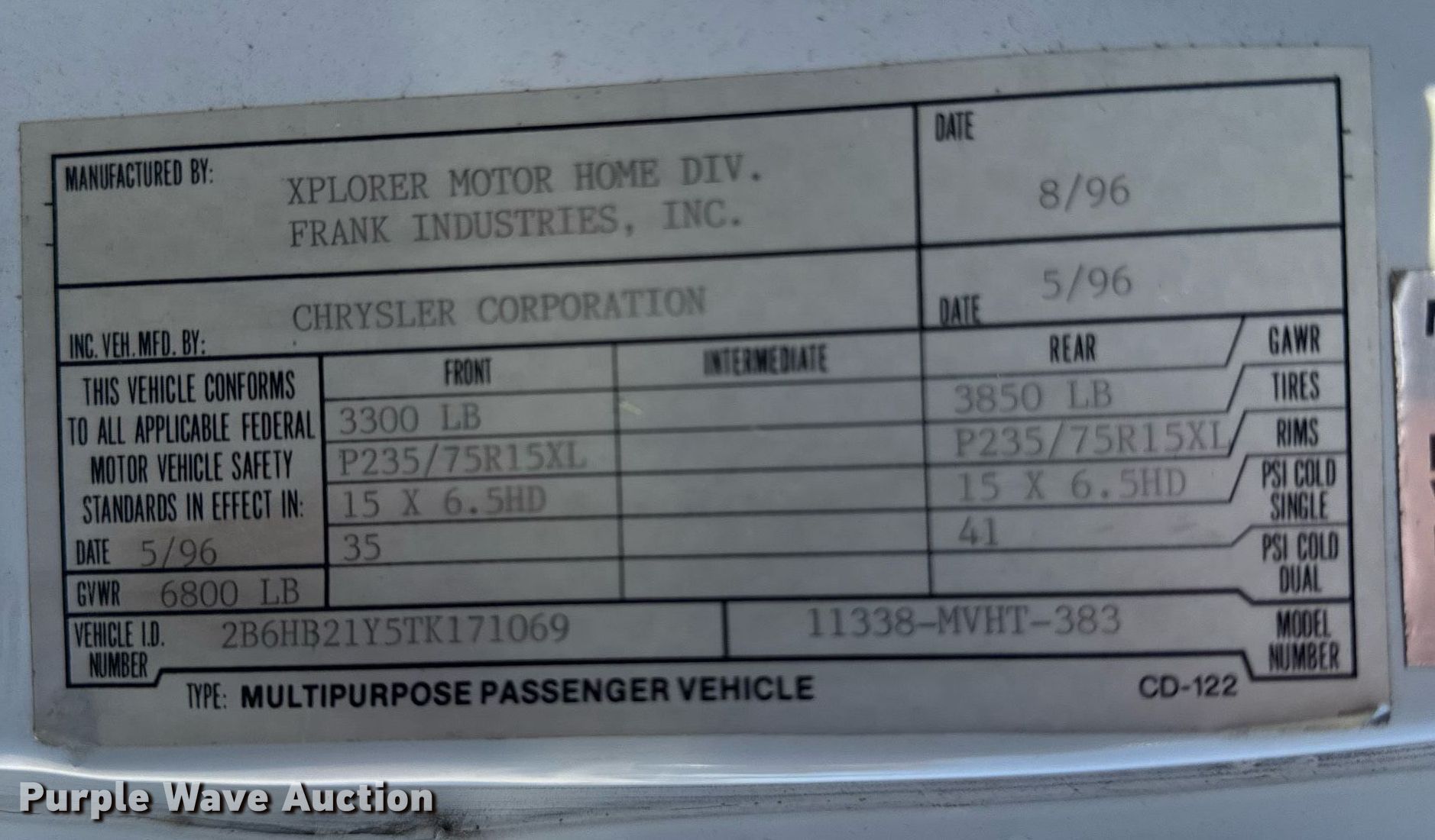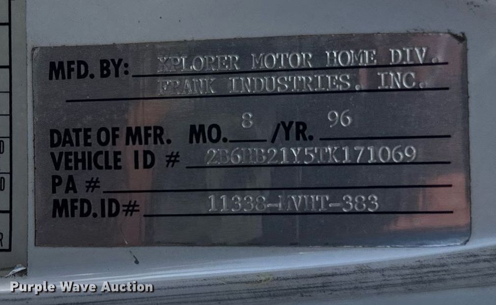 Purple Wave is selling a used RV or Camper in Iowa. This item is a 1997 Xplorer MUR-VAN HT RV with the following: Miles: 69,947 on odometer, Camper length: 17', VIN: 2B6HB21Y5TK171069