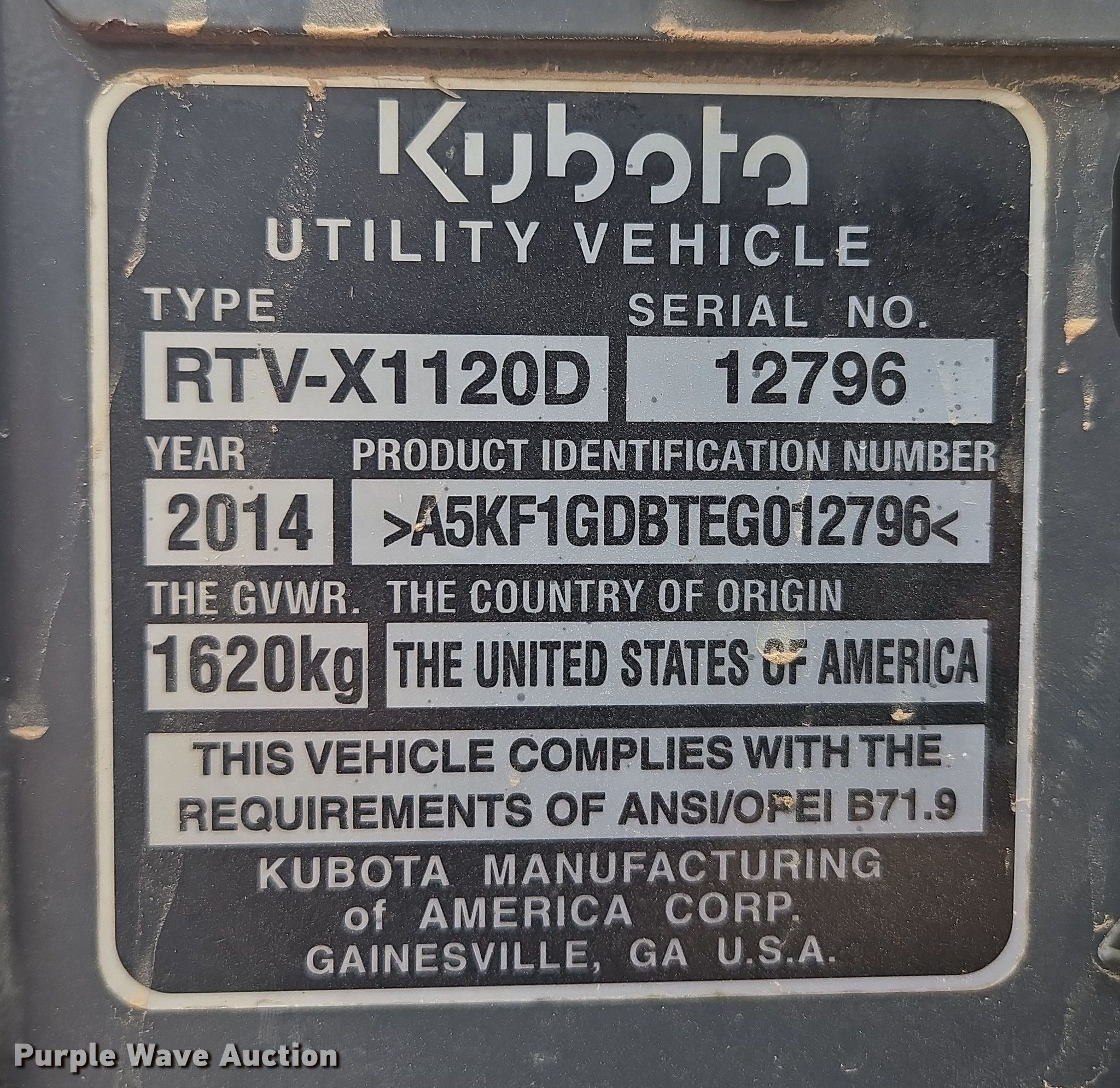 Purple Wave is selling a used Utility Vehicle in Missouri. This item is a 2014 Kubota RTV X1120D utility vehicle with the following: Miles: 9,378 on odometer, Hours: 816 on meter, VIN: A5KF1GDBTEG012796, Serial: 12796