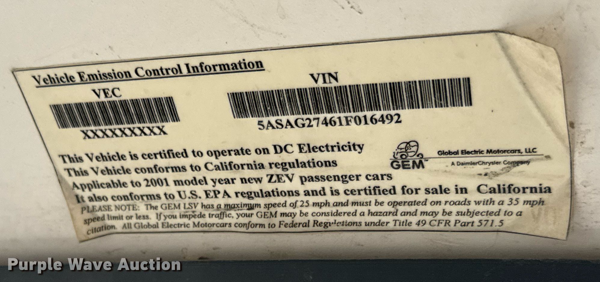 Purple Wave is selling a used Golf Cart in Kansas. This item is a 2001 GEM E2 golf cart with the following: Miles: 1,987 on odometer, Hours: 126 on meter, Serial: 5ASAG27461F016492