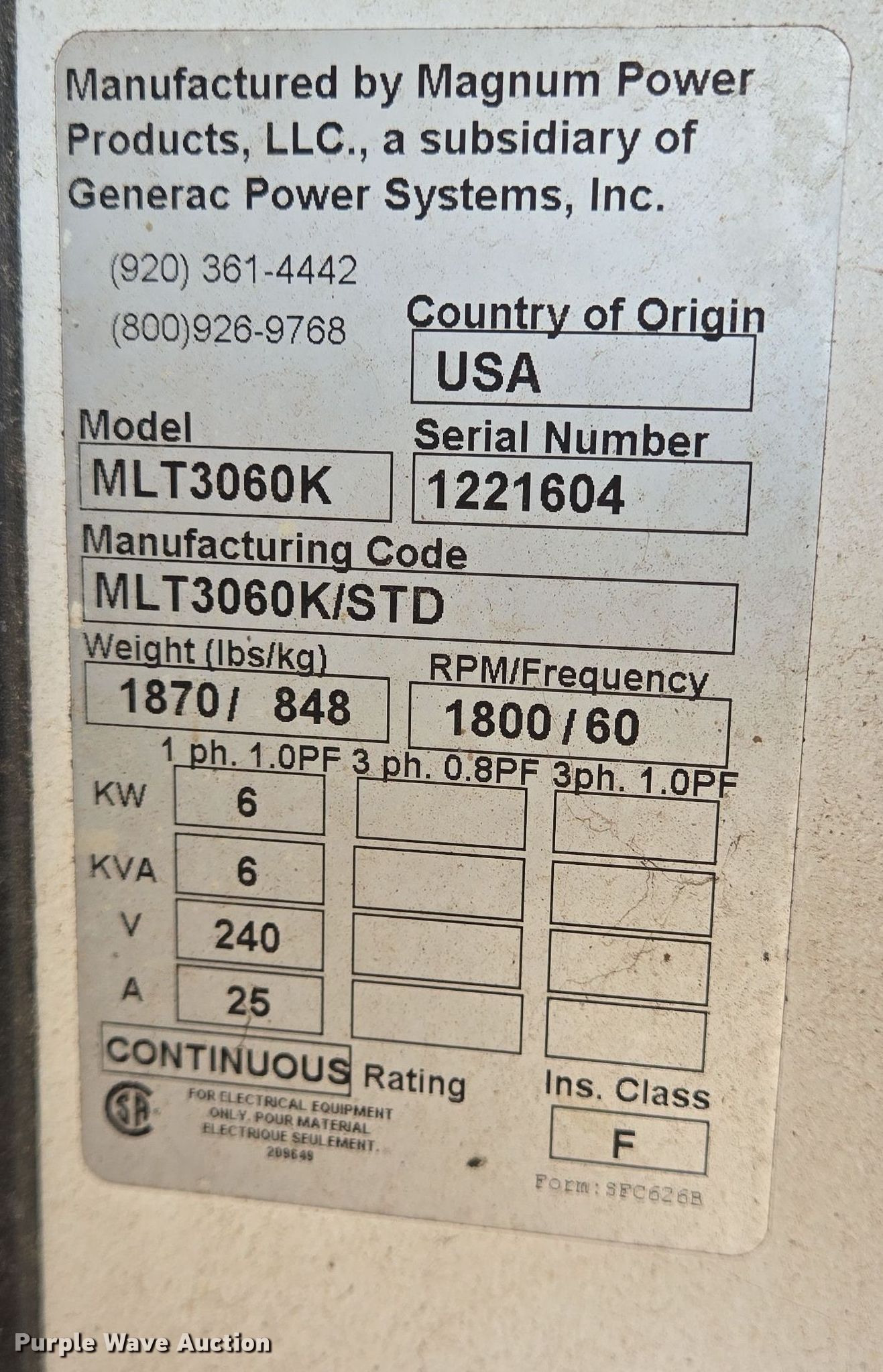 Take a look at this used 2012 Magnum MLT3060K light plant being sold on April 9th, 2025 in the SOLD! April 09 Vehicles and Equipment Auction made by Magnum. Take a look at all of the item information below or take a look at similar auctions for Generators and Light Plants.