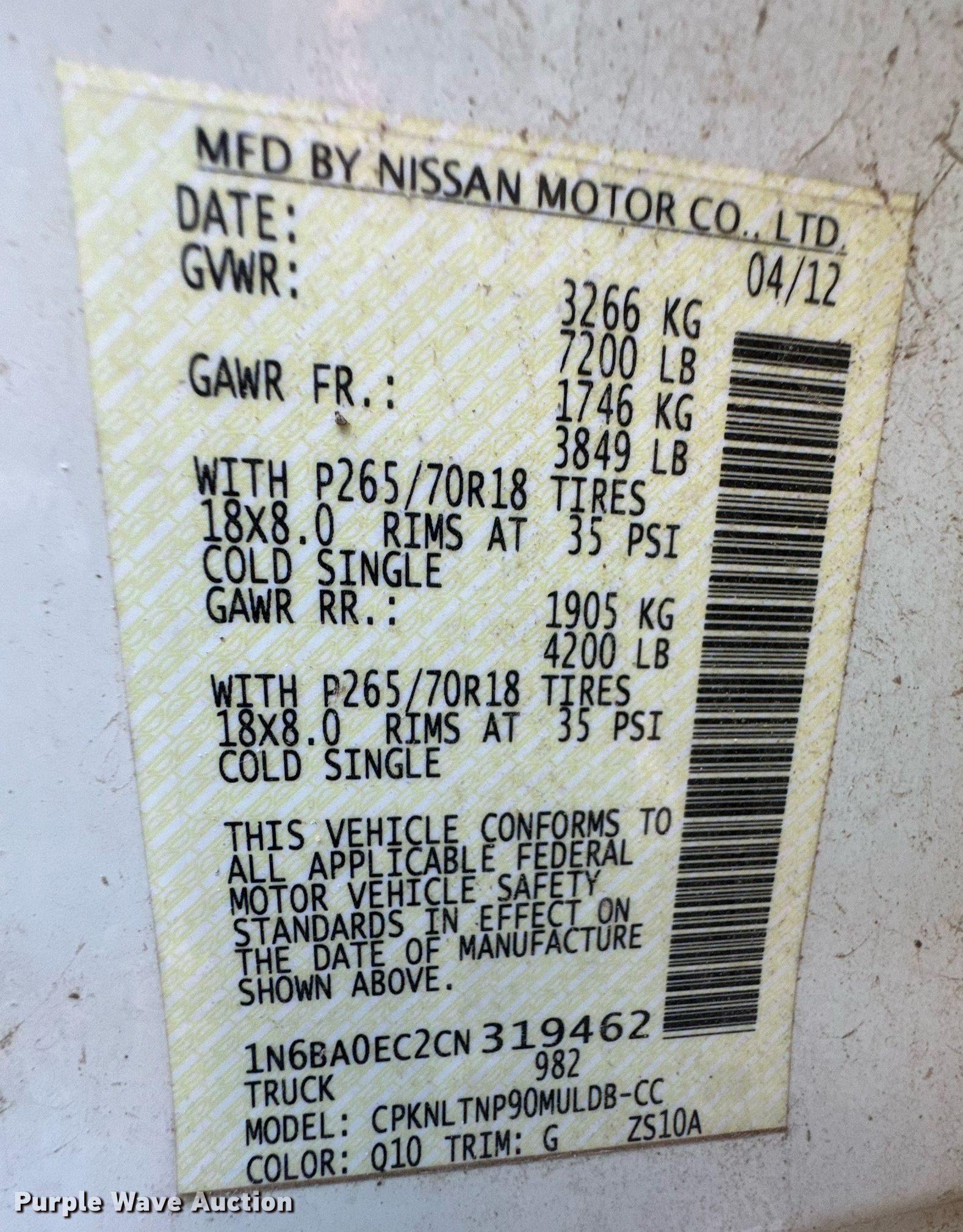 Purple Wave is selling a used 1/2 Ton Pickup or Van in Texas. This item is a 2012 Nissan Titan Crew Cab pickup truck with the following: Miles: Unknown, VIN: 1N6BA0EC2CN319462