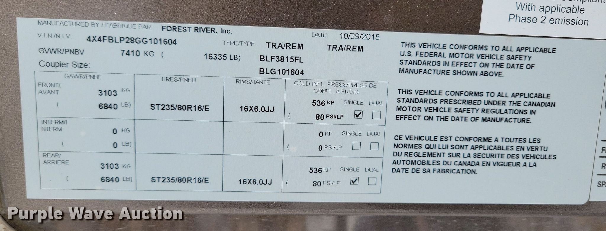 2016 Forest River Blue Ridge camper. Camper length: 42', VIN: 4X4FBLP28GG101604, Unit #: C59-24. Chassis Axles: Tandem, Suspension: Spring, Brakes: Electric, GVWR: 16,335 lbs, GAWR: 6,840 lbs. Interior Kitchen: Sink, Refrigerator, Freezer, Microwave, Oven, Stove: Propane, Living room: Couch, Bathroom, Beds: 1 Bed type: King, TVs: 2, Heater, AC units: 2. Features Slide outs: 5, Awnings: 1 Awning type: Electric. Tires Size: ST235/80R16. Notes Dead battery, Possible insect infestation. South Dakota title. Title distribution may be delayed up to 14 days from verification of funds. PleasureLand RV - Sioux Falls. Sioux Falls, SD 57107