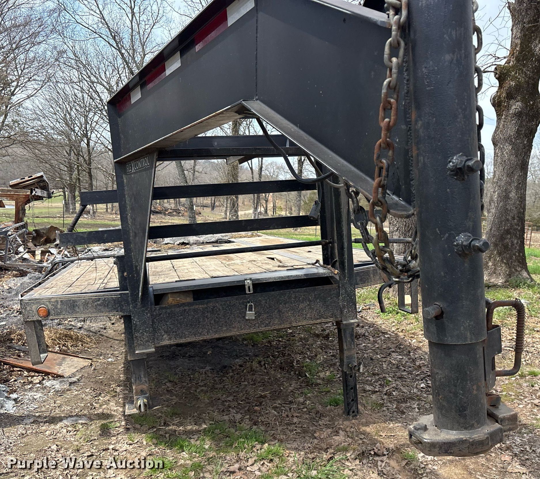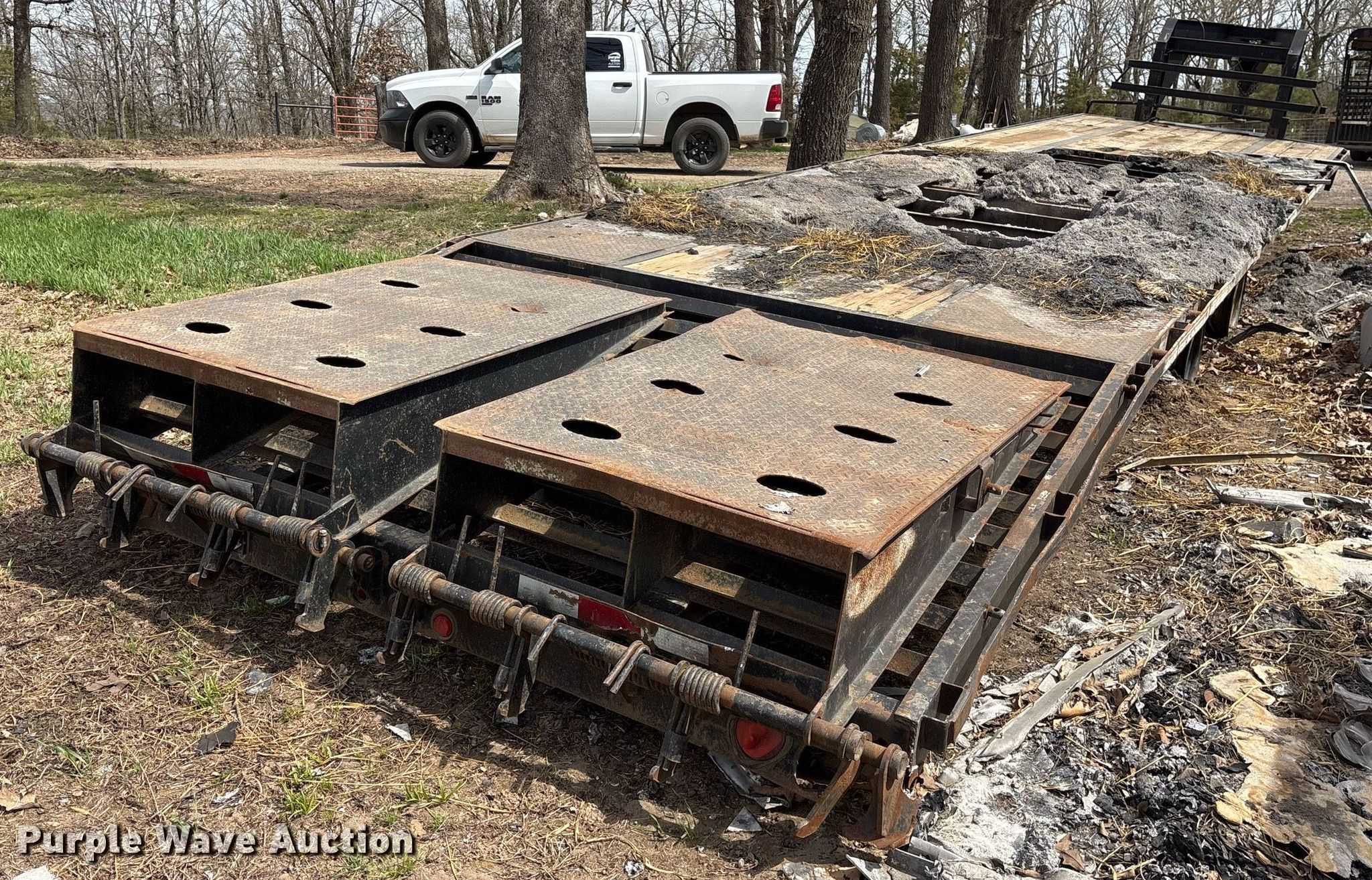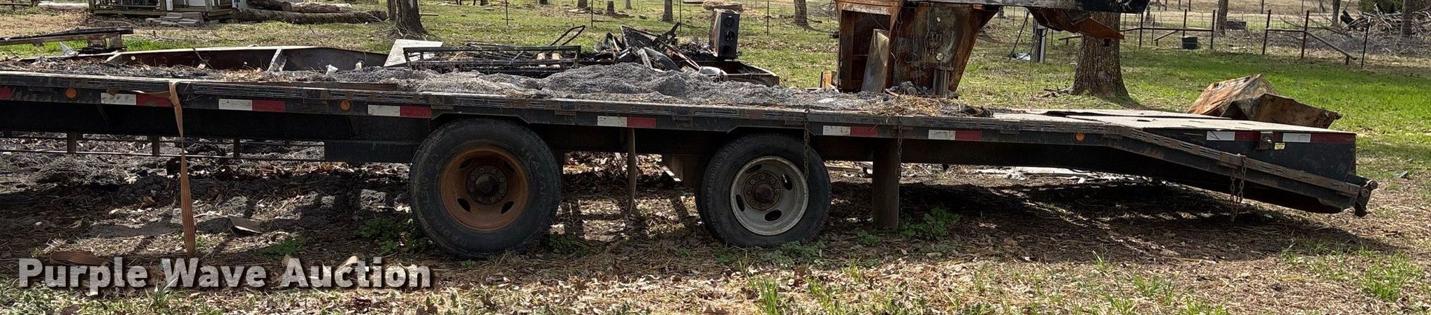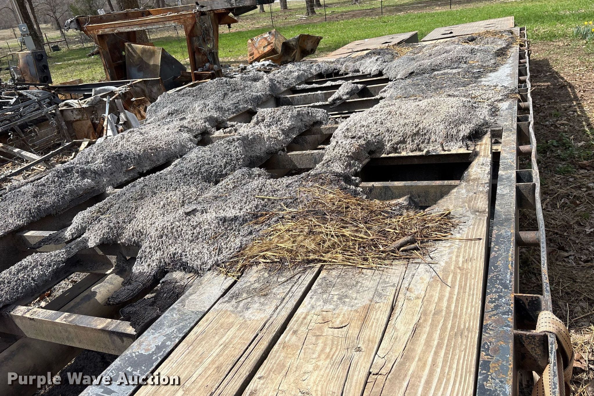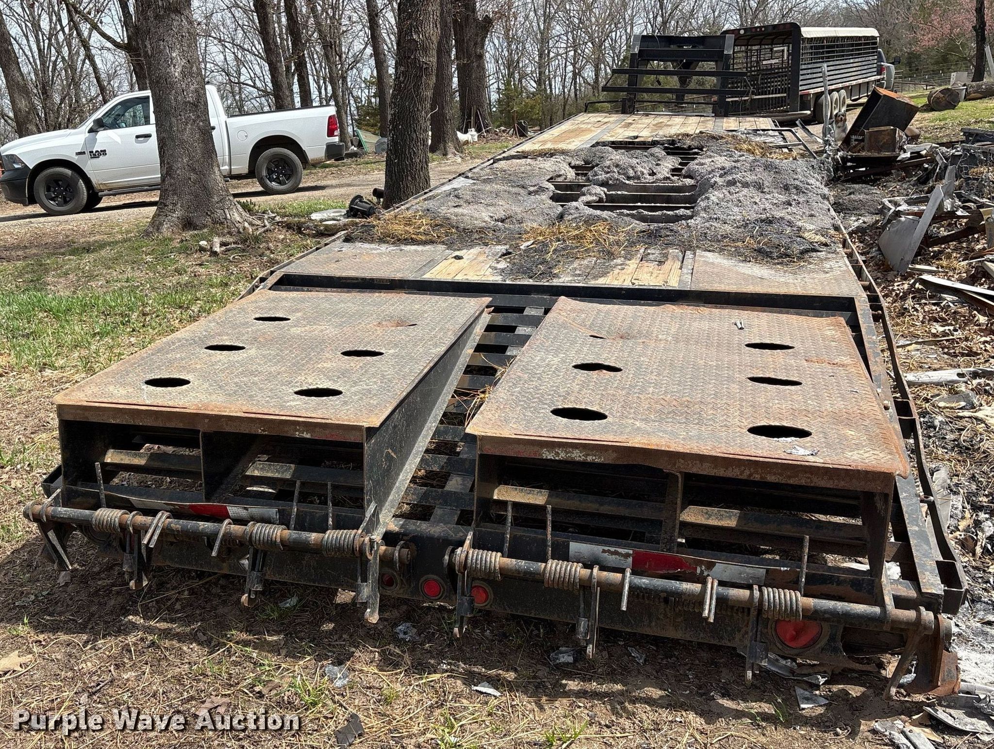 2018 Elite Cottage Builders Dovetail-36 equipment trailer. VIN: 1E9BF3629JS230174, Insurance salvage unit claim #: 5-801276. Dimensions Overall: 45' L x 8' 5" W, Deck: 31' L x 8' W, Deck height: 3', Tail length: 5', Ramps: Manual Length: 4' 6". Features Deck type: Wood. Chassis Hitch: Gooseneck, Landing gear: Dual, Suspension: Spring, Brakes: Electric, Axles: Tandem, Spread, GVWR: 24,000 lbs, GAWR: 12,000 lbs. Tires Steel wheels, Size: LT235/85R16. Notes Fire damage, Tires missing. Oklahoma title. Title distribution may be delayed up to 14 days from verification of funds. Oklahoma Farm Bureau. Muldrow, OK 74948