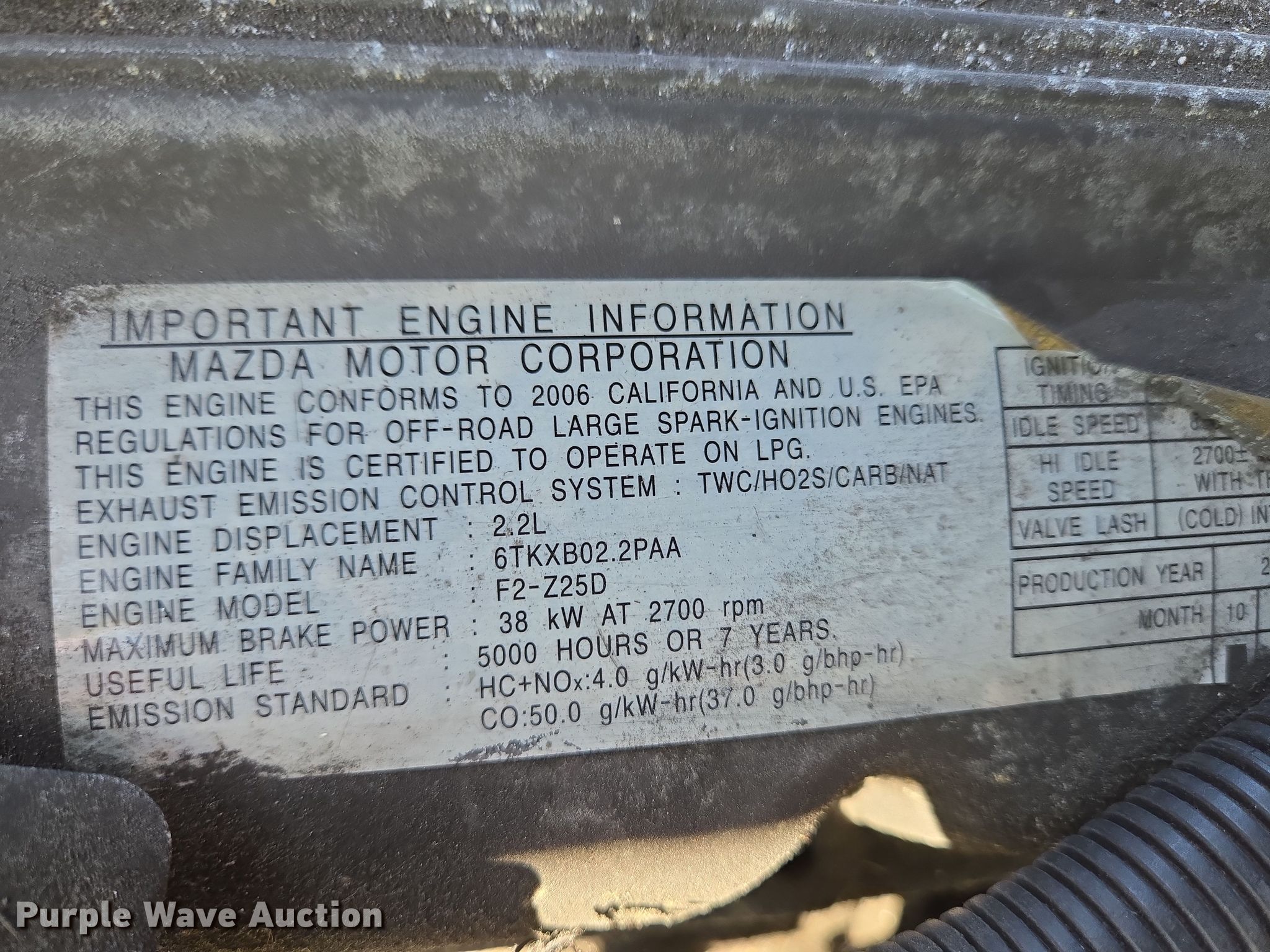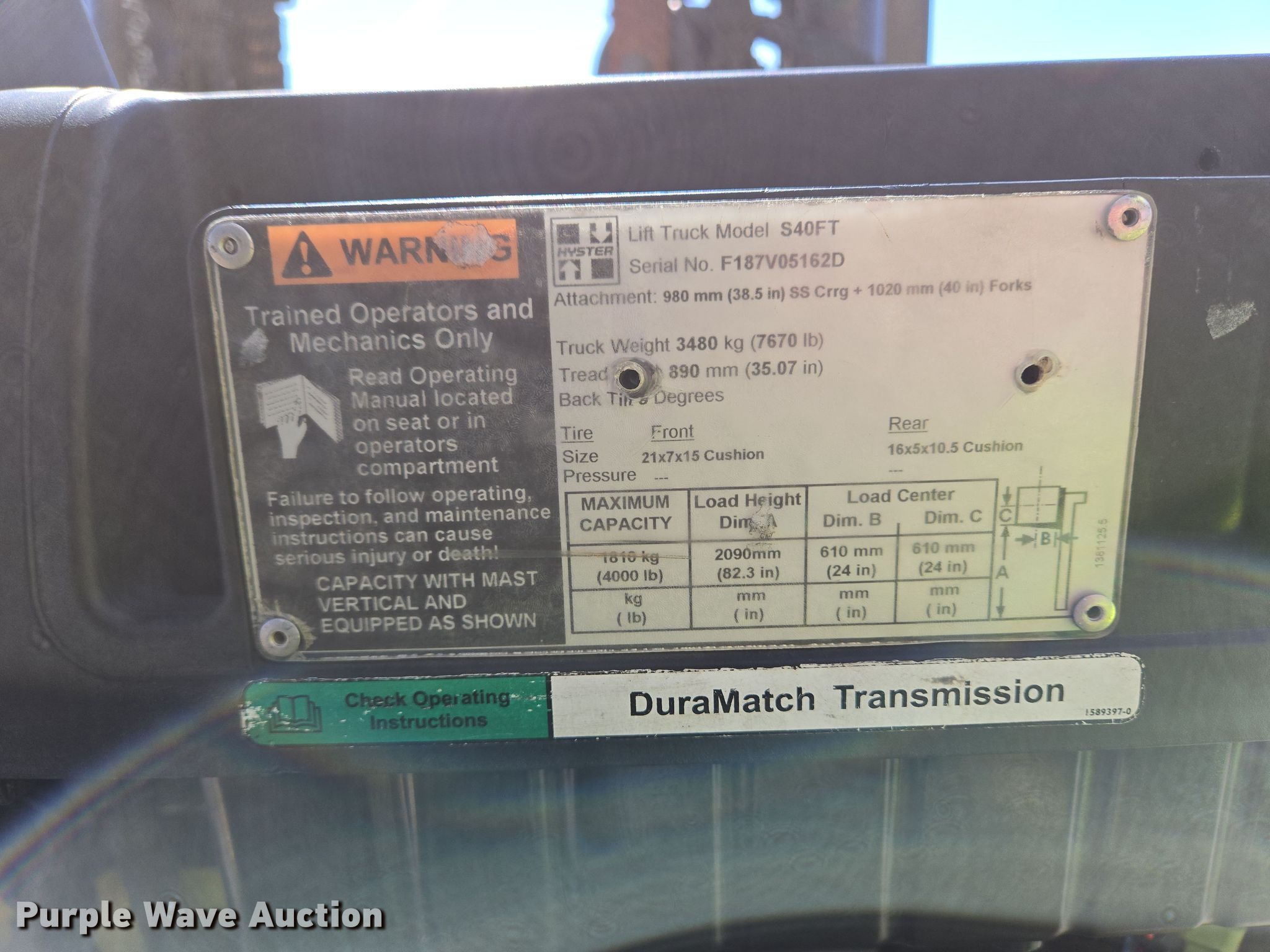 2008 Hyster S40FT forklift. Hours: 32,077 on meter, Serial: F187V05162D, Unit #: 47203304. Engine Mazda, Displacement: 2.2L, Cylinders: 4, Fuel type: LPG LP bottle: Not included. Transmission Powershift. Operators station OROPS. Features Maximum lift capacity: 4,000 lbs, Maximum lift height: 82.3", Mast stages: 2, Side shift, Mast tilt. Tires Front: 21x7x15, Rear: 16x5x10.5, Solid. Notes Dead battery, Unknown operating condition. Fleet inventory reduction, stored at a secured facility. Please review REQUIRED REMOVAL INSTRUCTIONS. Fleet Inventory Reduction. Columbia Station, OH 44028