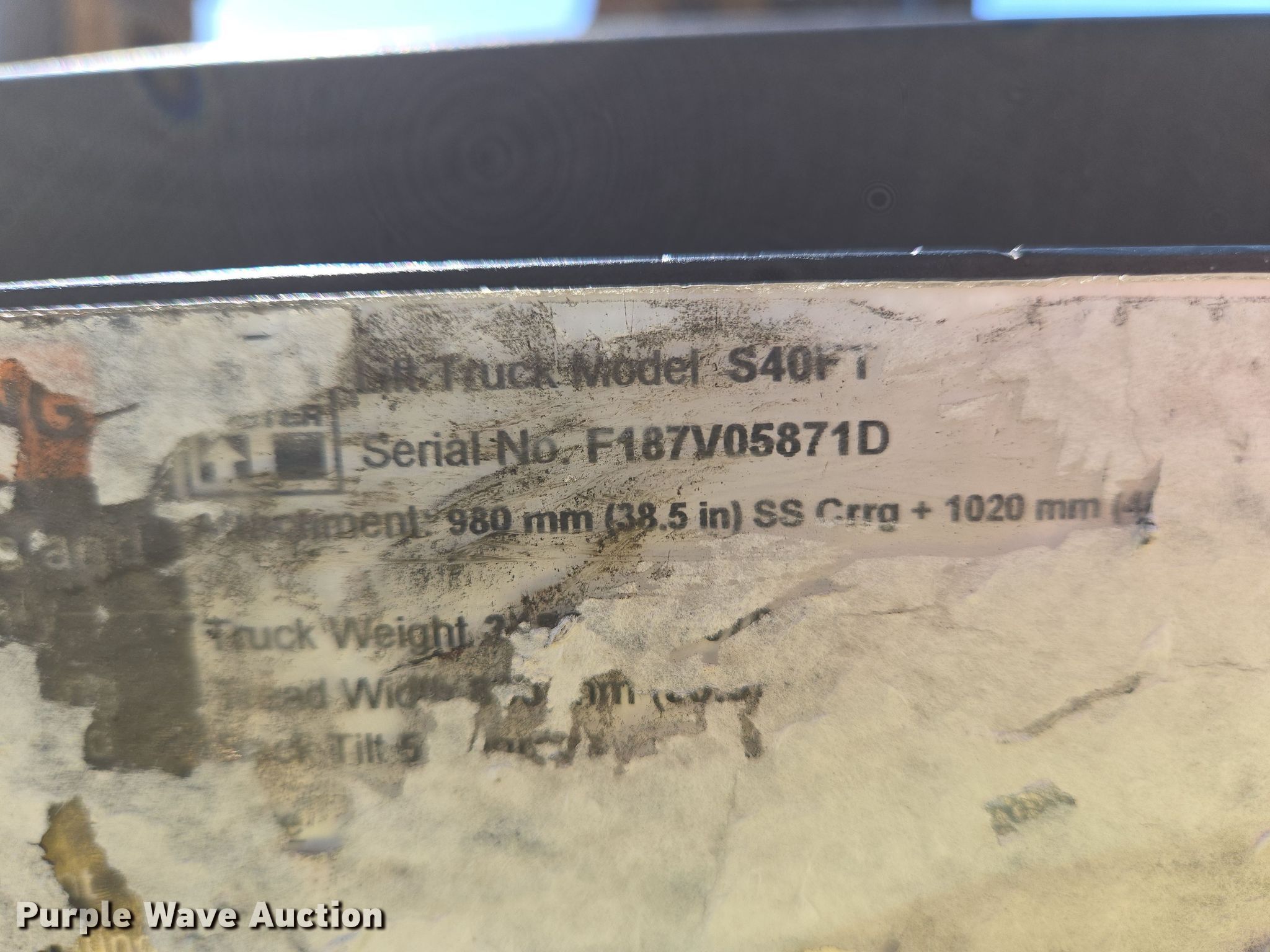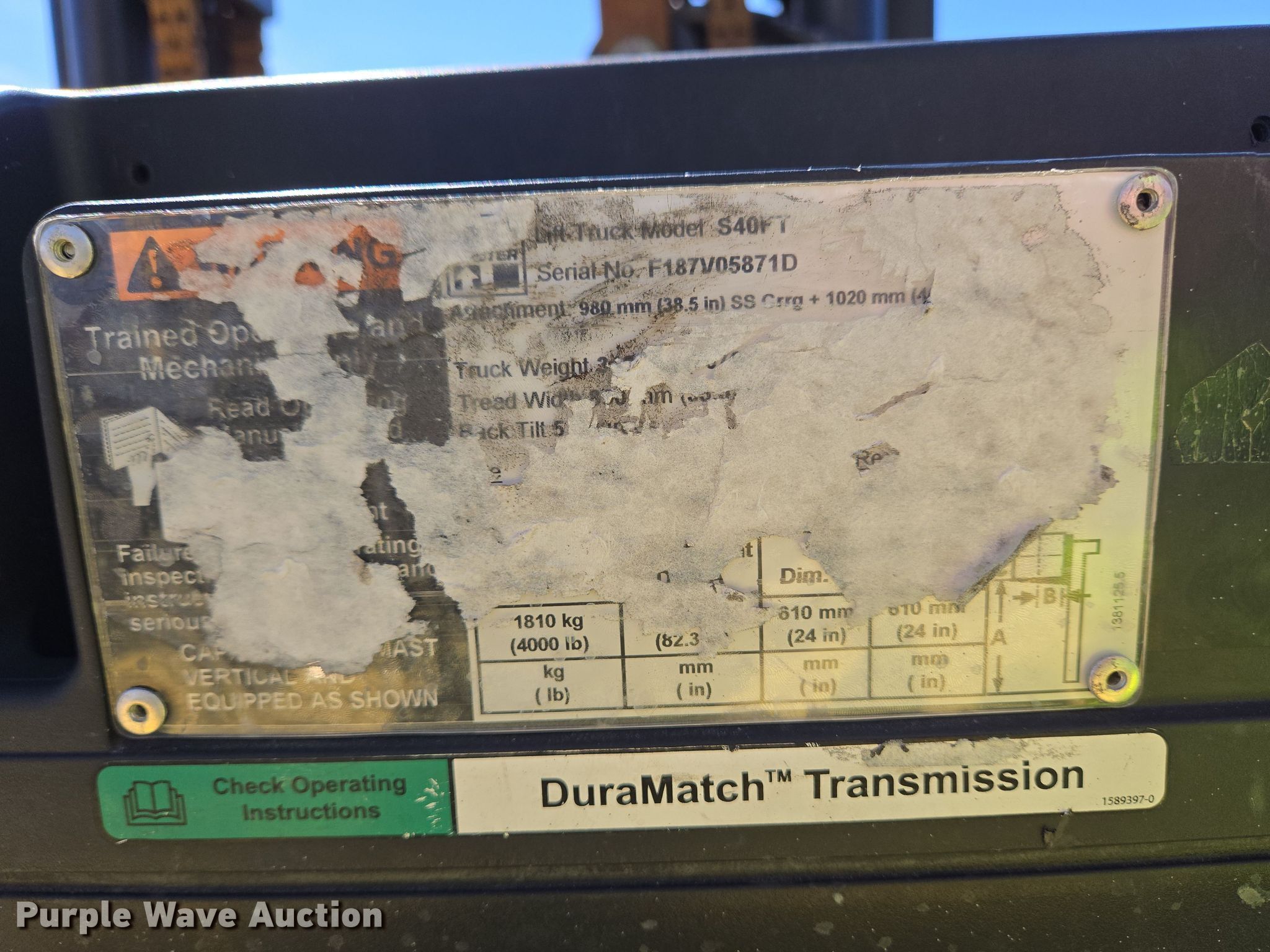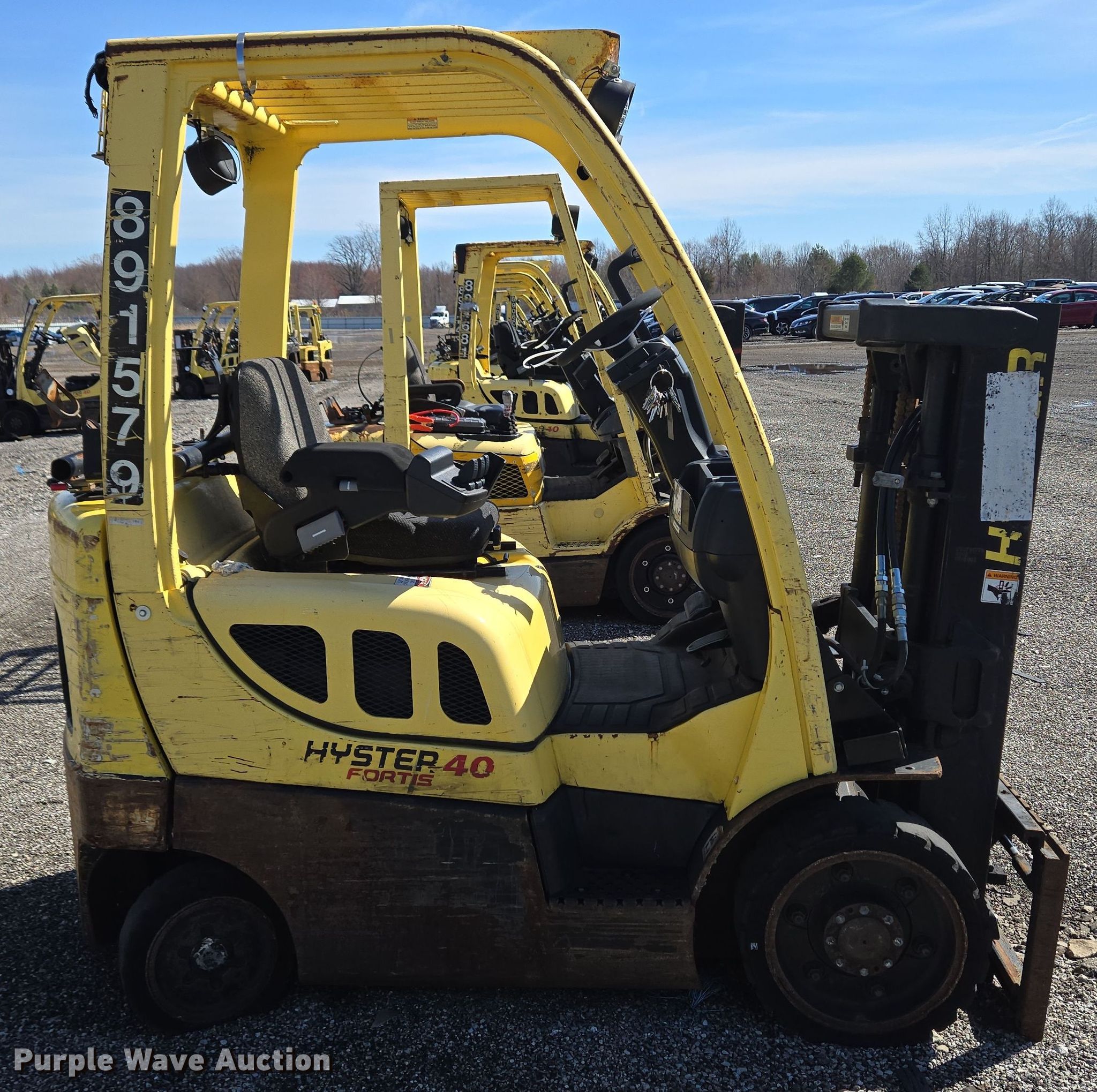 Hyster S40FT forklift. Hours: 11,901 on meter, Serial: F187V05871D, Unit #: 47203964. Engine Cylinders: 4, Fuel type: LPG LP bottle: Not included. Transmission Powershift. Operators station OROPS. Features Maximum lift capacity: 4,000 lbs, Maximum lift height: 82.3", Mast stages: 2, Side shift, Mast tilt. Tires Front: 21x7x15, Rear: 16x5x10.5, Solid. Notes Dead battery, Unknown operating condition. Fleet inventory reduction, stored at a secured facility. Please review REQUIRED REMOVAL INSTRUCTIONS. Fleet Inventory Reduction. Columbia Station, OH 44028