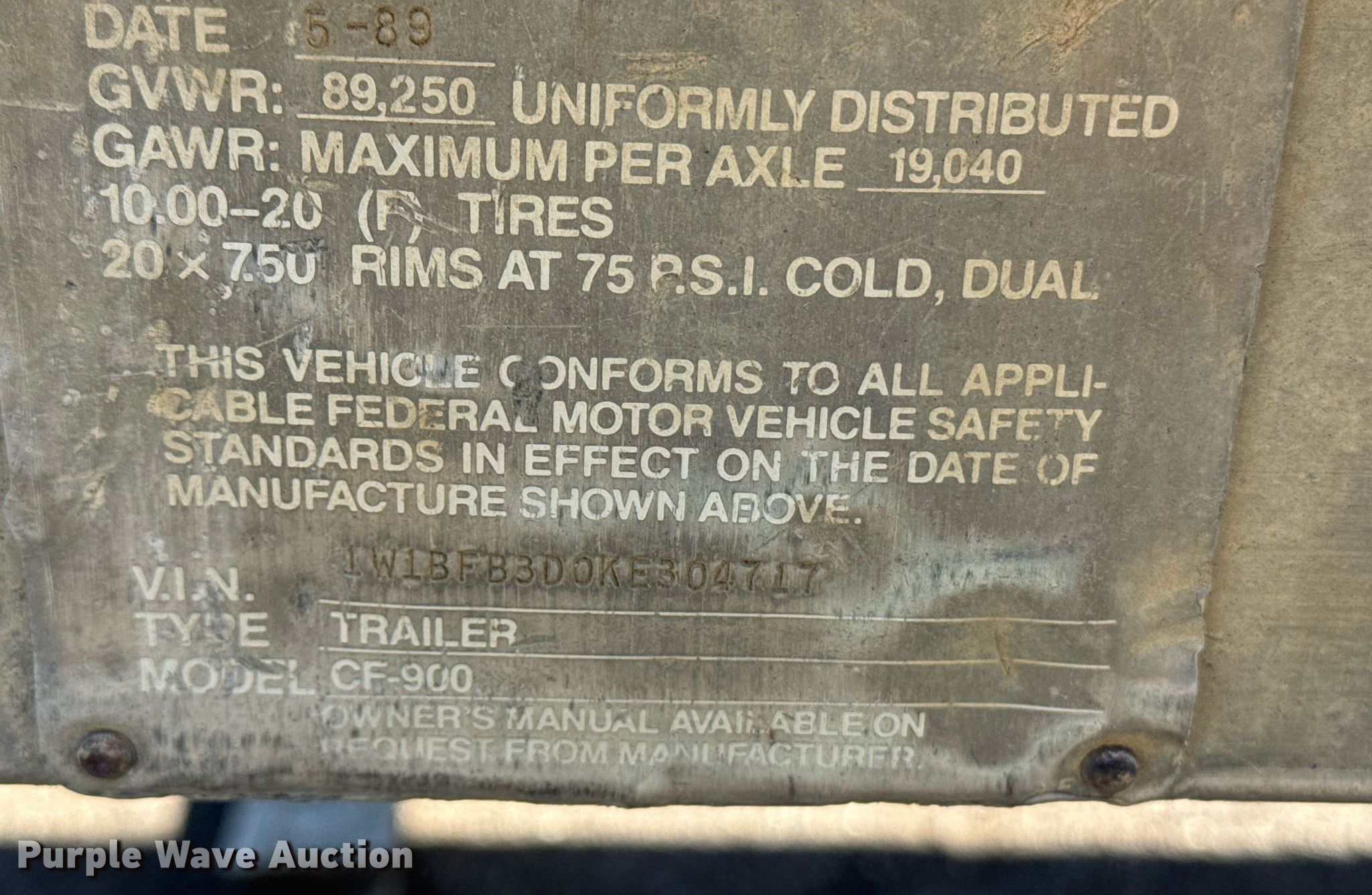 Purple Wave is selling a used Flat or Drop Deck Trailer in Kansas. This item is a 1989 Wilson CF-900 flatbed trailer with the following: VIN: 1W1BFB3D0KE304717