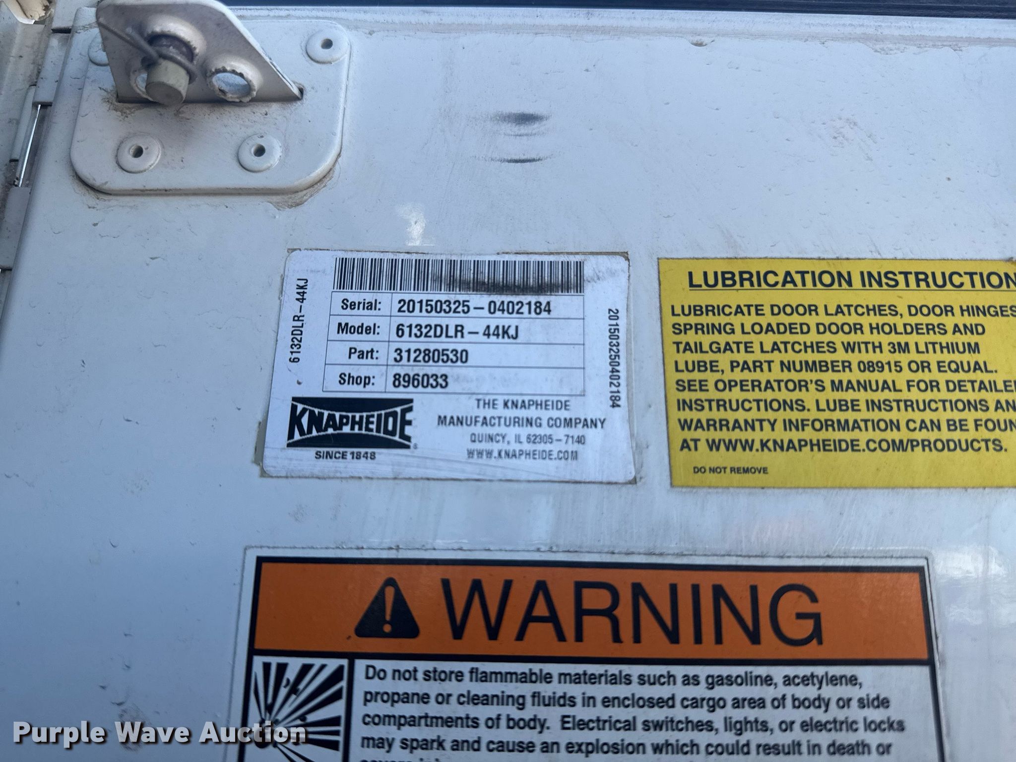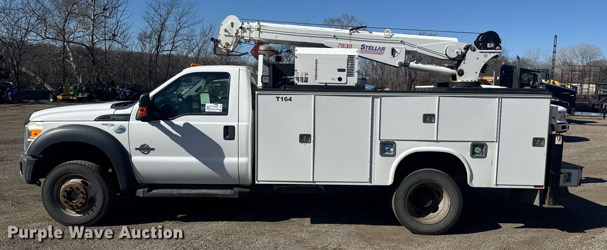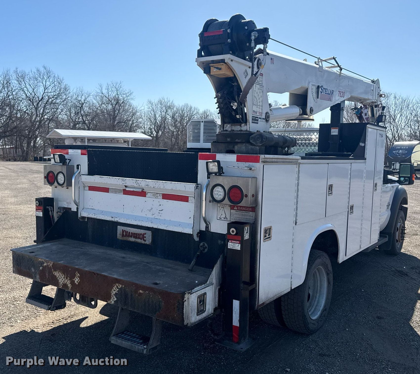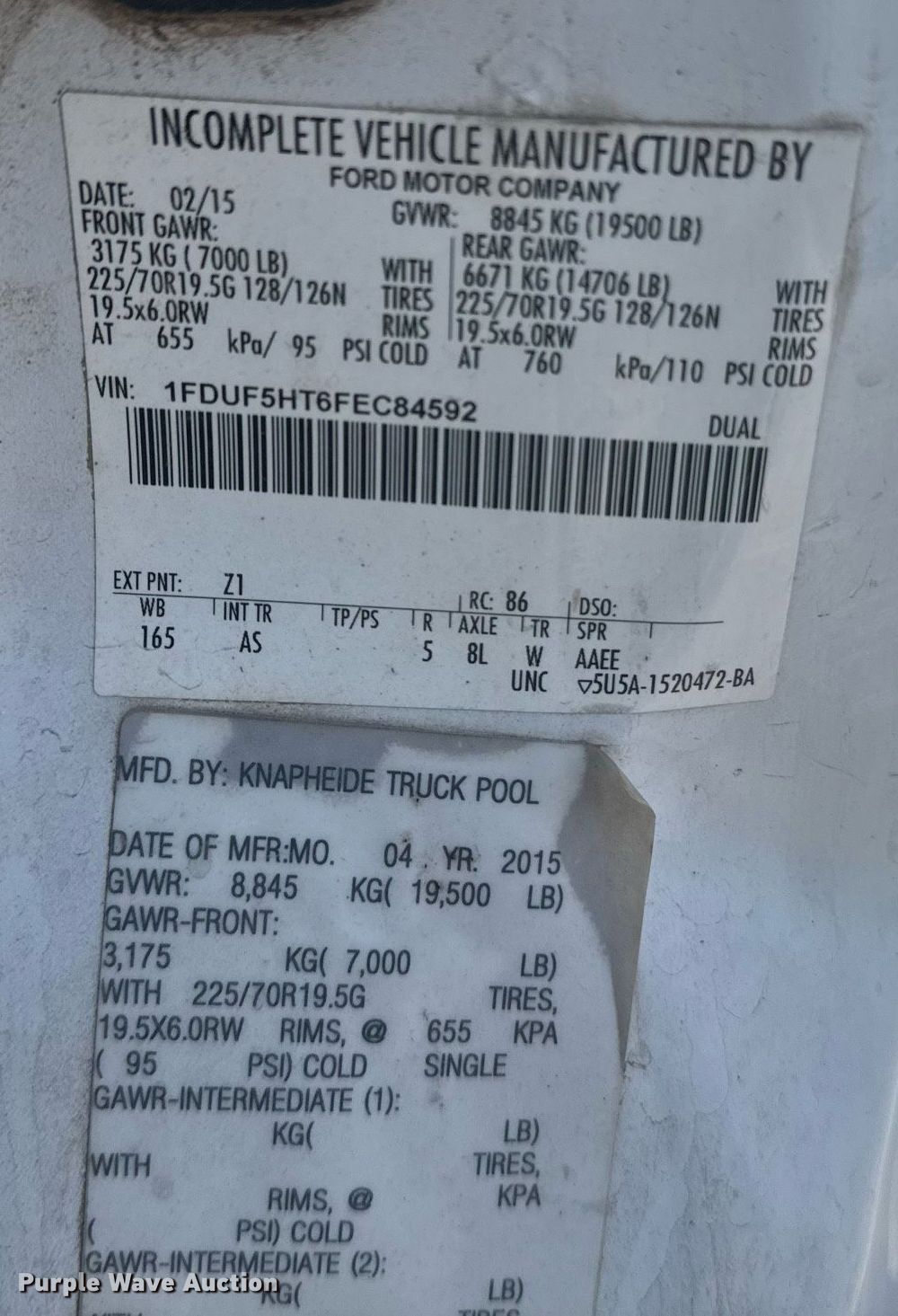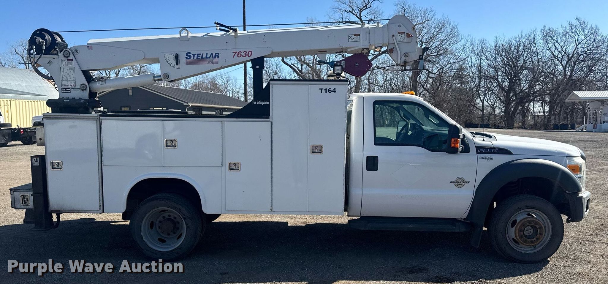 2015 Ford F550 Super Duty XL utility / service truck. Miles: 182,974 on odometer, VIN: 1FDUF5HT6FEC84592. Engine Displacement: 6.7L, Cylinders: 8, Fuel type: Diesel. Transmission Automatic. Chassis Four wheel drive, Axles: Single, Suspension: Spring, Brakes: Hydraulic, PTO, GVWR: 19,500 lbs, Wheelbase: 165". Interior AC, Heat, Heated mirrors, Power windows, Power locks, Cruise control, Auxiliary controls, Brake controller. Features Bed Knapheide, 11' L x 94" W, Air compressor, Crane Stellar 7630, Maximum boom length: 30' Maximum lift capacity: 7,500 lbs.. Tires Size: 225/70R19.5. Notes Dash warning indicator: Check engine, DPF deleted, DEF deleted, EGR deleted. Kansas title. Ebert construction. Wamego, KS 66547