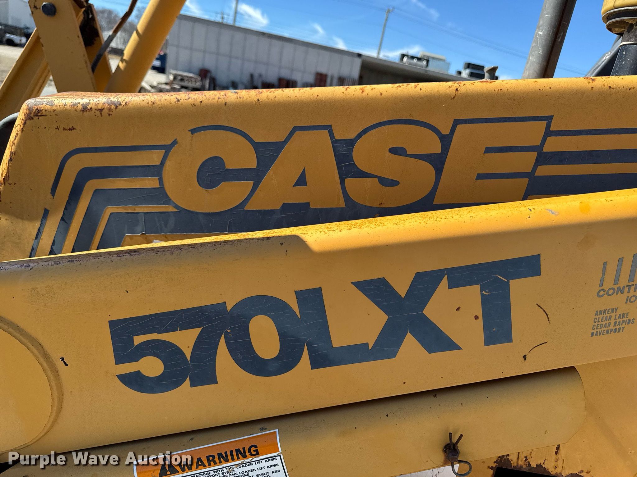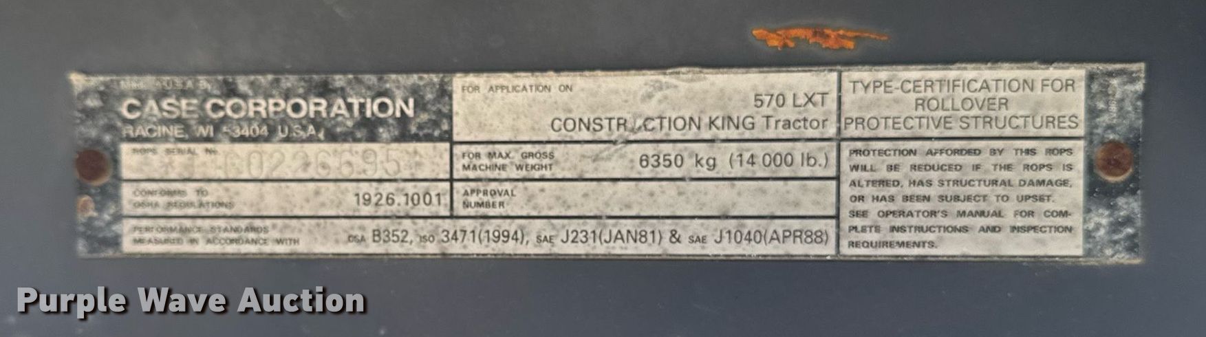 1996 Case 570 LXT industrial tractor. Hours: 5,844 on meter, Serial: JJG0223854. Engine Case 4-390, Serial: 45252679, Displacement: 3.9l, Cylinders: 4, Fuel type: Diesel. Transmission Shuttle shift, 4F - 4R. Chassis Four wheel drive. Operators station OROPS. Features Loader Auxiliary hydraulics, Bucket Case, Width: 84", Cutting edge: Bolt-on, Box blade Width: 84", Cutting edge: Rear, Bolt-on. Tires Front: 12-16.5, Rear: 19.5-24. Notes Brake issues , Hydraulic oil leaks. Davenport, IA 52804