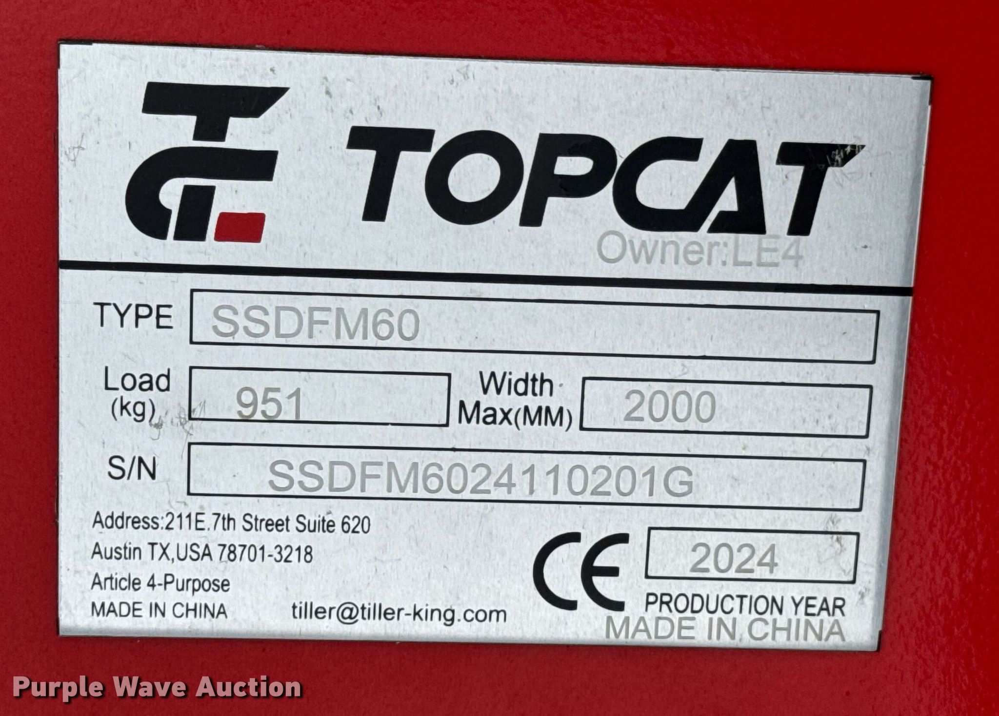 Purple Wave is selling a used Skid Steer Attach. in Kansas. This item is a 2024 TopCat SSDFM60 skid steer mulcher with the following: Serial: SSDFM6024110201G, Width: 60", Unused