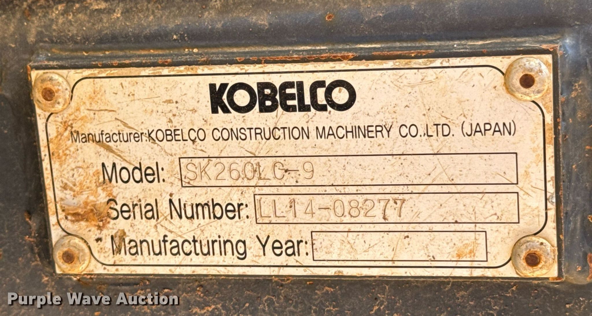 Purple Wave is selling a used Hydraulic Excavator in Arkansas. This item is a 2015 Kobelco SK260LC-9 excavator with the following: Hours: 10,421 on meter, Serial: LL14-08277