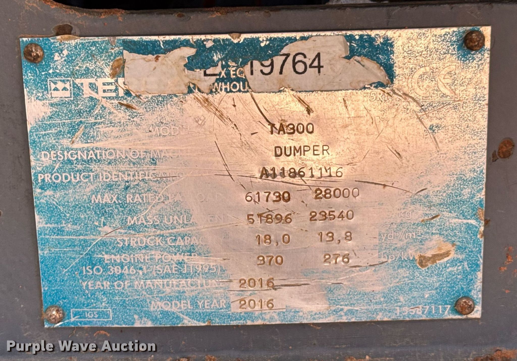 Purple Wave is selling a used Articulated Haul Truck in Arkansas. This item is a 2016 Terex TA300 articulated haul truck with the following: Hours: 177 on meter, Actual hours unknown, Serial: A11861116