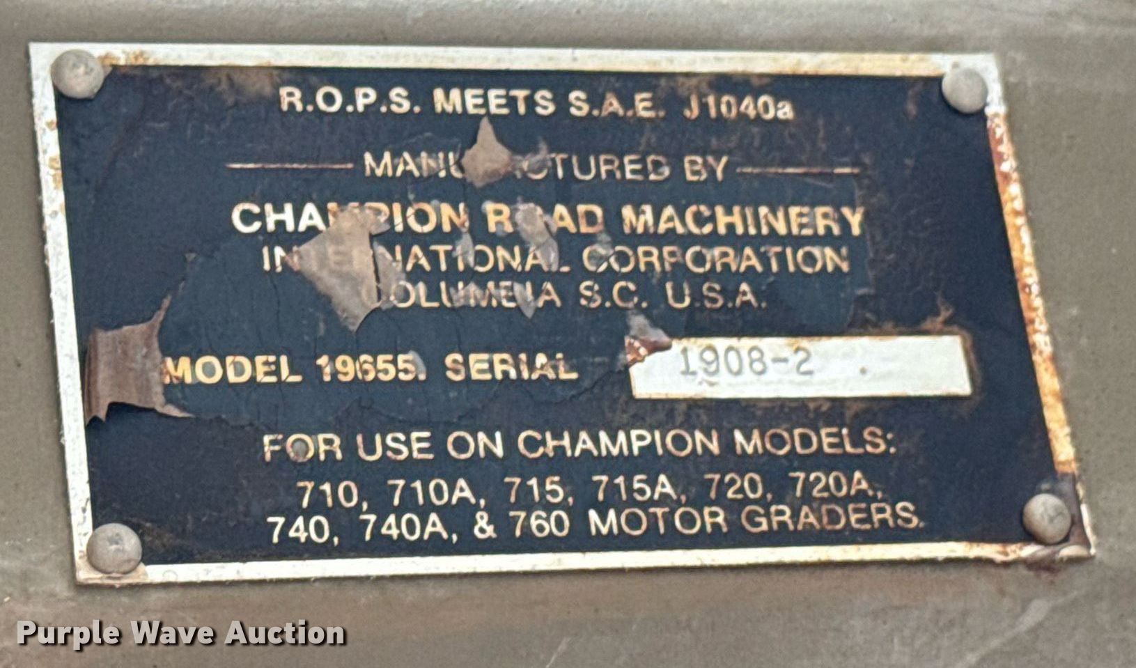 1990 Champion 710A motor grader. Hours: 1,490 on meter, Serial: 710A-157-108-2049-2. Engine Cummins, Serial: 44115704, Displacement: 5.9L, Cylinders: 6, Fuel type: Diesel. Transmission Powershift, 8F - 4R. Operators station Enclosed cab, Hydraulic control valves: 8. Features Moldboard: Tip control, Side shift, Moldboard total width: 13', Scarifier Scarifier type: Mid-mounted Teeth: 1.. Tires Size: 14.00R24. Notes Glass cracked, Hydraulic leak, Transmission issues , Non-operational unit. Weaver Excavating. Claremore, OK 74017