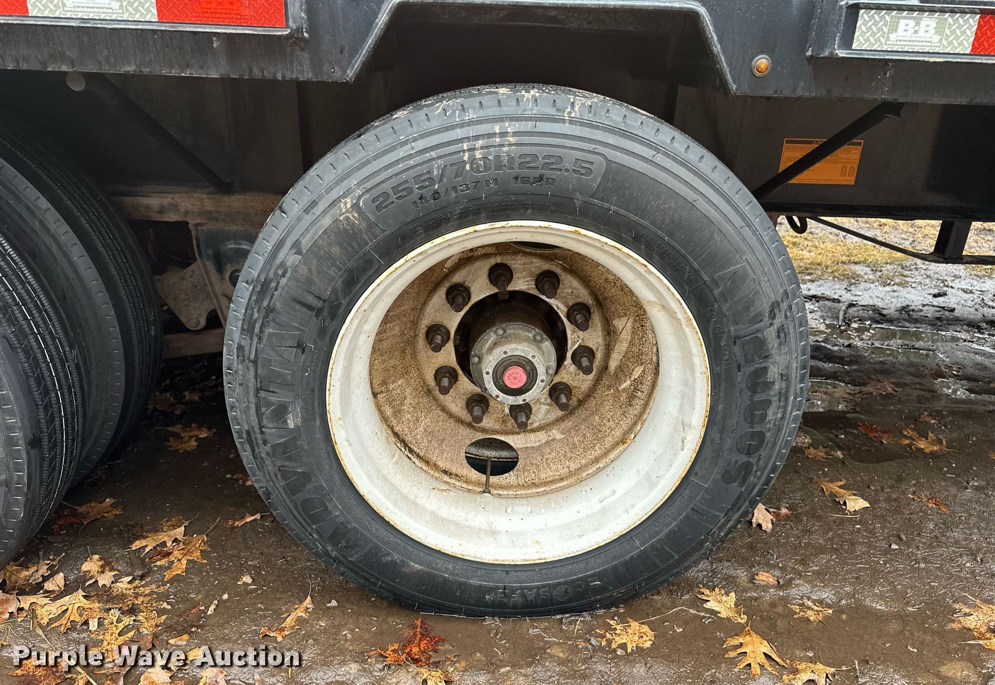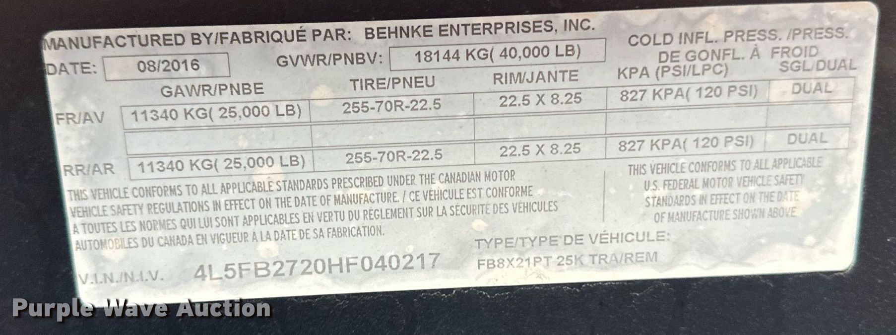 2017 Behnke Flatbed Trailer equipment trailer. VIN: 4L5FB2822HF040217. Dimensions Overall: 27' 8" L x 101" W, Deck: 16' L x 101" W, Deck height: 3' 4", Tail length: 6' 3", Ramps: Manual Length: 5' 6". Features Deck type: Wood. Chassis Hitch: Pintle, Landing gear: Dual, Suspension: Spring, Brakes: Air, Axles: Tandem, GVWR: 40,000 lbs. Tires Steel wheels, Size: 355/70R22.5. Notes Contents not included. Minnesota title. Title distribution may be delayed up to 14 days from verification of funds. River Falls, WI 54022
