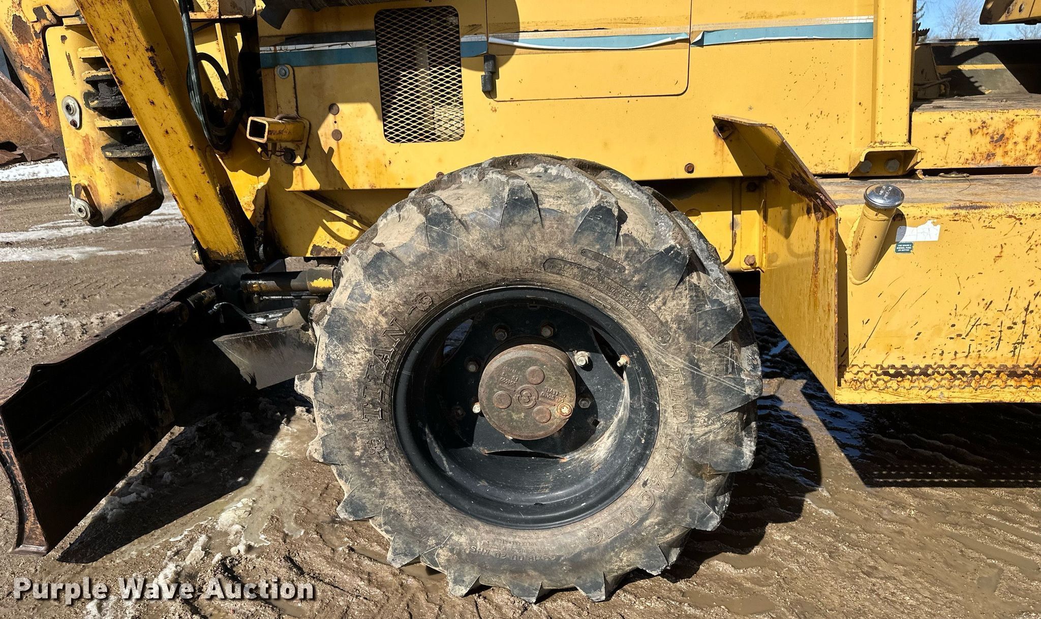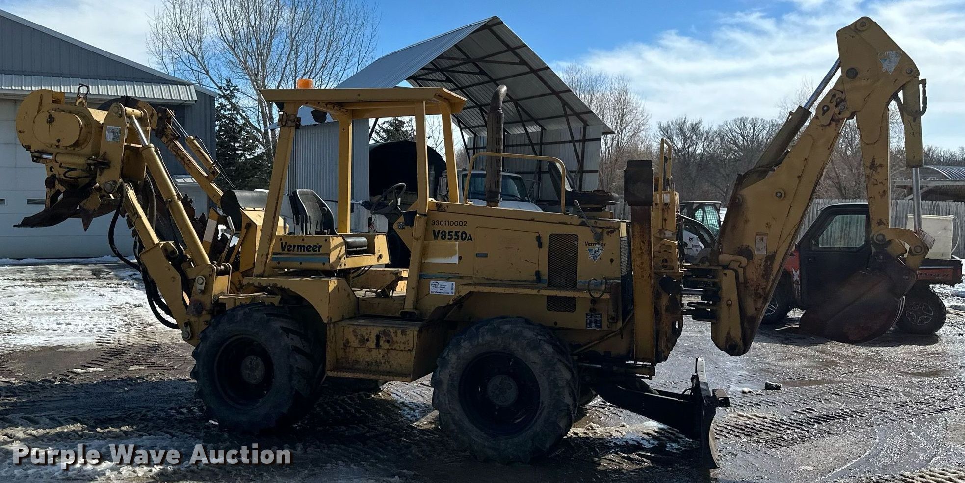 2001 Vermeer V8550A trencher. Hours: 740 on meter, Serial: 1VRT112P211000815. Engine Cummins, Cylinders: 4, Fuel type: Diesel. Transmission Hydrostatic, Four wheel drive, Four wheel steer. Operators station OROPS. Features Combination unit Model: PT550, Serial: 1VRS080B811000381, Trencher Model: Vermeer, Serial: VARS080B811000381, Estimated dig depth: 60", Vibratory plow Model: Vermeer, Backhoe Model: B930, Serial: 1VRS1005611000663, Bucket width: 18", Backfill blade Width: 83". Tires Size: 38x18.00-20. Notes Outrigger hydraulic cylinders leak. Jordan, MN 55352