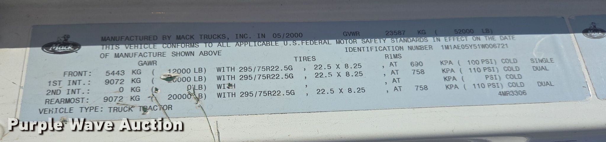 Purple Wave is selling a used Construction Dump Truck in Texas. This item is a 2001 Mack CX613 dump truck with the following: Miles: 781,640 on odometer, Hours: 30,134 on meter, VIN: 1M1AE05Y51W006721, Unit #: 25