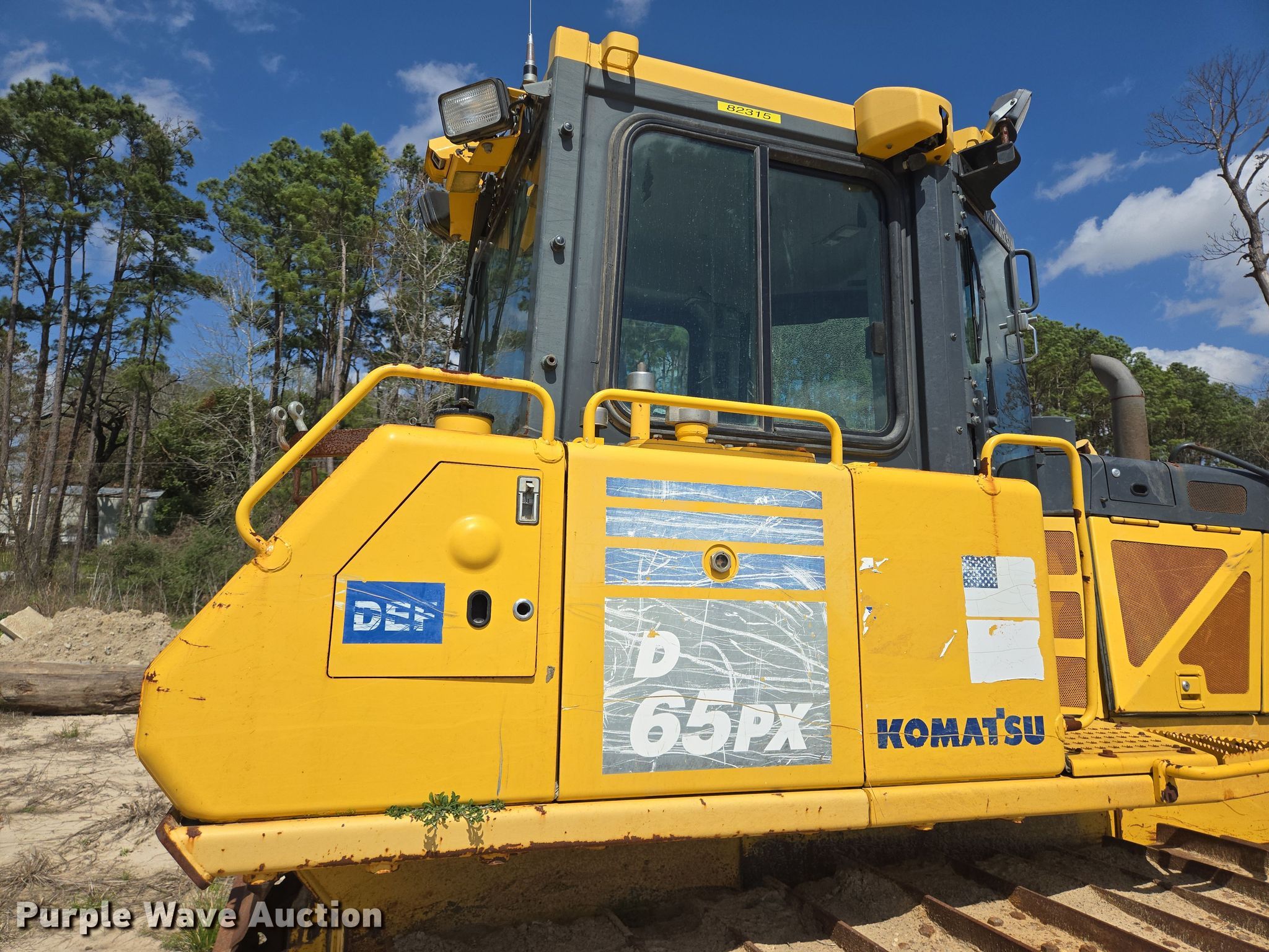 2017 Komatsu D65PX dozer. Hours: Unknown. Engine Komatsu SAA6D114E-6, Serial: 26905225, Displacement: 8.9L, Cylinders: 6, Fuel type: Diesel, HP: 220, kW: 164. Transmission Powershift. Operators station Enclosed cab, AC, Heat, Electronic Monitoring System panel, Steering: Joystick. Features Auxiliary hydraulics, Rear drawbar, Dozer blade Blade type: Single-tilt, Blade shape: Straight, Width: 153". Tracks Width: 36", Grouser pads: Single, Bottom rollers: 8. Notes Glass cracked, Wiring missing, Battery missing, Non-operational engine, blown , Non-operational transmission, locked up , Non-operational unit. Rasmussen Group. Porter, TX 77365
