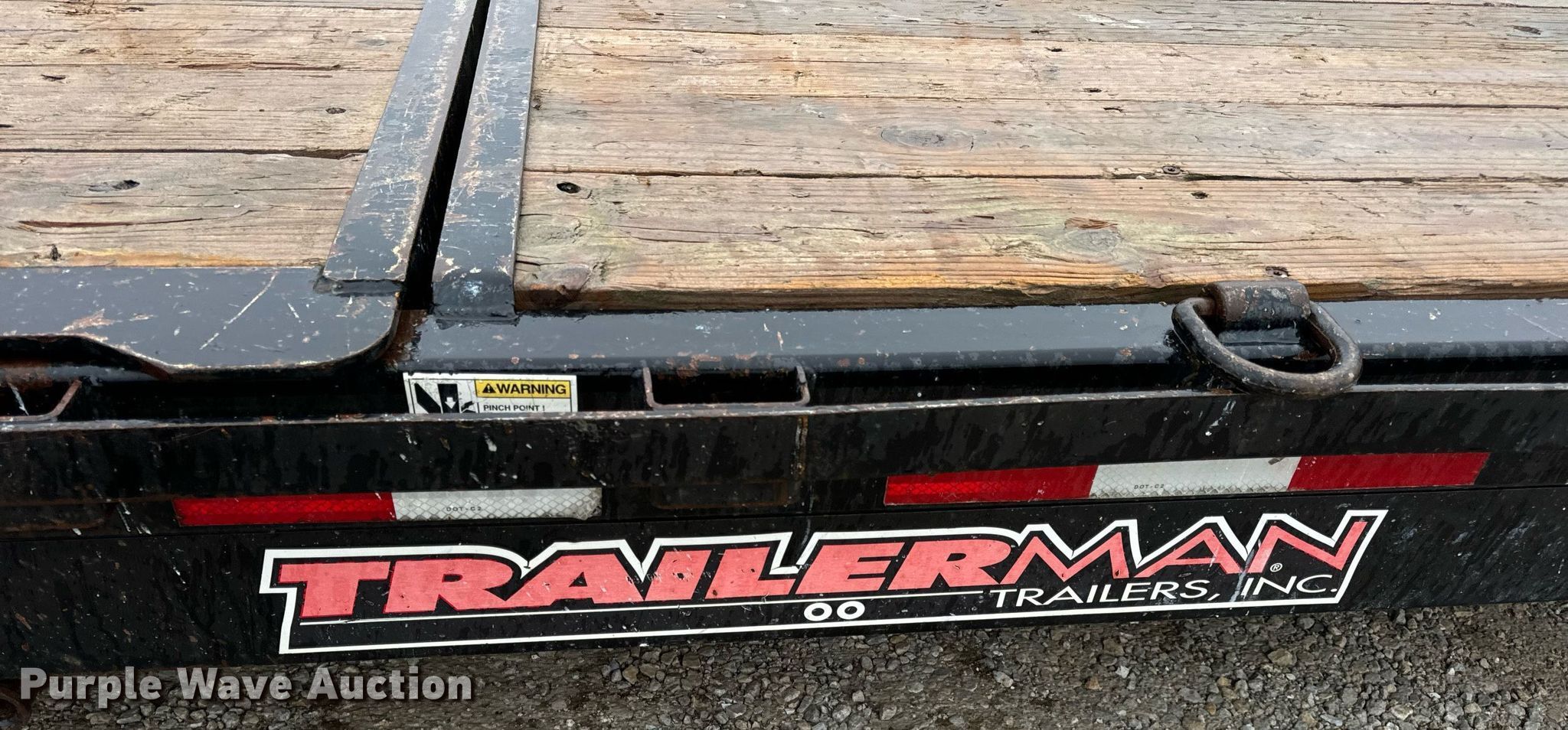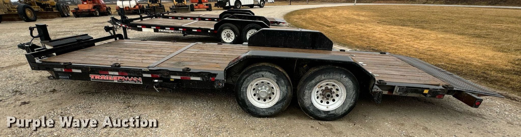 2017 Trailerman tilt deck equipment trailer. VIN: 5L3CX2222HL000964. Dimensions Overall: 27' 2" L x 102" W, Deck: 20' L x 83.5" W, Tail length: 24". Features Deck type: Wood. Chassis Ball hitch: 2 5/16", Landing gear: Single, Suspension: Spring, Brakes: Electric, Axles: Tandem, GVWR: 14,000 lbs, GAWR: 7,000 lbs. Tires Steel wheels, Size: ST235/80R16. Missouri title. Title has a lien that will be released following the close of the auction. Title distribution may be delayed up to 30 days from verification of funds. Hardy Holding Group. Boonville, MO 65233