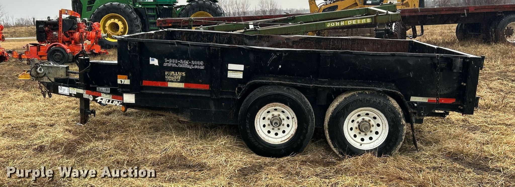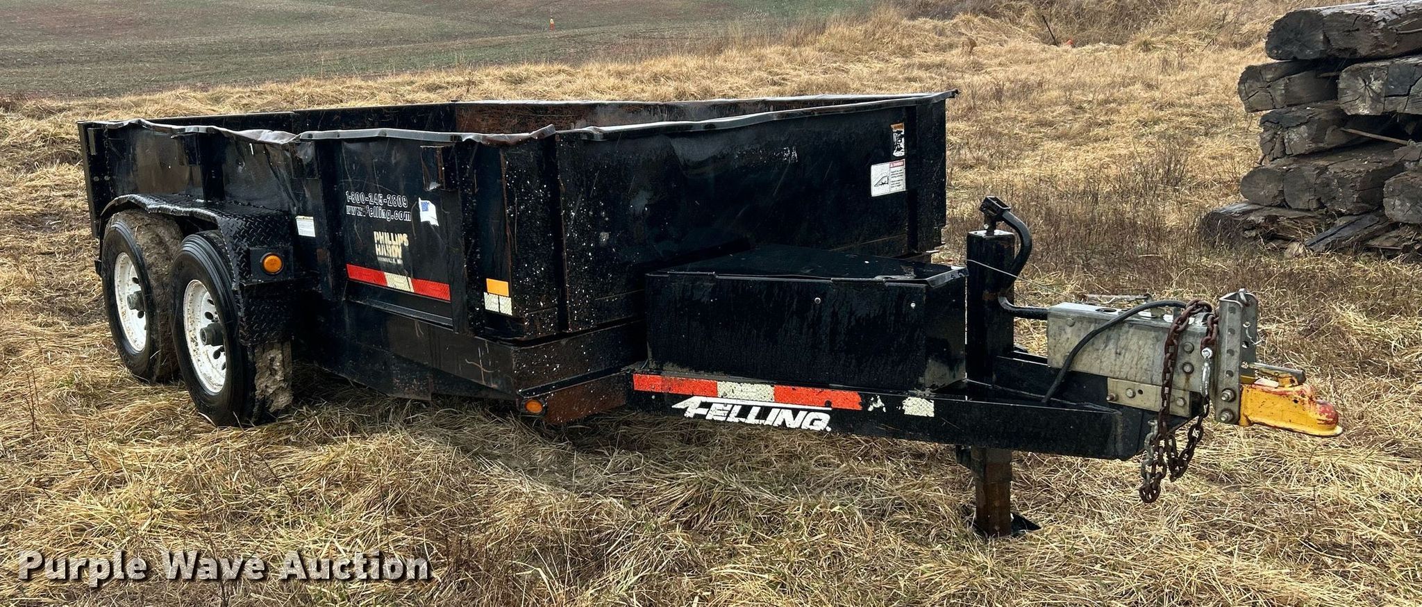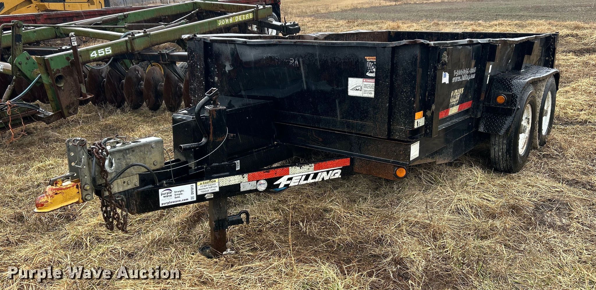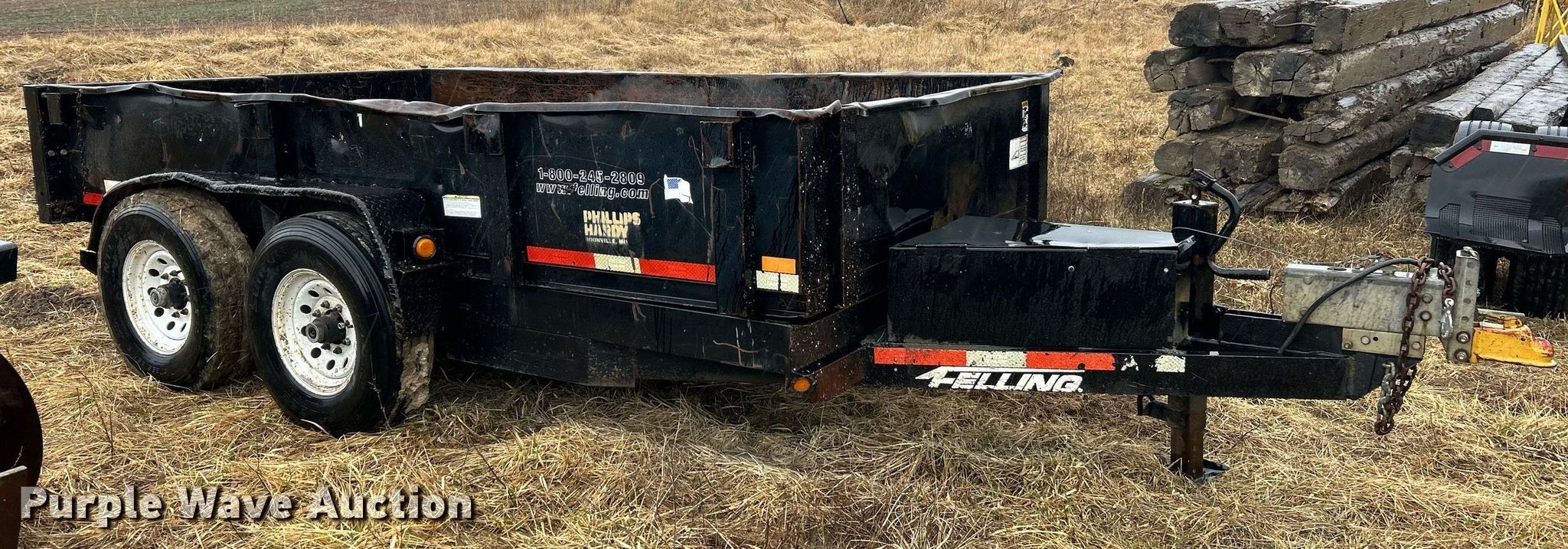 2012 Felling dump trailer. VIN: 5FTDH1221D1040835. Dimensions Overall: 18' L x 101" W, Body: 12' L x 80" W, Side height: 20". Features Body type: Steel, Ram: Single. Chassis Ball hitch: 2 5/16", Landing gear: Single, Brakes: Electric, Axles: Tandem, GVWR: 12,500 lbs, GAWR: 6,000 lbs. Tires Steel wheels, Size: 7.50R16LT. Missouri title. Title has a lien that will be released following the close of the auction. Title distribution may be delayed up to 30 days from verification of funds. Hardy Holding Group. Boonville, MO 65233