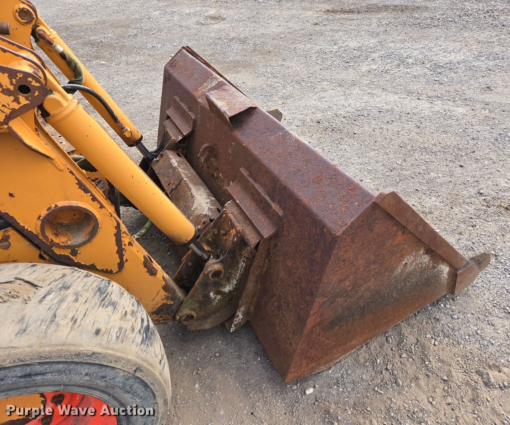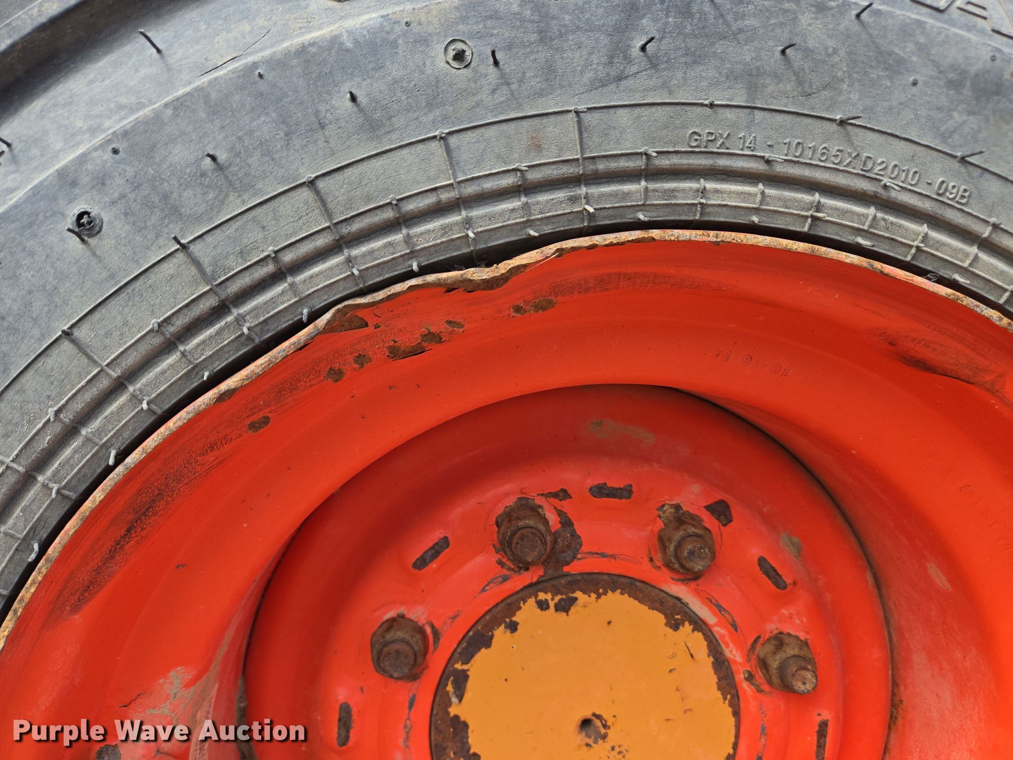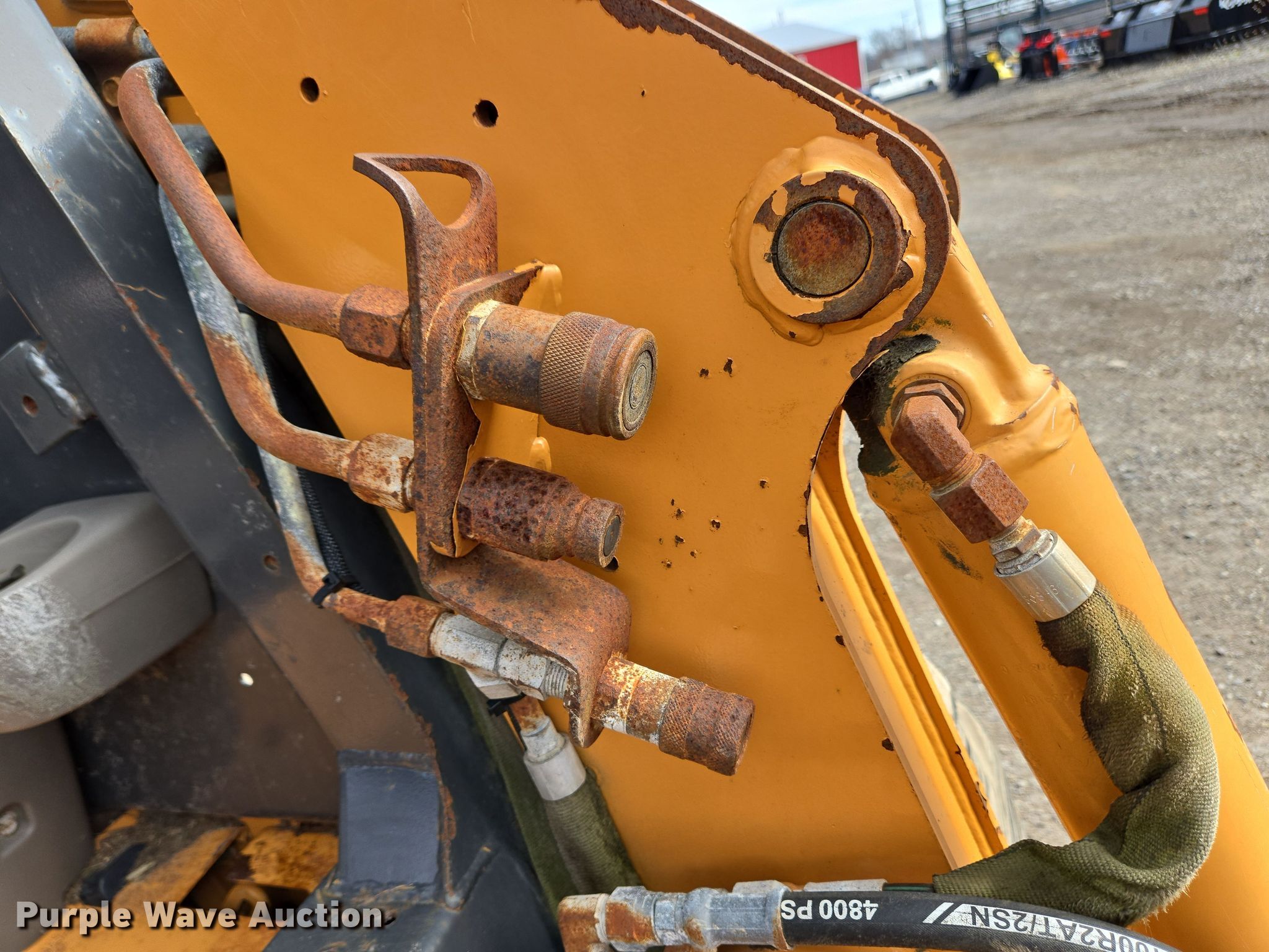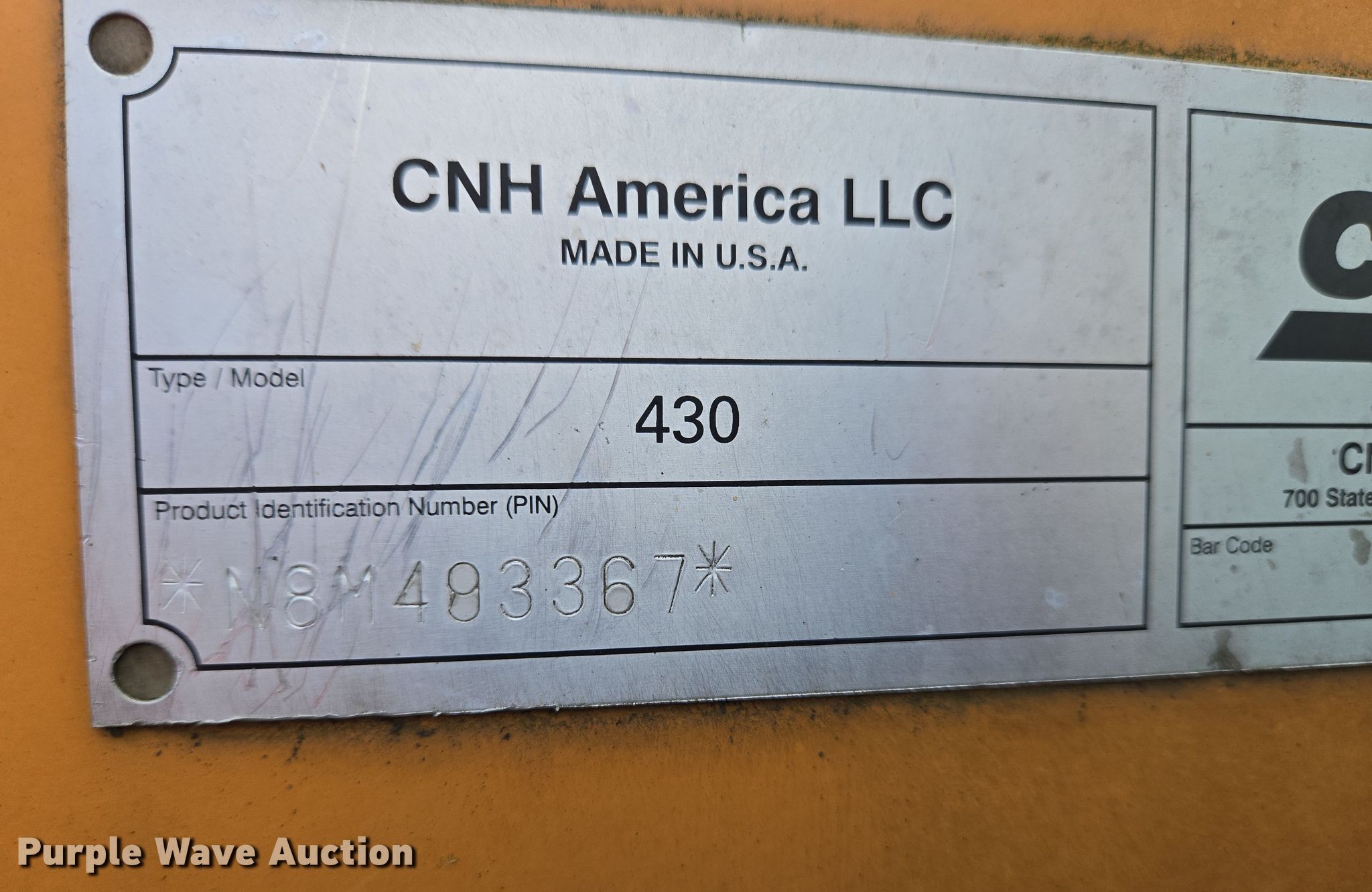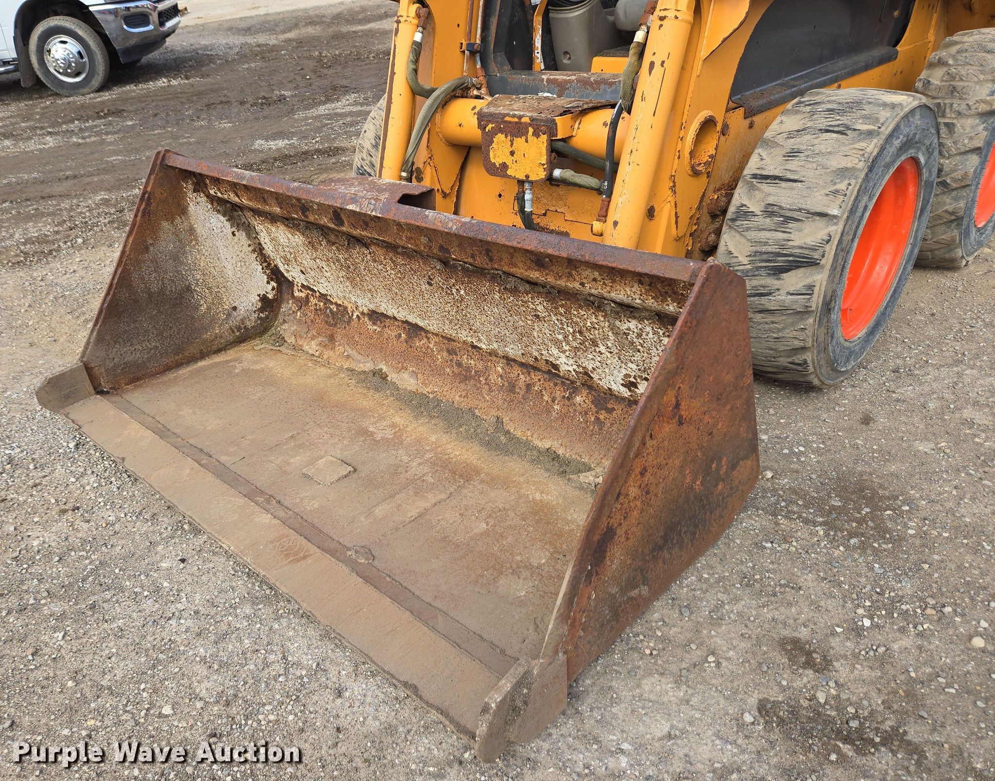 2008 Case 430 skid steer loader. Hours: 6,595 on meter, Serial: N8M493367. Engine Cylinders: 4, Fuel type: Diesel. Transmission Hydrostatic. Operators station Enclosed cab, Bucket control: Hand. Features Quick coupler: Hydraulic, Bucket Width: 66". Tires Size: 10-16.5. Notes Door missing, Possible hydraulic control issues, stiff, Non-operational bucket release, Bucket pin issues, heavy wear, Hydraulic tilt cylinder issues, leak, Front right tire issues, needs replaced. Sterling Farm Equipment. Wooster, OH 44691