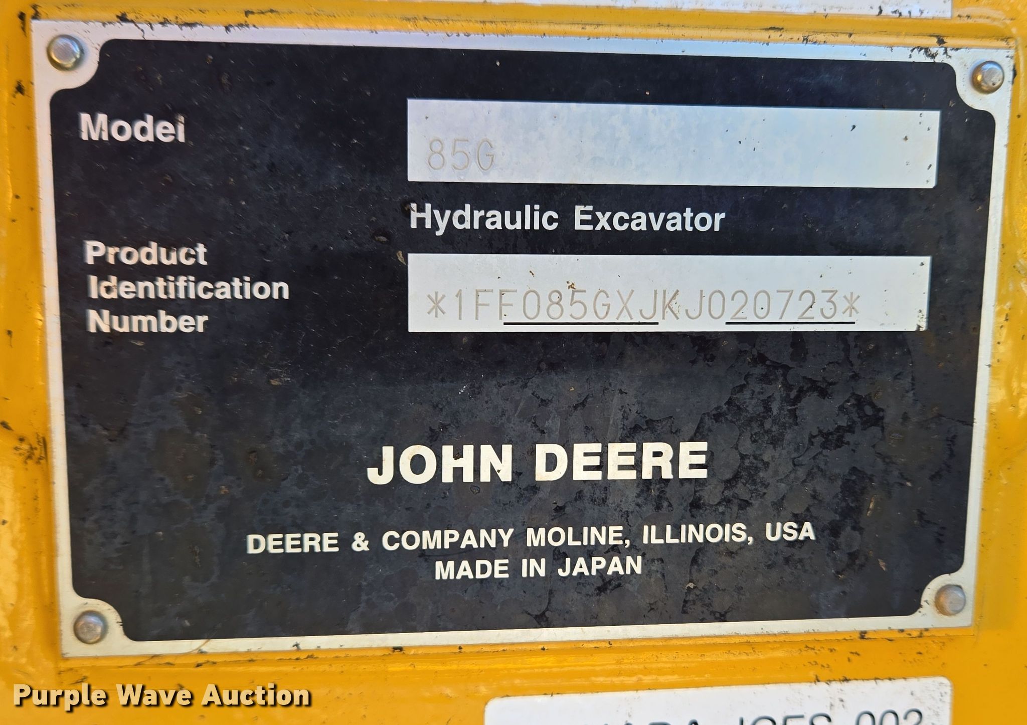 Purple Wave is selling a used Mini Excavator in Ohio. This item is a 2020 John Deere 85G mini excavator with the following: Hours: 3,269 on meter, Serial: 1FF085GXJKJ020723