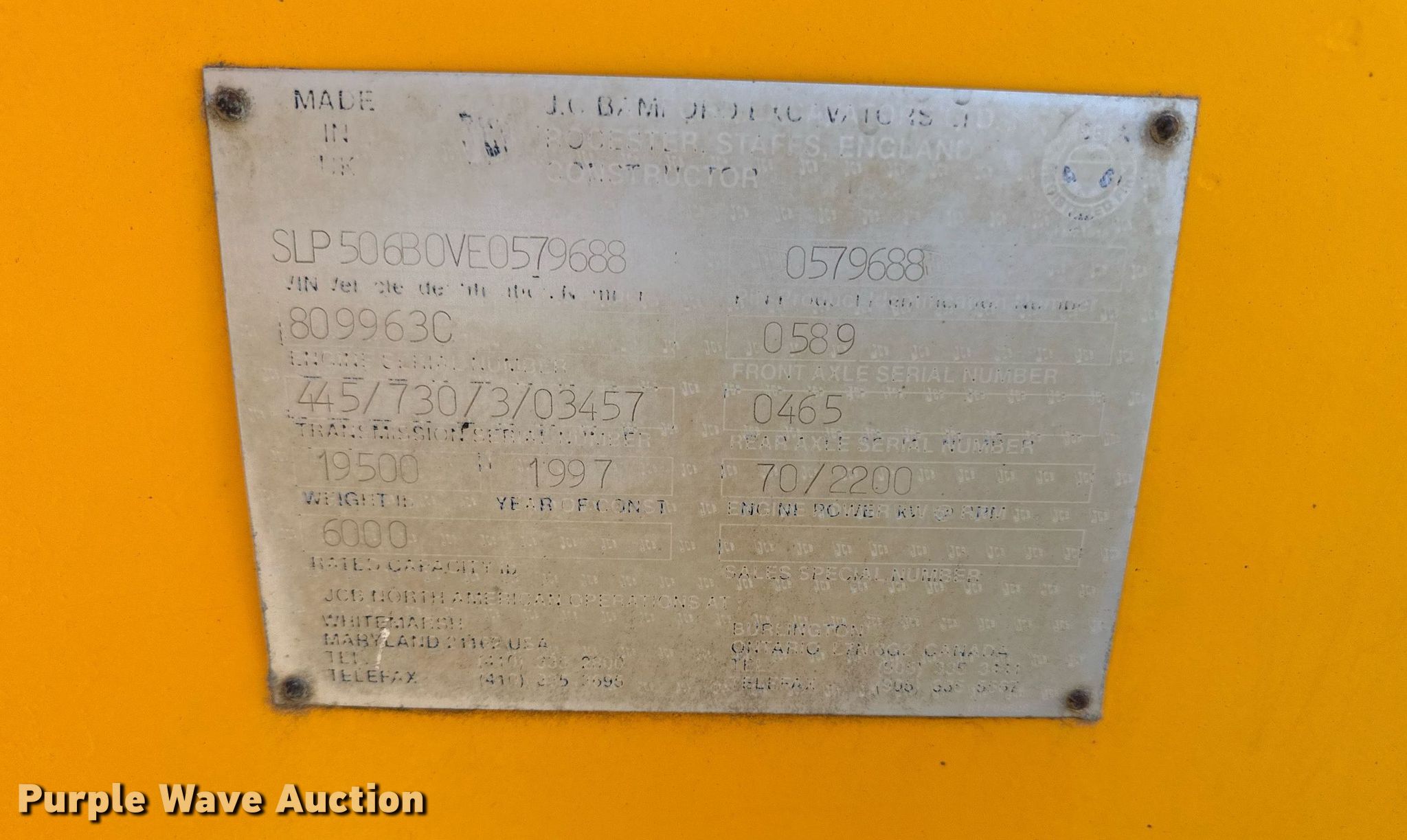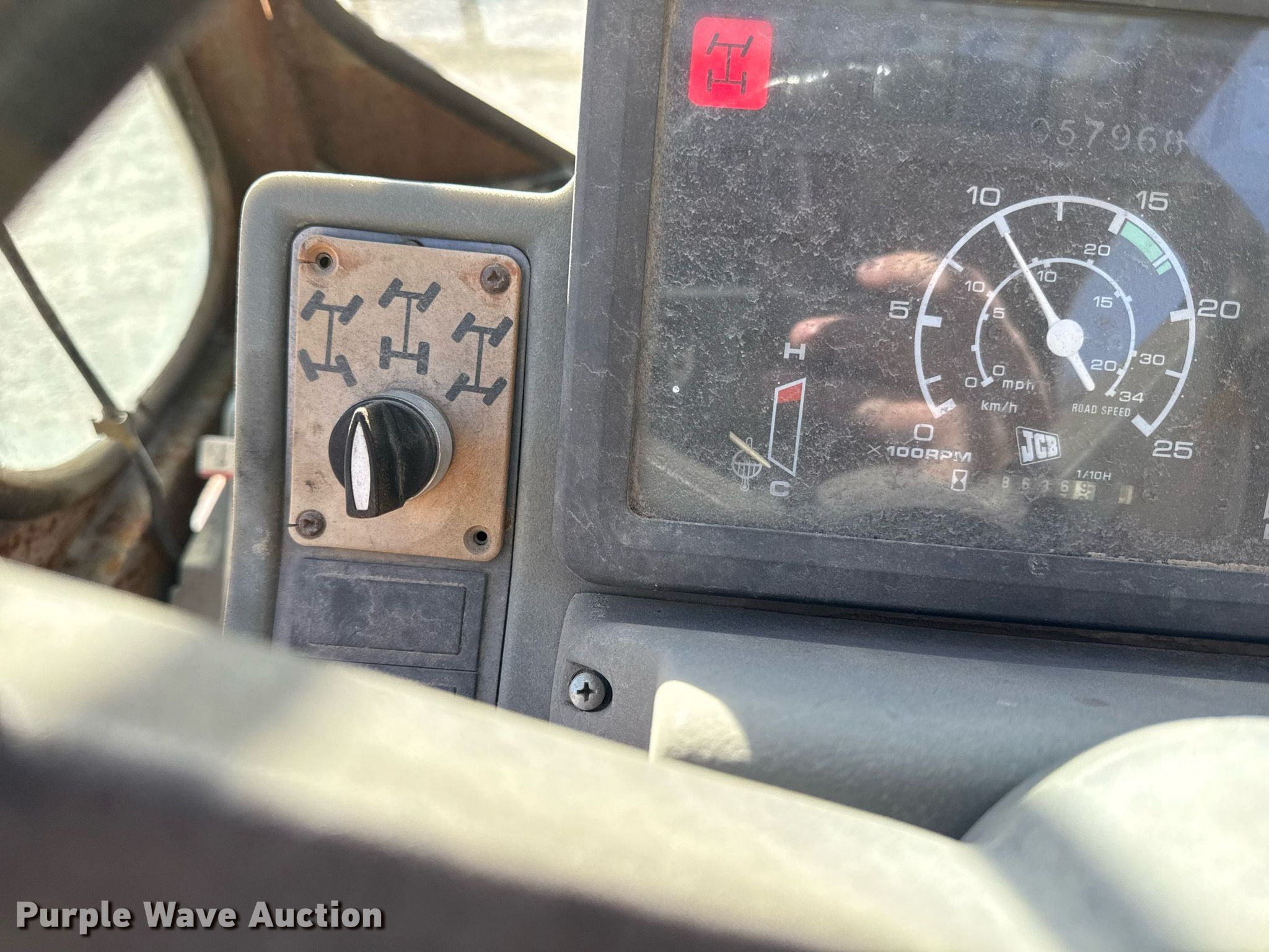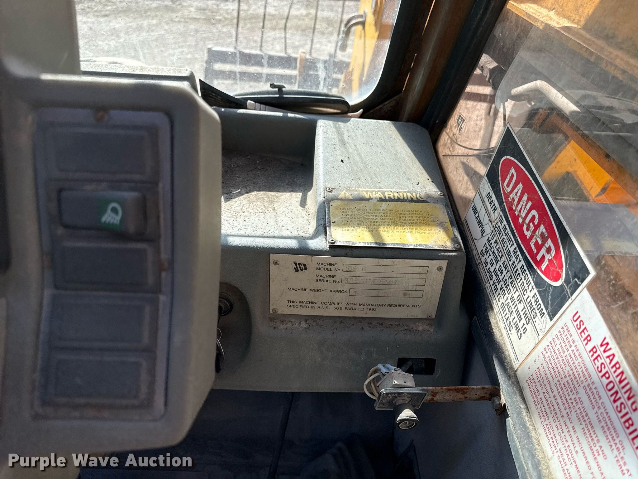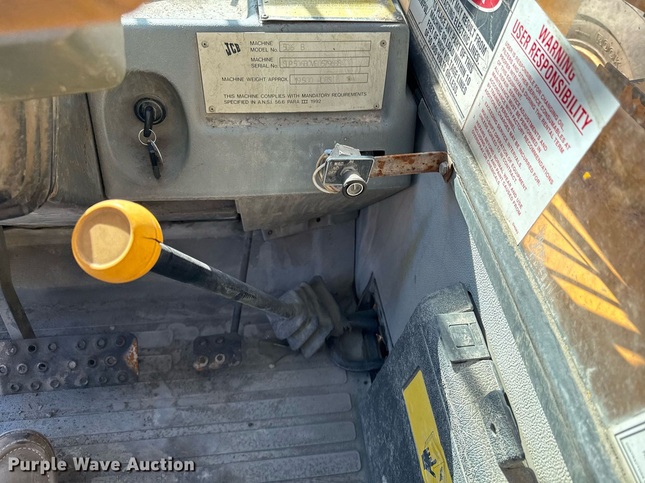 1997 JCB 506B telehandler. Hours: 8,637 on meter, Serial: 579688. Engine Cylinders: 4, Fuel type: Diesel. Transmission Shuttle shift, 4F - 4R, Four wheel drive. Operators station Enclosed cab, Steering: Crab, Four wheel. Features Maximum lift capacity: 6,000 lbs, Maximum lift height: 36', Boom stages: 3, Fork length: 47", Auxiliary hydraulics, Hydraulic leveling, Quick attach: Manual. Tires Size: 15.5-25, Foam filled. Kissick Construction Company. Kansas City, MO 64132