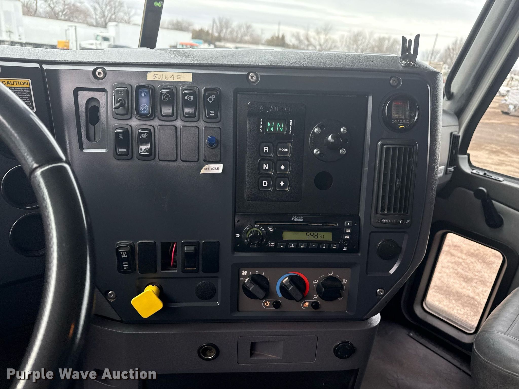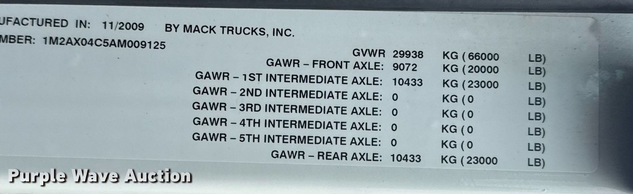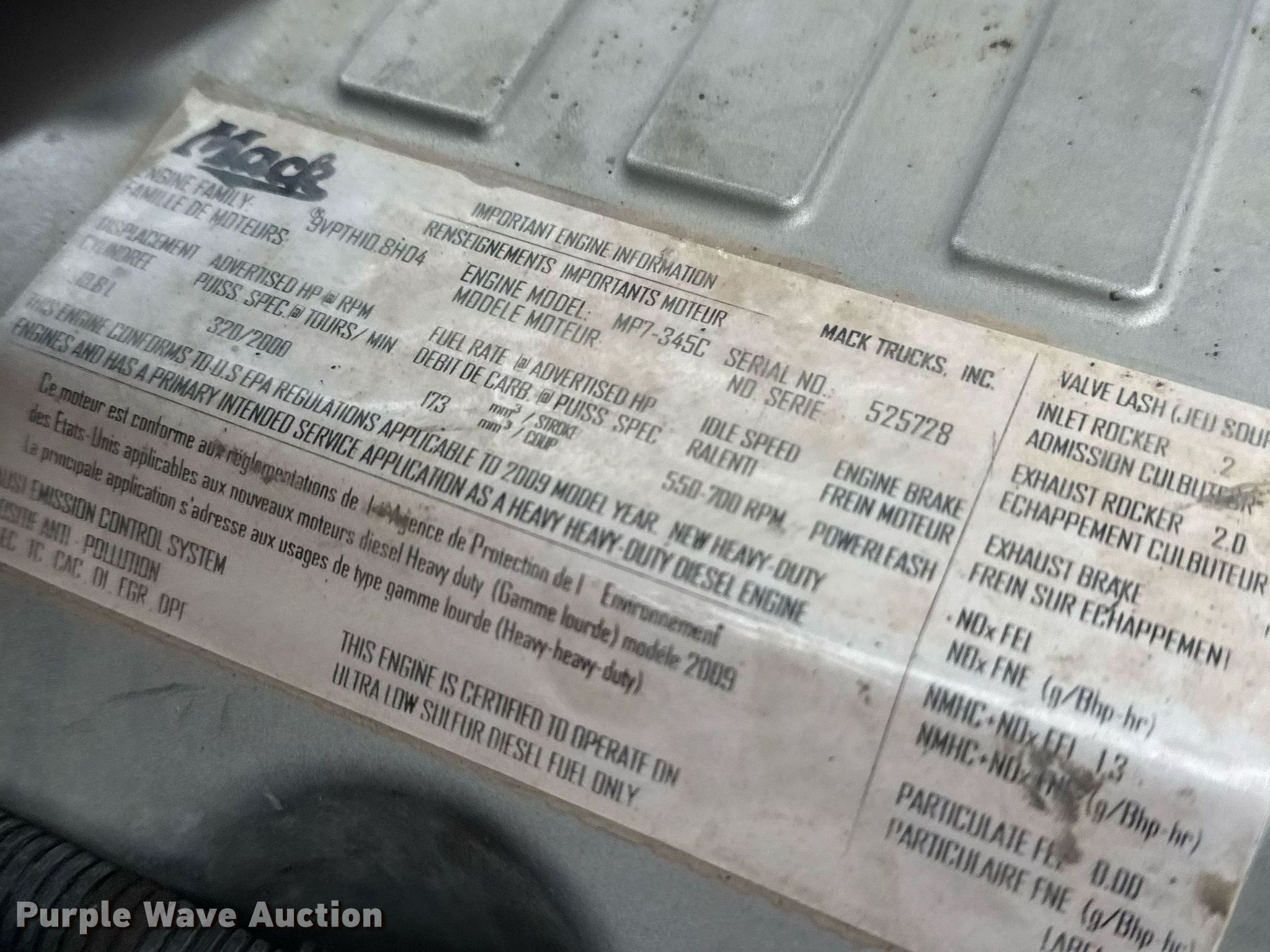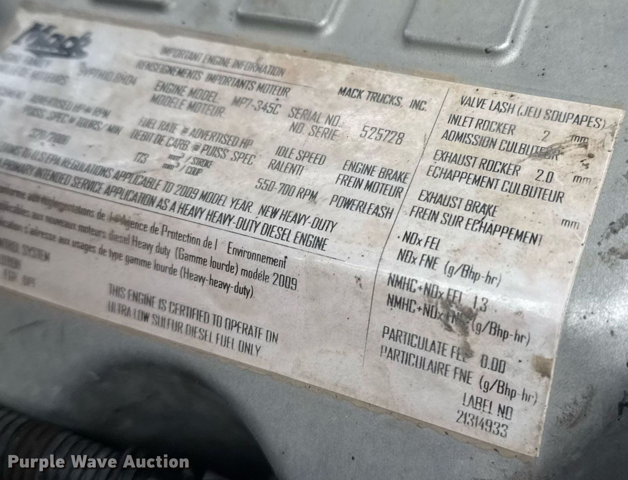 2010 Mack GU713 vacuum truck. Miles: 234,013 on odometer, Hours: 6 on meter, VIN: 1M2AX04C5AM009125. Engine Mack MP7, Serial: 525728, Displacement: 10.8L, Cylinders: 6, Fuel type: Diesel, HP: 320, Engine brake. Transmission Allison, Automatic. Chassis Axles: Triple, Pusher axle, Differential lock: Inter-axle, Suspension: Camelback, Brakes: Air, PTO, GVWR: 66,000 lbs. Interior AC, Heat, Heated mirrors, Cruise control. Features Tank bed 2010 Proco Inc PTMT, Serial: 23224, Top hatches: 2, Rear outlet: 5", Vacuum pump Masport. Tires Front: 425/65R22.5, Rear: 11R22.5, Lift axle: 256/70R22.5. Notes Dash warning indicator: Fault code. Oklahoma title. Seller is an Oklahoma licensed motor vehicle dealer. Title will be assigned and distributed by the dealer. Please contact the seller for distribution questions. Title distribution may be delayed up to 30 days from verification of funds. 15107 North 137th East Avenue. Collinsville, OK 74021